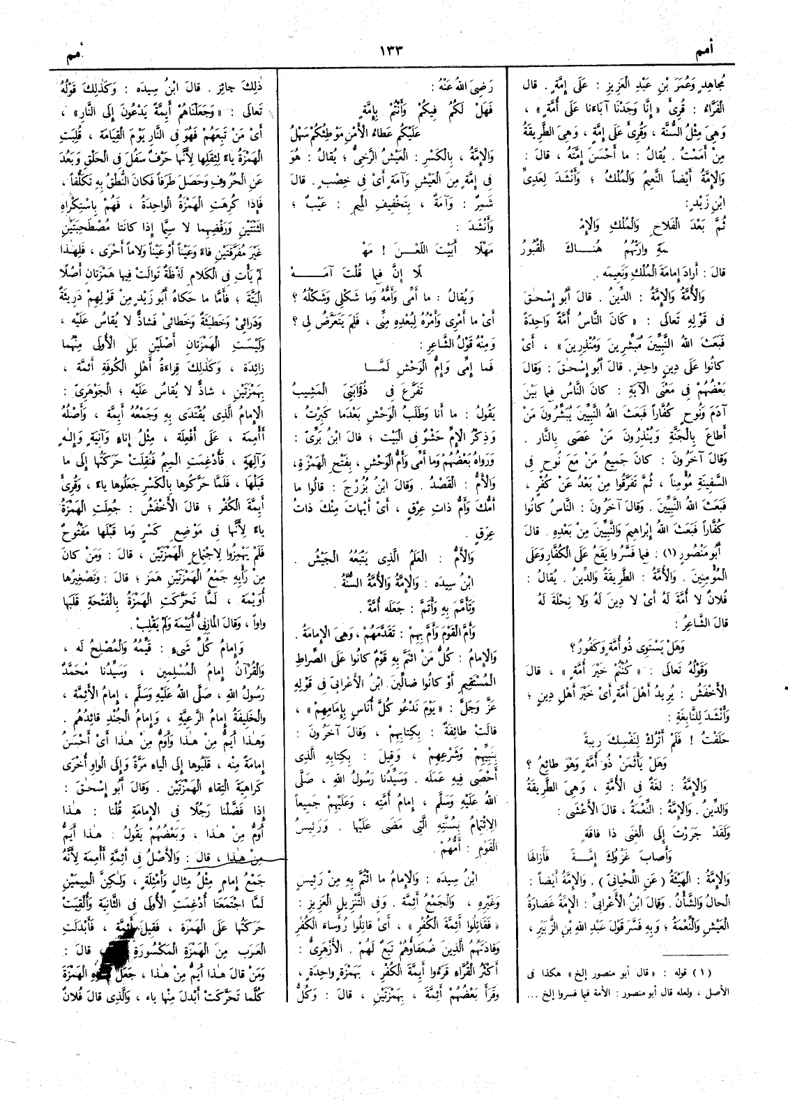 مجاهد وعمر بن عبد العزيز على إِمَّةٍ قال الفراء قرئ إِنَّا وَجَدْنا آباءَنا على أُمَّةٍ وهي مثل السُّنَّة وقرئ على إِمَّةٍ وهي الطريقة من أَمَمْت يقال ما أَحسن إِمَّتَهُ قال والإِمَّةُ أيضاً النَّعِيمُ والمُلك وأَنشد لعديّ بن زيد ثم بَعْدَ الفَلاح والمُلك والإِمْمَةِ وارَتْهُمُ هناك القُبورُ قال أَراد إِمامَة المُلك ونَعِيمه والأُمَّةُ والإِمَّةُ الدَّينُ قال أَبو إِسحق في قوله تعالى كان الناسُ أُمَّةً واحدةً فبعَث اللهُ النَّبِيِّين مُبَشِّرين ومُنْذِرين أي كانوا على دينٍ واحد قال أَبو إِسحق وقال بعضهم في معنى الآية كان الناس فيما بين آدم ونوح كُفّاراً فبعَث الله النبيِّين يُبَشِّرون من أَطاع بالجنة ويُِنْذِرون من عَصى بالنار وقال آخرون كان جميع مَن مع نوح في السفينة مؤمناً ثم تفرَّقوا من بعد عن كُفر فبعث الله النبيِّين وقال آخرون الناسُ كانوا كُفّاراً فبعث الله إبراهيم والنَّبيِّين من بعدهِ قال أَبو منصور