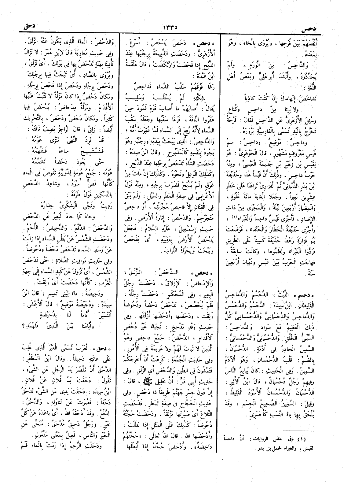 ( * وفي رواية أخرى أَنَّ داحساً لقيس والغبراء لحمل بن بدر ) وأَجرى حذيفة الخَطَّارَ والحَنْفاء فوضعت بنو فزارَة رَهْطُ حذيفة كَمِيناً على الطريق فردوا الغبراء ولَطَمُوها وكانت سابقة فهاجت الحرب بين عَبْس وذُبْيان أَربعين سنة ( دحسم ) الليث الدُّحْسُمُ والدُّماحِسُ الغليظان ابن سيده الدُّحْسُمُ والدُّحْمُسُ والدُّماحِس والدُّحْسُمانيُّ والدُّحْمُسانيُّ كل ذلك العظيم مع سواد الدُّماحِسُ السيِّء الخلق والدُّحْسُمانيُّ والدُّحْمُسانيُّ السمين الحادر في أُدْمةٍ الدُّحْسُمان بالضم قَلْبُ الدُّحْمُسانِ وهو الآدَمُ السمين وفي الحديث كان يُبايِعُ الناسَ وفيهم رجل دُحْسُمانٌ قال ابن الأَثير الدُّحْسُمانُ والدُّحْمُسانُ الأَسود الغليظ وقيل السمين الصحيح الجسم وقد يلحق بهما ياء النسب كأحْمَرِيٍّ ( دحص ) دَحَصَ يَدْحَصُ أَسرع الأَزهري ودَحَصَت الذبيحةُ بِرِجْلَيْها عند الذَّبْحِ إِذا فَحَصَتْ وارْتَكَضَتْ قال علقمة بن عبدة رَغا فَوقَهمْ سَقْبُ السماءِ فداحِصٌ بِشكّتِه لم يُسْتَلَبْ وسَلِيبُ يقال أَصابَهم ما أَصابَ قومَ ثمود حين عَقَرُوا الناقة فرَغَا سَقْبُها وجعَلَه سَقْبَ السماء لأَنه رُفِع إِلى السماءِ لما عُقِرَت أُمُّه والداحِصُ الذي يبحث بيديه ورجليه وهو يَجُود بنفسه كالمذبوح وقال ابن سيده دحَصَت الشاةُ تَدْحَصُ برِجْلِها عند الذبح وكذلك الوَعِل ونحوه وكذلك إِن مات من غَرَقٍ ولم يُذْبَحْ فَضَرَبَ برجله ومنه قول الأَعرابي في صِفَة المطر والسيل ولم يَبْقَ في القِنَان إِلا فاحِصٌ مُجْرَنْثِمٌ أَو داحِصٌ مُتَجَرْجِمٌ والدَّحْصُ إِثارةُ الأَرض وفي حديث إِسمعيل عليه السلام فَجَعل يَدْحَصُ الأَرضَ بِعَقِبَيْه أَي يَفْحَص ويَبْحَث ويُحَرِّك التراب