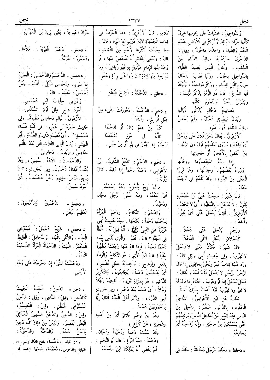 ( دحمل ) شيخ دَحْمَلٌ مُسْتَرْخي الجلد والأُنثى بالهاء والدُّحامِل الغَلِيظ المكتَنِز الليث الدَّحْمَلة المرأَة الضخمة التارَّة ودَحْمَلْت الشيءَ إِذا دحرجته على وجه الأَرض( دحن ) الدَّحِنُ الخَِبُّ الخبيث كالدَّحِل وقيل الداهي وقيل الدَّحِن المسترخي البطن وقيل العظيمة وقيل الدَّحِن والدِّحَنُّ السمين المندلق البطن القصير والفعل من ذلك كله دَحِن يَدْحَن دَحَناً والدِّحَنَّة والدِّحْوَنَّة