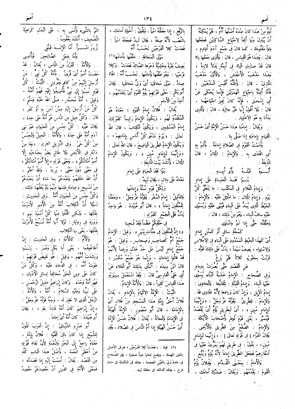 يصف بَقَرة وَحْشِية ذَعَرها الصائدُ فَعَدَتْ وكِلا فَرْجَيها وهو خَلْفُها وأَمامُها تَحْسِب أَنه الهاء عِمادٌ مَوْلَى مَخافَتِها أَي وَلِيُّ مَخافَتِها وقال أَبو بكر معنى قولهم يَؤُمُّ القَوْمَ أَي يَتَقَدَّمُهم أُخِذ من الأَمامِ يقال فُلانٌ إِمامُ القوم معناه هو المتقدّم لهم ويكون الإِمامُ رئِسياً كقولك إمامُ المسلمين ويكون الكتابَ قال الله تعالى يَوْمَ نَدْعُو كلَّ أُناسٍ بإِمامِهم ويكون الإِمامُ الطريقَ الواضحَ قال الله تعالى وإِنَّهما لَبِإِمامٍ مُبينٍ ويكون الإِمامُ المِثالَ وأَنشد بيت النابغة بَنَوْا مَجْدَ الحَياةِ على إِمامِ معناه على مِثال وقال لبيد ولكُلِّ قَوْمٍ سُنَّةٌ وإِمامُها والدليل إِمامُ السَّفْر وقوله عز وجل وجَعَلْنا للمُتَّقِين إِماماً قال أَبو عبيدة هو واحد يَدُلُّ على الجمع كقوله في حَلْقِكم عَظْماً وقد شُجِينا وإِنَّ المُتَّقِين في جَنَّات ونَهَرٍ وقل الإِمامُ جمع آمٍّ كصاحِبٍ وصِحابٍ وقيل هو جمع إِمامٍ ليس على حَدِّ عَدْلٍ ورِضاً لأَنهم قد قالوا إِمامان وإِنما هو جمع مُكَسَّر قال ابن سيده أَنْبأَني بذلك أَبو العَلاء عن أَبي علي الفارسي قال وقد استعمل سيبويه هذا القياسَ كثيراً قال والأُمَّةُ الإِمامُ الليث الإِمَّةُ الائتِمامُ بالإِمامِ يقال فُلانٌ أَحقُّ بإِمَّةِ هذا المسجد من فُلان أَي بالإِمامة قال أَبو منصور الإِمَّة الهَيْئةُ في الإِمامةِ والحالةُ يقال فلان حَسَن الإِمَّةِ أَي حَسَن الهَيْئة إِذا أَمَّ الناسَ في الصَّلاة وقد ائتَمَّ بالشيء وأْتَمَى به على البدَل كراهية التضعيف وأَنشد يعقوب نَزُورُ امْرأً أَمّا الإِلَه فَيَتَّقِي وأَمّا بفعلِ الصَّالحين فَيَأْتَمِي والأُمَّةُ القَرْن من الناس يقال قد مَضَتْ أُمَمٌ أَي قُرُونٌ وأُمَّةُ كل نبي مَن أُرسِل إِليهم من كافر ومؤمنٍ الليث كلُّ قوم نُسِبُوا إِلى نبيّ فأُضيفوا إِليه فَهُمْ أُمَّتُه وقيل أُمة محمد صلى الله عليهم وسلم كلُّ مَن أُرسِل إِليه مِمَّن آمَن به أَو كَفَر قال وكل جيل من الناس هم أُمَّةٌ على حِدَة وقال غيره كلُّ جِنس من الحيوان غير بني آدم أُمَّةٌ على حِدَة والأُمَّةُ الجِيلُ والجِنْسُ من كل حَيّ وفي التنزيل العزيز وما من دابَّةٍ في الأرض ولا طائرٍ يَطِيرُ بِجناحَيْه إلاَّ أُمَمٌ أَمثالُكم ومعنى قوله إلاَّ أُمَمٌ أمثالُكم في مَعْنىً دون مَعْنىً يُريدُ والله أعلم أن الله خَلَقَهم وتَعَبَّدَهُم بما شاء أن يَتَعَبَّدَهُم من تسْبيح وعِبادةٍ عَلِمها منهم ولم يُفَقِّهْنا ذلك وكل جنس من الحيوان أُمَّةٌ وفي الحديث لولا أنَّ الكِلاب أُمَّةٌ من الأُمَمِ لأَمَرْت بقَتْلِها ولكن اقْتُلوا منها كل أَسْوَد بَهيم وورد في رواية لولا أنها أُمَّةٌ تُسَبِّحُ لأَمَرْت بقَتْلِها يعني بها الكلاب والأُمُّ كالأُمَّةِ وفي الحديث إن أَطاعُوهما يعني أبا بكر وعمر رَشِدوا ورَشَدت أُمُّهم وقيل هو نَقِيضُ قولهم هَوَتْ أُمُّه في الدُّعاء عليه وكل مَن كان على دينِ الحَقِّ مُخالفاً لسائر الأَدْيان فهو أُمَّةٌ وحده وكان إبراهيمُ خليلُ الرحمن على نبينا وعليه السلام أُمَّةً والأُمَّةُ الرجل الذي لا نظِير له ومنه قوله عز وجل إن إبراهيم كان أُمَّةً قانِتاً لله وقال أبو عبيدة كان أُمَّةً أي إماماً أَبو عمرو الشَّيباني إن العرب تقول للشيخ إذا كان باقِيَ القوّة فلان بإِمَّةٍ معناه راجع إلى الخير والنِّعْمة لأن بَقاء قُوّتِه من أَعظم النِّعْمة وأصل هذا الباب كله من القَصْد يقال أَمَمْتُ إليه إذا قَصَدْته فمعنى الأُمَّة في الدِّينِ أَنَّ مَقْصِدَهم مقْصِد