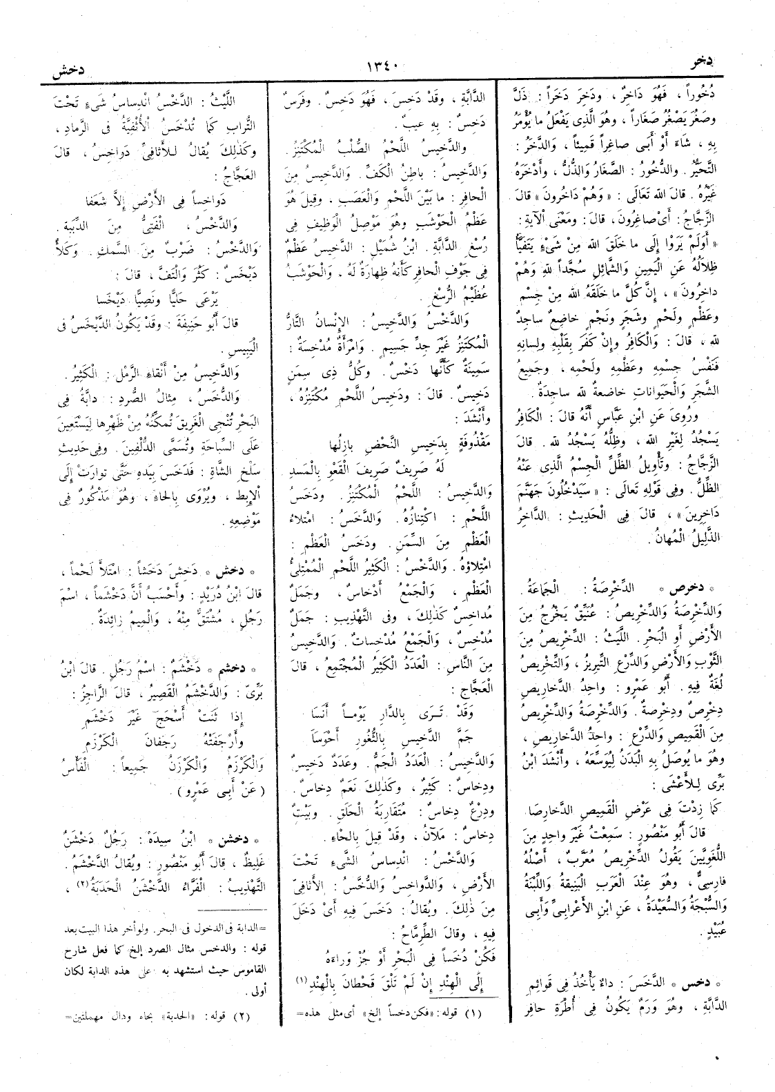 ( دخرص ) الدِّخْرِصةُ الجماعةُ والدِّخْرِصةُ والدِّخْرِيصُ عُنَيِّقٌ يخرج من الأَرض أَو البحر الليث الدِّخْرِيصُ من الثوب والأَرض والدرع التِّيرِيزُ والتِّخْرِيصُ لغةٌ فيه أَبو عمرو واحد الدَّخاريصِ دِخرِصٌ ودِخْرِصةٌ والدِّخْرِصةُ والدِّخْرِيصُ من القميص والدِّرْع واحدُ الدَّخارِيصِ وهو ما يُوصَل به البدَنُ ليُوَسِّعَه وأَنشد ابن بري للأَعشى كما زِدْت في عَرْض القَمِيص الدَّخارِصَا قال أَبو منصور سمعت غير واحد من اللغويين يقول الدِّخْرِيص معرّب أَصله فارسي وهو عند العرب البَنِيقةُ واللِّبْنةُ والسُّبْجَةُ والسُّعَيْدَة عن ابن الأَعرابي وأَبي عبيد ( دخس ) الدَّخَسُ داءٌ يأْخذ في قوائم الدابة وهو وَرَمٌ يكون في أُطْرَةِ حافر الدابة وقد دَخِسَ فهو دَخِسٌ وفرس دَخِسٌ به عيبٌ والدَّخِيسٌ اللحم الصُّلْبُ المُكْتَنِزُ والدَّخِيسُ باطن الكف والدَّخِيسُ من الحافر ما بين اللحم والعَصَب وقيل هو عظم الحَوْشَبِ وهو مَوْصِل الوَظِيفِ في رُسْغِ الدابة ابن شميل الدَّخِيسُ عظم في جوف الحافر كأَنه ظِهارَة له والحَوْشَبُ عُظَيْم الرسغ والدَّخْسُ والدَّخِيس الإِنسان التارُّ المكتنز غيرَ جدّ جسيمٍ وامرأَة مُدْخِسَةٌ سمينة كأَنها دَخْسٌ وكل ذي سِمَنٍ دَخِيسٌ قال ودَخِيسُ اللحم مُكْتَنِزه وأَنشد مَقْذُوفَةٍ بِدَّخِيسِ النَّحْضِ بازِلُها له صَريفٌ صَريفَ القَعْوِ بالمَسَدِ والدَّخِيسُ اللحم المكتنز ودَخَسُ اللحم اكتنازه والدَّخَسُ امتلاء العظم من السمن ودَخَسُ العظمِ امتلاؤه والدَّخْسُ الكثير اللحم الممتلئ العظم والجمع أَدْخاسٌ وجمل مُداخِسٌ كذلك وفي التهذيب جمل مُدْخِسٌ والجمع مُدْخِسات والدَّخِيسُ من الناس العَدَدُ الكثير المجتمع قال العجاجُ وقد تَرَى بالدار يوماً أَنَسا جَمَّ الدَّخِيسِ بالثُّغُور أَحْوَسا والدَّخِيسُ العدد الجَمُّ وعددٌ دَخِيسٌ ودِخاسٌ كثير وكذلك نَعَم دِخاسٌ ودِرْعٌ دِخاسٌ متقاربة الحَلَقِ وبيتٌ دِخاسٌ ملآنُ وقد قيل بالحاء والدَّخْسُ انْدِساسُ الشيء تحت الأَرض والدَّواخِسُ والدُّخَّسُ الأَثافي من ذلك ويقال دَخَسَ فيه أَي دخل فيه وقال الطِّرِمَّاحُ فكُنْ دُخَساً في البحرِ أَو جُزْ وَراءَهُ إِلى الهِنْدِ إِن لم تَلْقَ قَحْطانَ بالهِنْدِ