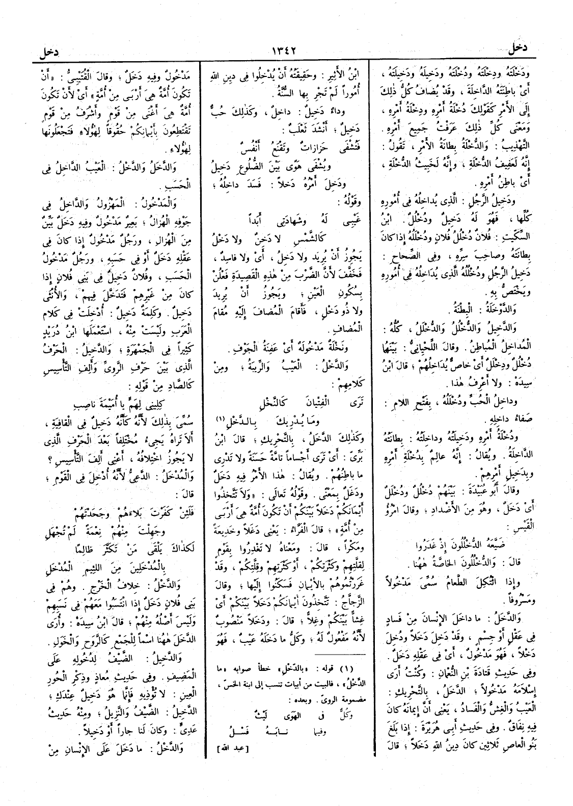 ودَخْلته ودِخْلته ودُخْلته ودَخيله ودَخِيلته أَي باطنته الدَّاخِلة وقد يضاف كل ذلك إِلى الأَمر كقولك دُخْلة أَمره ودِخْلة أَمره ومعنى كل ذلك عَرَفْت جميع أَمره التهذيب والدُّخْلة بطانة الأَمر تقول إِنه لعَفِيف الدُّخْلة وإِنه لخَبيث الدُّخْلة أَي باطن أَمره ودَخيلُ الرجل الذي يداخله في أُموره كلها فهو له دَخِيل ودُخْلُل ابن السكيت فلان دُخْلُل فلان ودُخْلَلُه إِذا كان بِطانتَه وصاحبَ سِرِّه وفي الصحاح دَخِيلُ الرّجُل ودُخْلُلُه الذي يُدَاخِله في أُموره ويختص به والدوخلة البطنة والدخِيل والدُّخْلُل والدُّخْلَل كله المُداخِل المباطن وقال اللحياني بينهما دُخْلُلٌ ودِخْلَلٌ أَي خاص يُدَاخِلُهم قال ابن سيده ولا أَعرف هذا وداخِلُ الحُبِّ ودُخْلَلُه بفتح اللام صفاء داخله ودُخْلَة أَمره ودَخِيلته وداخِلَته بِطانتُه الداخلة ويقال إِنه عالم بدُخْلة أَمره وبدَخِيل أَمرهم وقال أَبو عبيدة بينهم دُخْلُل ودُخْلَل أَي دَخَلٌ وهو من الأَضداد وقال امرؤ القيس ضَيَّعَه الدُّخْلُلون إِذ غَدَروا قال والدُّخْلُلون الخاصَّة ههنا وإِذا ائْتُكِلَ الطعام سُمِّي مدخولاً ومسروفاً والدَّخَل ما داخَل الإِنسانَ من فساد في عقل أَو جسم وقد دَخِلَ دَخَلاً ودُخِلَ دَخْلاً فهو مَدْخول أَي في عقله دَخَلٌ وفي حديث قتادة بن النعمان وكنت أَرى إِسْلامه مَدْخولاً الدَّخَل بالتحريك العيب والغِشُّ والفَساد يعني أَن إِيمانه كان فيه نِفَاق وفي حديث أَبي هريرة إِذا بَلَغ بنو العاص ثلاثين كان دِينُ الله دَخَلاً قال ابن الأَثير وحقيقته أَن يُدْخِلوا في دين الله أُموراً لم تَجْرِ بها السُّنَّة وداءٌ دَخِيل داخل وكذلك حُبٌّ دَخِيل أَنشد ثعلب فتُشْفَى حزازاتٌ وتَقْنَع أَنْفُسٌ ويُشْفَى هَوًى بين الضلوعِ دَخِيلُ ودَخِلَ أَمرُه دَخَلاً فسَدَ داخلُه وقوله غَيْبِي له وشهادتي أَبداً كالشمس لا دَخِنٌ ولا دَخْل يجوز أَن يريد ولا دَخِل أَي ولا فاسد فخفف لأَن الضرب من هذه القصيدة فَعْلن بسكون العين ويجوز أَن يريد ولا ذُو دَخْل فأَقام المضاف إِليه مُقام المضاف ونَخْلة مَدْخُولة أَي عَفِنة الجَوْف والدَّخْل العيب والرِّيبة ومن كلامهم تَرَى الفِتْيانَ كالنَّخْل وما يُدْريك بالدَّخْل وكذلك الدَّخَل بالتحريك قال ابن بري أَي ترى أَجساماً تامة حَسَنة ولا تدري ما باطنُهم ويقال هذا الأَمر فيه دَخَل ودَغَلٌ بمعنًى وقوله تعالى ولا تتخذوا أَيمانكم دَخَلاً بينكم أَن تكون أُمَّة هي أَرْبَى من أُمَّة قال الفراء يعني دَغَلاً وخَدِيعةً ومَكْراً قال ومعناه لا تَغْدِروا بقوم لقِلَّتهم وكثرتكم أَو كثرتهم وقِلَّتِكم وقد غَرَرْتُموهم بالأَيْمان فسَكَنوا إِليها وقال الزجاج تَتَّخِذون أَيمانكم دَخَلاً بينكم أَي غِشّاً بينكم وغِلاًّ قال ودَخَلاً منصوب لأَنه مفعول له وكل ما دَخَله عيب فهو مدخول وفيه دَخَلٌ وقال القتيبي أَن تكون أُمَّة هي أَرْبى من أُمَّة أَي لأَن تكون أُمَّة هي أَغْنى من قوم وأَشرف من قوم تَقْتَطعون بأَيمانكم حقوقاً لهؤلاء فتجعلونها لهؤلاء والدَّخَل والدَّخْل العيب الداخل في الحَسَب والمَدْخول المهزول والداخل في جوفه الهُزال بعير مدخول وفيه دَخَلٌ بَيِّن من الهُزال ورجل مدخول إِذا كان في عقله دَخَلٌ أَو في حَسَبه ورجل مدخول الحَسَب وفلان دَخِيل في بني فلان إِذا كان من غيرهم فتَدخَّل فيهم والأُنثى دَخِيل وكلمة دَخِيل أُدْخِلت في كلام العرب وليست منه استعملها ابن دريد كثيراً في الجمهرة والدَّخِيل الحرف الذي بين حرف الرَّوِيّ وأَلف التأْسيس كالصاد من قوله كِلِيني لِهَمٍّ يا أُمَيْمة ناصب سُمِّي بذلك لأَنه كأَنه دَخِيل في القافية أَلا تراه يجيء مختلفاً بعد الحرف الذي لا يجوز اختلافه أَعني أَلف التأْسيس ؟ والمُدْخَل الدَّعِيُّ لأَنه أُدْخِل في القوم قال فلئِن كَفرْتَ بلاءهم وجَحَدْتَهم وجَهِلْتَ منهم نِعْمةً لم تُجْهَل لَكذاك يَلْقى مَنْ تكَثَّر ظالماً بالمُدْخَلين من الل