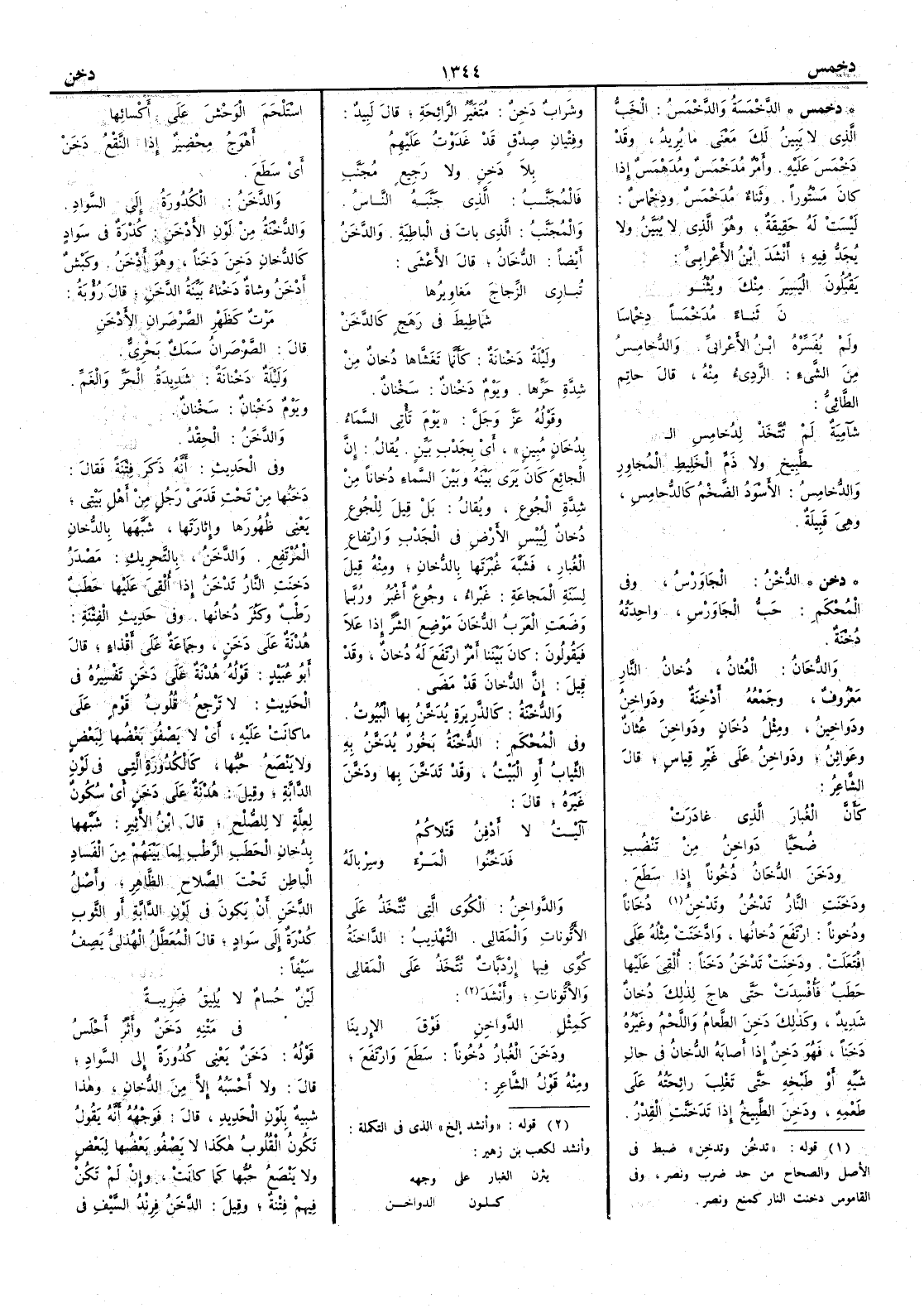 ( * قوله « تدخن وتدخن » ضبط في الأَصل والصحاح من حد ضرب ونصر وفي القاموس دخنت النار كمنع ونصر ) دُخاناً ودُخُوناً ارتفع دُخانها وادَّخَنت مثله على افْتَعلت ودَخِنَت تَدْخَن دَخَناً أُلقِي عليها حطب فأُفْسِدت حتى هاج لذلك دُخان شديد وكذلك دَخِن الطعامُ واللحم وغيره دَخَناً فهو دَخِن إذا أَصابه الدخان في حال شَيّه أَو طبخه حتى تَغْلبَ رائحتُه على طعمه ودَخِن الطبيخ إذا تَدخّنت القدر وشراب دَخِن متغير الرائحة قال لبيد وفِتْيان صِدْقٍ قد غَدَوْتُ عليهِمُ بلا دَخِن ولا رَجِيع مُجَنَّبِ فالمُجَنَّب الذي جَنَّبَه الناس والمُجَنَّب الذي بات في الباطية والدَّخَن أَيضاً الدُّخان قال الأَعشى تُبارِي الزِّجاجَ مغاويرها شَماطِيط في رهَج كالدَّخَن وليلة دَخْنانة كأَنما تَغَشّاها دُخان من شدّة حَرّها ويوم دَخْنان سَخْنان وقوله عز وجل يوم تأْتي السماء بدُخان مبين أَي بِجَدْب بَيّن يقال إن الجائعَ كان يَرَى بينه وبين السماء دخاناً من شدّة الجوع ويقال بل قيل للجوع دُخان ليُبْس الأَرض في الجَدْب وارتفاع الغُبار فشبه غُبْرتها بالدخان ومنه قيل لسنة المَجاعة غَبْراء وجوع أَغْبَر وربما وضعت العرب الدُّخان موضع الشرّ إذا علا فيقولون كان بيننا أَمر ارْتفَعَ له دخان وقد قيل إن الدخان قد مضى والدُّخْنة كالذَّريرة يُدخَّن بها البيوتُ وفي المحكم الدُّخنة بَخُور يُدَخَّن به الثيابُ أَو البيت وقد تَدَخَّن بها ودَخَّن غيرَه قال آلَيْت لا أَدْفِن قَتْلاكُمُ فَدَخِّنوا المَرْءَ وسِرْباله والدَّواخِن الكُوَى التي تتخذ على الأَتُّونات والمَقالِي التهذيب الداخِنة كُوىً فيها إِرْدَبَّات تتخذ على المقالي والأَتُّونات وأَنشد