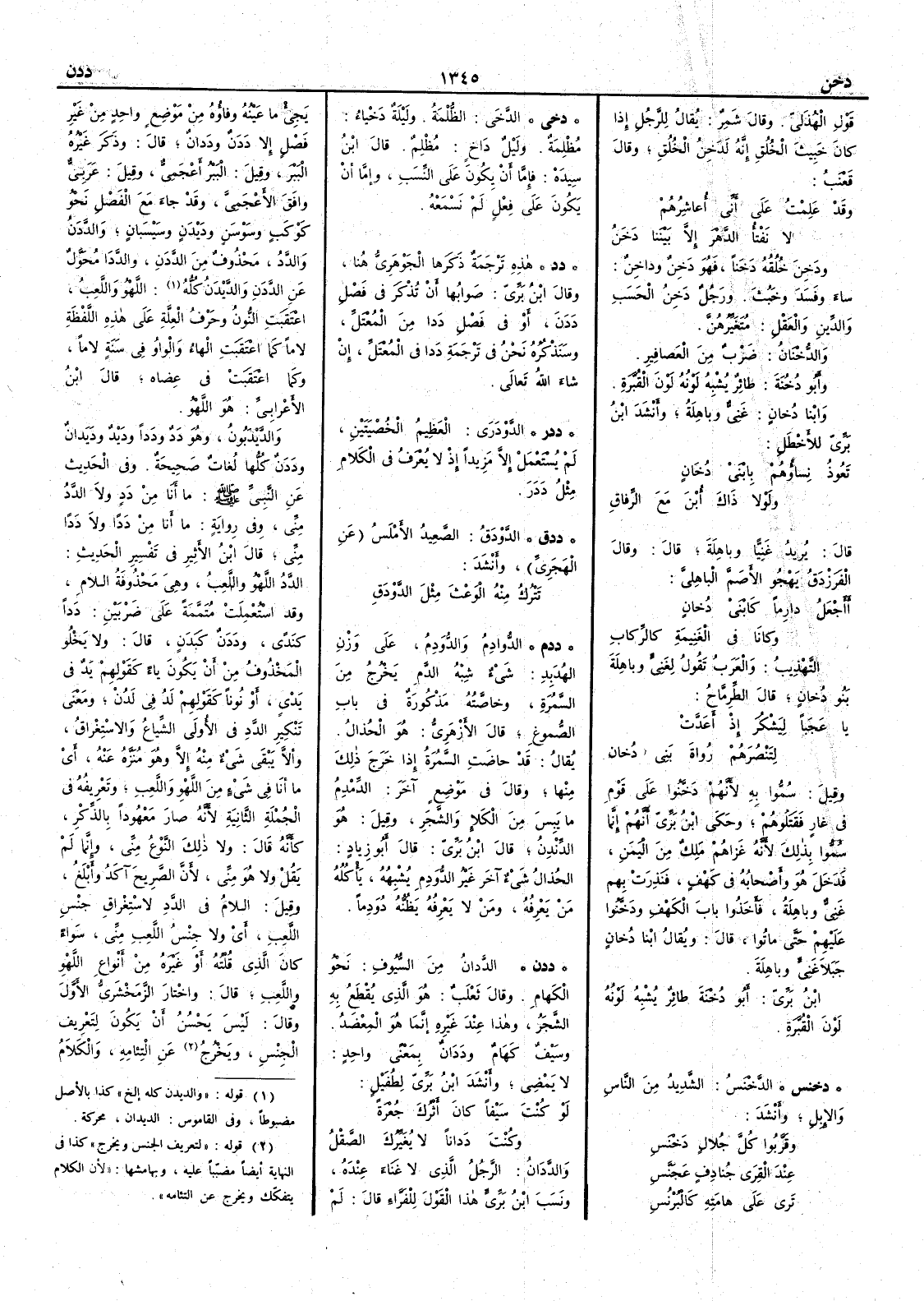 ( * قوله « والديدان كله إلخ » كذا بالأصل مضبوطاً وفي القاموس الديدان محركة ) اللَّهْو واللعب اعْتَقَبت النونُ وحرفُ العلة على هذه اللفظة لاماً كما اعتقبت الهاء والواو في سنة لاماً وكما اعتقبت في عِضاه قال ابن الأَعرابي هو اللهو والدَّيْدَبُون وهو ددٌ ودَداً ودَيْدٌ ودَيَدانٌ ودَدَنٌ كلها لغاتٌ صحيحة وفي الحديث عن النبي صلى الله عليه وسلم ما أَنا من ددٍ ولا الدَّدُ منِّي وفي رواية ما أَنا من دَداً ولا دَداً منِّي قال ابن الأَثير في تفسير الحديث الدَّدُ اللهو واللعب وهي محذوفة اللام وقد استعملت مُتَمَّمَة على ضربين دَداً كنَدىً ودَدَن كبَدَن قال ولا يخلو المحذوف من أَن يكون ياءَ كقولهم يد في يَدْيٍ أَو نوناً كقولهم لَدُ في لَدُنْ ومعنى تنكير الدَّدَ في الأُولى الشِّياعُ والاستغراقُ وأَن لا يبقى شيءٌ منه إِلاّ وهو منزَّه عنه أَي ما أَنا في شيءٍ من اللهو واللعب وتعريفُه في الجملة الثانية لأَنه صار معهوداً بالذكر كأَنه قال ولا ذلك النوعُ منِّي وإنما لم يقُل ولا هو منِّي لأَنَّ الصريح آكَدُ وأَبلغ وقيل اللام في الدَّدِ لاستغراق جنس اللعب أَي ولا جنس اللعب مني سواءً كان الذي قلته أَو غيرَه من أَنواع اللهوِ واللعب قال واختار الزمخشري الأَول وقال ليس يَحْسُن أَن يكون لتعريف الجنس ويخرج عن التئامه والكلام