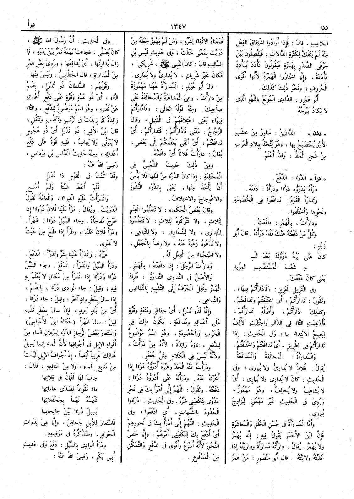 يعني كان دَفْعُكَ وفي التنزيل العزيز « فادّارَأْتُم فيها » وتقول تَدارأْتم أَي اخْتَلَفْتُم وتَدَافَعْتُم وكذلك ادّارَأْتُمْ وأَصله تَدارَأْتُمْ فأُدْغِمت التاءُ في الدال واجتُلِبت الأَلف ليصح الابتداءُ بها وفي الحديث إِذا تَدارَأْتُمْ في الطَّرِيق أَي تَدافَعْتم واخْتَلَفْتُمْ والمُدارَأَةُ المُخالفةُ والمُدافَعَةُ يقال فلان لا يُدارِئُ ولا يُمارِي وفي الحديث كان لا يُدارِي ولا يُمارِي أَي لا يُشاغِبُ ولا يُخالِفُ وهو مهموز وروي في الحديث غير مهموز ليُزاوِجَ يُمارِي وأَما المُدارأَة في حُسْنِ الخُلُق والمُعاشَرة فإِن ابن الأَحمر يقول فيه انه يهمز ولا يهمز يقال دارَأْتُه مدارأَةً ودارَيْتُه إِذا اتَّقيتَه ولايَنْتَه قال أَبو منصور من همز فمعناه الاتّقاءُ لشَرِّه ومن لم يهمز جعله من دَرَيْتُ بمعنى خَتَلْتُ وفي حديث قيس بن السائب قال كان النبي صلى اللّه عليه وسلم شَرِيكي فكانَ خَيْرَ شَرِيكٍ لا يُدارِئُ ولا يُمارِي قال أَبو عبيد المُدارأَةُ ههنا مهموزة من دارَأْتُ وهي المُشاغَبةُ والمُخالَفةُ على صاحبك ومنه قوله تعالى فادَّارَأْتُم فيها يعني اختلافَهم في القَتِيل وقال الزجاج معنى فادَّارَأْتُم فتَدارأْتُم أَي تَدافَعْتُم أَي أَلقَى بعضُكم إِلى بعضٍ يقال دارَأْتُ فلاناً أَي دافَعْتُه ومن ذلك حديث الشعبي في المختلعةِ إِذا كان الدَّرْءُ من قِبَلِها فلا بأْس أَن يأْخذ منها يعني بالدَّرْءِ النُّشوزَ والاعْوِجاجَ والاختِلافَ وقال بعض الحكماء لا تَتعلَّموا العِلْم لثلاث ولا تَتْرُكوه لِثلاثٍ لا تَتعلَّموه للتَّدارِي ولا للتَّمارِي ولا للتَّباهِي ولا تَدَعُوه رَغبْةً عنه ولا رِضاً بالجَهْلِ ولا اسْتِحْياءً من الفِعل له ودارَأْتُ الرَّجُل إِذا دافَعْته بالهمز والأَصل في التَّدارِي التَّدارُؤُ فتُرِكَ الهَمز ونُقِلَ الحرف إِلى التشبيه بالتَّقاضِي والتَّداعِي [ ص 72 ] وإِنه لَذُو تُدْرَإِ أَي حِفاظٍ ومَنَعةٍ وقُوَّةٍ على أَعْدائه ومُدافَعةٍ يكون ذلك في الحَرْب والخُصومة وهو اسم موضوع للدَّفْع تاؤهُ زائدة لأَنه من دَرَأْتُ ولأَنه ليس في الكلام مثل جُعْفَرٍ ودرأْتُ عنه الحَدَّ وغيرَه أَدْرَؤُهُ دَرْءاً إِذا أَخَّرْته عنه ودَرَأْتُه عني أَدْرَؤُه دَرْءاً دَفَعْته وتقول اللهم إِني أَدْرأُ بك في نَحْرِ عَدُوِّي لِتَكْفِيَنِي شَرَّه وفي الحديث ادْرَؤُوا الحُدود بالشُّبُهاتِ أَي ادْفَعُوا وفي الحديث اللهم إِني أَدْرَأُ بِك في نُحورهم أَي أَدْفَع بك لتَكْفِيَنِي أَمرَهم وانما خصَّ النُّحور لأَنه أَسْرَعُ وأَقْوَى في الدَّفْع والتمكُّنِ من المدفوعِ وفي الحديث أَنّ رسول اللّه صلى اللّه عليه وسلم كان يُصَلِّي فجاءَت بَهْمةٌ تَمُرُّ بين يديه فما زال يُدارِئُها أَي يُدافِعُها ورُوِي بغير همز من المُداراة قال الخطابي وليس منها وقولهم السُّلطان ذُو تُدْرَإِ بضم التاءِ أَي ذُو عُدّةٍ وقُوّةٍ على دَفْعِ أَعْدائه عن نفسه وهو اسم موضوع للدفع والتاء زائدة كما زيدت في تَرْتُبٍ وتَنْضُبٍ وتَتْفُلٍ قال ابن الأَثير ذُو تُدْرَإِ أَي ذُو هُجومٍ لا يَتَوَقَّى ولا يَهابُ ففيه قوَّةٌ على دَفْع أَعدائه ومنه حديث العباس بن مِرْداس رضي اللّه عنه