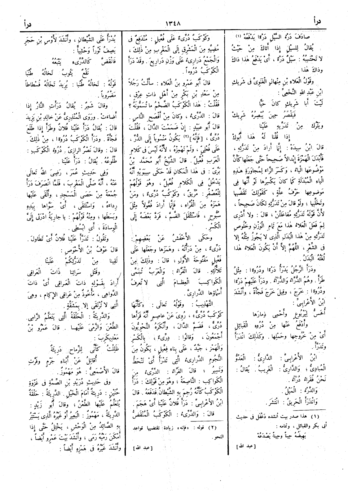 قوله تَخالُه طُنُبا يريد تَخاله فُسْطاطاً مضروباً وقال شمر يقال دَرأَتِ النارُ إِذا أَضاءَت وروى المنذري عن خالد بن يزيد قال يقال دَرَأَ علينا فلان وطَرأَ إِذا طَلَعَ فَجْأَة ودَرأَ الكَوْكَبُ دُرُوءاً من ذلك قال وقال نصر الرازي دُرُوءُ الكَوْكب طُلُوعُه يقال دَرَأَ علينا وفي حديث عمر رضي اللّه عنه أَنه صَلَّى المَغْرِبَ [ ص 74 ] فلما انْصَرَفَ دَرَأَ جُمْعةً من حَصَى المسجد وأَلْقَى عَلَيْها رَِداءَهُ واسْتَلْقَى أَي سَوَّاها بيدِه وبَسَطَها ومنه قولهم يا جارِيةُ ادْرَئِي إِلَيَّ الوِسادَةَ أَي ابْسُطِي وتقولُ تَدَرَّأَ علينا فلان أَي تَطَاول قال عَوفُ ابن الأَحْوصِ