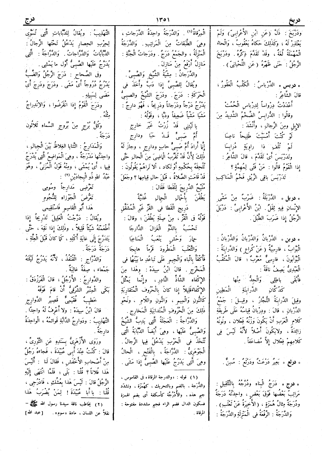 ( * قوله « والدرجة المرقاة » في القاموس والدرجة بالضم وبالتحريك كهمزة وتشدد جيم هذه والأَدرجة كأَسكفة أَي بضم الهمزة فسكون الدال فضم الراء فجيم مشددة مفتوحة المرقاة ) والدَّرَجَةُ واحدةُ الدَّرَجات وهي الطبقات من المراتب والدَّرَجَةُ المنزلة والجمع دَرَجٌ ودَرَجاتُ الجنة منازلُ أَرفعُ من مَنازِلَ والدَّرَجانُ مِشْيَةُ الشيخ والصبي ويقال للصبي إِذا دَبَّ وأَخذ في الحركة دَرَجَ ودَرَج الشيخ والصبي يَدْرُجُ دَرْجاً ودَرَجاناً ودَرِيجاً فهو دارج مَشَيا مَشْياً ضعيفاً ودَبَّا وقوله يا ليتني قد زُرْتُ غَيْرَ خارِجِ أُمَّ صَبِيٍّ قد حَبَا ودارِجِ إِنما أَراد أُمَّ صَبِيٍّ حابٍ ودارِج وجاز له ذلك لأَن قد تُقرِّبُ الماضي من الحال حتى تلحقه بحكمه أَو تكاد أَلا تراهم يقولون قد قامت الصلاة قبل حال قيامها ؟ وجعَلَ مُلَيْحٌ الدَّريجَ للقطا فقال يَطُفْنَ بِأَحْمالِ الجِمالِ عُذَيَّةً دَريجَ القَطا في القَزِّ غَيْرِ المُشَقَّقِ قوله في القَزِّ من صلة يَطُفْنَ وقال تَحْسَبُ بالدَّوِّ الغَزالَ الدَّارِجا حمارَ وحشٍ يَنْعَبُ المَناعِبا والثَّعْلَبَ المَطْرودَ قَرْماً هابِجَا فأَكفأَ بالباء والجيم على تباعد ما بينهما في المخرج قال ابن سيده وهذا من الإِكفاء الشاذ النادر وإِنما يَمْثُلُ الإِكفاءُ قليلاً إِذا كان بالحروف المتقاربة كالنون والميم والنون واللام ونحو ذلك من الحروف المتدانية المخارج والدَّرَّاجةُ العَجَلَةُ التي يَدِبُّ الشيخ والصبي عليها وهي أَيضاً الدَّبَّابة التي تُتَّخذ في الحرب يدخل فيها الرجال الجوهري الدَّرَّاجَةُ بالفتح الحالُ وهي التي يَدْرُجُ عليها الصبي إِذا مشى التهذيب ويقال للدَّبَّابات التي تُسَوَّى لحرب الحِصارِ يدخل تحتها الرجال الدَّبَّابات والدَّرَّاجات والدَّرَّاجَةُ التي يُدَرَّجُ عليها الصبي أَوَّلَ ما يمشي وفي الصحاح دَرَجَ الرجلُ والضب يَدْرُجُ دُرُوجاً أَي مشى ودَرَجَ ودَرِجَ أَي مضى لسبيله ودَرَِجَ القومُ إِذا انقرضوا والانْدِراجُ مثله وكلُّ بُرْج من بُرُوج السماء ثلاثون دَرَجةً والمَدارِجُ الثنايا الغِلاظُ بين الجبال واحدته مدْرَجةٌ وهي المواضع التي يدرج فيها أَي يمشى ومنه قول المزني وهو عبد الله ذو البِجادَينِ تَعَرَّضي مَدارِجاً وسُومِي تَعَرُّضَ الجَوْزاءِ للنُّجُومِ هذا أَبو القاسمِ فاسْتَقِيمي ويقال دَرَّجْتُ العليل تَدْريجاً إِذا أَطعمته شيئاً قليلاً وذلك إِذا نَقِهَ حتى يَتَدَرَّجَ إِلى غاية أَكله كما كان قبل العلة دَرَجَةً درجةً والدَّرَاجُ القُنْفُذُ لأَنه يَدْرُج ليلته جمعاء صفة غالبة والدَّوارِجُ الأَرجُلُ قال الفرزدق بَكَى المِنْبَرُ الشَّرْقِيُّ أَنْ قام فَوْقَهُ خَطِيبٌ فُقَيْمِيٌّ قصيرُ الدَّوارِجِ قال ابن سيده ولا أَعرف له واحداً التهذيب ودَوارِجُ الدابة قوائمه الواحدة دارجةٌ وروى الأَزهري بسنده عن الثوري قال كنت عند أَبي عبيدة فجاءه رجل من أَصحاب الأَخفش فقال لنا أَليس هذا فلاناً ؟ قلنا بلى فلما انتهى إِليه الرجل قال ليس هذا بِعُشِّكِ فادْرُجِي قلنا يا أَبا عبيدة لمن يُضرب هذا