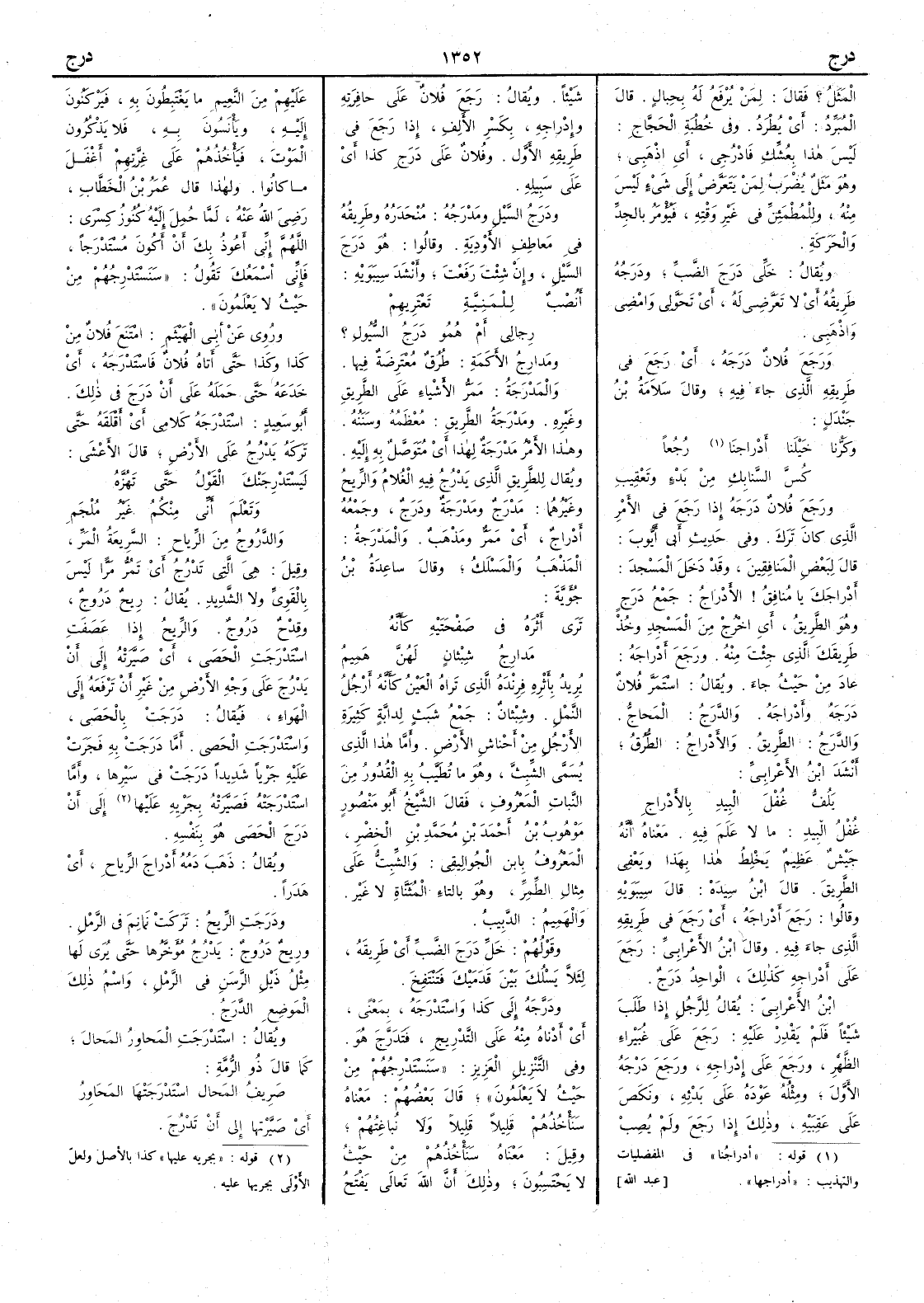 المثل فقال لمن يرفع له بحبال قال المبرد أَي يطرد وفي خطبة الحجاج ليس هذا بِعُشِّكِ فادرُجي أَي اذهبي وهو مثل يضرب لمن يتعرّض إِلى شيء ليس منه وللمطمئن في غير وقته فيؤْمر بالجِدِّ والحركة ويقال خلّي دَرَجَ الضَّبِّ ودَرَجُه طريقه أَي لا تَعَرَّضي له أَي تَحَوَّلي وامضي واذهبي ورجع فلان دَرَجَه أَي رجع في طريقه الذي جاء فيه وقال سلامة بن جندل وكَرِّنا خَيْلَنا أَدْراجَنا رَجَعاً كُسَّ السَّنابِكِ مِنْ بَدْءٍ وتَعْقِيبِ ورجع فلانٌ دَرَجَه إِذا رجع في الأَمر الذي كان تَرَكَ وفي حديث أَبي أَيوب قال لبعض المنافقين وقد دخل المسجد أَدْراجَكَ يا منافق الأَدْراجُ جمع دَرَجٍ وهو الطريق أَي اخْرُجْ من المسجد وخُذْ طريقَك الذي جئت منه ورَجَعَ أَدْراجَه عاد من حيث جاء ويقال استمرَّ فلان دَرَجَه وأَدْراجَه والدَّرَجُ المَحاجُّ والدَّرَجُ الطريق والأَدْراجُ الطُّرُقُ أَنشد ابن الأَعرابي يَلُفُّ غُفْلَ البِيدِ بالأَدْراجِ غُفْل البِيد ما لا عَلَم فيه معناه أَنه جيش عظيم يَخْلِطُ هذا بهذا ويعفي الطريقَ قال ابن سيده قال سيبويه وقالوا رجعَ أَدْراجَه أَي رجع في طريقه الذي جاء فيه وقال ابن الأَعرابي رجع على أَدْراجه كذلك الواحد دَرَجٌ ابن الأَعرابي يقال للرجل إِذا طلب شيئاً فلم يقدر عليه رجع على غُبَيْراءِ الظَّهْرِ ورجع على إِدراجِه ورجع دَرْجَه الأَول ومثله عَوْدَهُ على بَدْئِهِ ونَكَصَ على عَقِبَيْهِ وذلك إِذا رجع ولم يصب شيئاً ويقال رجع فلان على حافِرَتِه وإِدْراجه بكسر الأَلف إِذا رجع في طريقه الأَول وفلان على دَرَجِ كذا أَي على سبيله ودَرَجُ السَّيْلِ ومَدْرَجُه مُنْحَدَرُه وطريقُه في مَعاطف الأَوْدِيةِ وقالوا هو دَرَجَ السَّيْلِ وإِن شئت رفعت وأَنشد سيبويه أَنُصْبٌ للمَنِيَّةِ تَعْتَريهِمْ رِجالي أَمْ هُمُوا دَرَجُ السُّيولِ ؟ ومَدارِجُ الأَكَمَةِ طُرُقٌ مُعْتَرِضَة فيها والمَدْرَجةُ مَمَرُّ الأَشياء على الطريق وغيره ومَدْرَجَةُ الطريق مُعْظَمُه وسَنَنُه وهذا الأَمر مَدْرَجةٌ لهذا أَي مُتَوَصَّلٌ به إِليه ويقال للطريق الذي يَدْرُجُ فيه الغلام والريح وغيرهما مَدْرَجٌ ومَدْرَجَةٌ ودَرَجٌ وجمعه أَدْراجٌ أَي مَمَرٌّ ومَذْهَبٌ والمَدْرَجةُ المَذْهَب والمسلَكُ وقال ساعدة بن جؤَية تَرَى أَثْرَهُ في صَفْحَتَيْهِ كأَنَّهُ مَدارِجُ شِبْثانٍ لَهُنَّ هَمِيمُ يريد بأَثْرِهِ فِرِنْدَهُ الذي تراه العين كأَنه أَرجل النمل وشِبْثانٌ جمع شَبَثٍ لدابة كثيرة الأَرجل من أَحناش الأَرض وأَما هذا الذي يسمى الشِّبِثَّ وهو ما تُطيَّب به القدور من النبات المعروف فقال الشيخ أَبو منصور موهوب بن أَحمد بن محمد بن الخضر المعروف بابن الجُواليقي والشِّبِثُّ على مثال الطِّمِرِّ وهو بالتاء المثناة لا غير والهَمِيم الدَّبِيبُ وقولهم خَلِّ دَرَجَ الضَّبِّ أَي طريقه لئلا يَسْلُك بين قدميك فتنتفخ ودَرَّجَه إِلى كذا واسْتَدْرَجه بمعنًى أَي أَدناه منه على التدريج فتَدَرَّجَ هو وفي التنزيل العزيز سنستَدْرِجُهُم من حيثُ لا يعلمون قال بعضهم معناه سنأْخُذُهم قليلاً قليلاً ولا نُباغِتُهم وقيل معناه سنأْخذهم من حيث لا يحتسبون وذلك أَن الله تعالى يفتح عليهم من النعيم ما يغتبطون به فيركنون إِليه ويأْنسون به فلا يذكرون الموت فيأْخذهم على غِرَّتِهم أَغْفَلَ ما كانوا ولهذا قال عمر بن الخطاب رضي الله عنه لما حُمِلَ إِليه كُنُوزُ كِسْرَى اللهم إِني أَعوذ بك أَن أَكونَ مُسْتَدْرَجاً فإِني أَسمعك تقول سنستدرجهم من حيث لا يعلمون وروي عن أَبي الهيثم امتنع فلان من كذا وكذا حتى أَتاه فلان فاسْتَدْرجه أَي خدعه حتى حمله على أَن دَرَجَ في ذلك أَبو سعيد اسْتَدْرجَه كلامي أَي أَقلقه حتى تركه يَدْرُجُ على الأَرض قال الأَعشى لَيَسْتَدْرِجَنْكَ القَوْلُ حتى تَهُزَّه وتَعْلَمَ أَني مِنكُمُ غَيرُ مُلْجَمِ والدَّرُوجُ من الرياح السريعة المَرِّ وقيل هي التي تَدْرُجُ أَي تَمُرُّ مَرّاً ل
