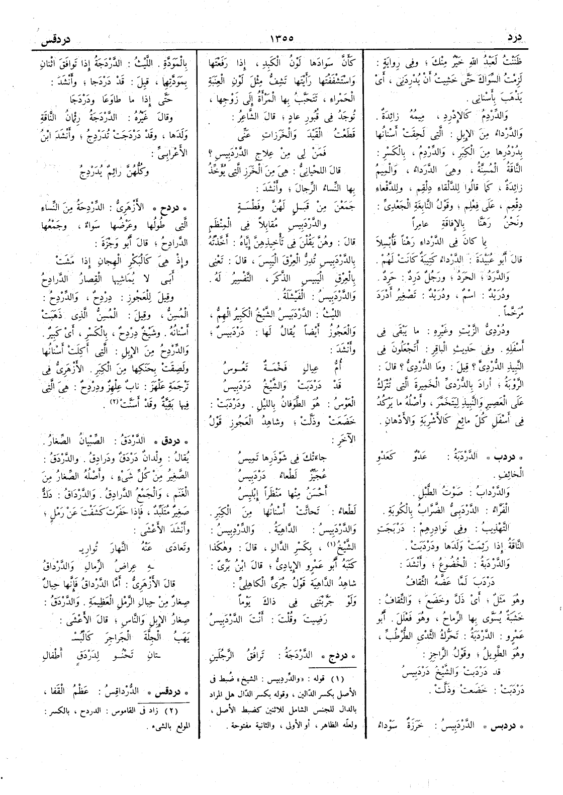 ظننت لعبدالله خير منك وفي رواية لزمت السواك حتى خشيت أَن يُدْرِدَني أَي يذهب بأَسناني والدِّرْدِمُ كالإِدْرِدِ ميمه زائدة والدَّرْداءُ من الإِبل التي لحقت أَسنانُها بدُرْدُرها من الكبَر والدِّرْدِم بالكسر الناقة المسنة وهي الدَّرداءُ والميم زائدة كما قالوا للدَّلْقاءِ دِلْقِم وللدَّقْعاءِ دِقْعِم على فِعْلِم وقول النابغة الجعدي ونحن رَهَنَّا بالافاقة عامراً بما كان في الدَّرداءِ رَهْناً فَأُبْسِلا قال أَبو عبيدة الدَّرداءُ كتيبة كانت لهم والدَّرَدُ الحَرَدُ ورجل دَرِدٌ حَرِدٌ ودُرَيْدٌ اسم وذُرَيْدٌ تصغير أَدرد مرخماً ودُرْدِيُّ الزيت وغيره ما يبقى في أَسفله وفي حديث الباقر أَتجعلون في النبيذ الدُّرْدِيَّ ؟ قيل وما الدردي ؟ قال الرَّوْبَةُ أَراد بالدردي الخميرة التي تترك على العصير والنبيذ ليتخمر وأَصله ما يركد في أَسفل كل مائع كالأَشربة والأَدهان