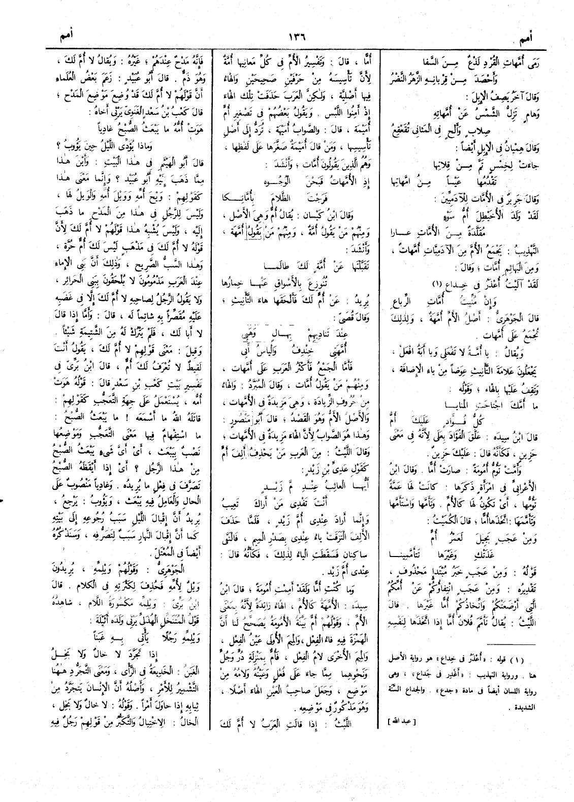 رَمى أُمَّهات القُرْدِ لَذْعٌ من السَّفا وأَحْصَدَ من قِرْانِه الزَّهَرُ النَّضْرُ وقال آخر يصف الإبل وهام تَزِلُّ الشمسُ عن أُمَّهاتِه صِلاب وأَلْحٍ في المَثاني تُقَعْقِعُ وقال هِمْيان في الإبل أيضاً جاءَتْ لِخِمْسٍ تَمَّ من قِلاتِها تَقْدُمُها عَيْساً مِنُ امَّهاتِها وقال جرير في الأُمَّات للآدَمِييِّن لقد وَلَدَ الأُخَيْطِلَ أُمُّ سَوْءٍ مُقَلَّدة من الأُمَّاتِ عارا التهذيب يَجْمَع الأُمَّ من الآدَميّاتِ أُمَّهات ومن البَهائم أُمَّات وقال لقد آلَيْتُ أَغْدِرُ في جَداعِ وإن مُنِّيتُ أُمَّاتِ الرِّباعِ قال الجوهري أَصل الأُمِّ أُمّهةٌ ولذلك تُجْمَع على أُمَّهات ويقال يا أُمَّةُ لا تَفْعَلي ويا أَبَةُ افْعَلْ يجعلون علامة التأْنيث عوضاً من ياء الإضافة وتَقِفُ عليها بالهاء وقوله ما أُمّك اجْتاحَتِ المَنايا كلُّ فُؤادٍ عَلَيْك أُمُّ قال ابن سيده عَلَّق الفؤاد بعَلى لأنه في معنى حَزينٍ فكأَنه قال عليك حَزينٌ وأَمَّتْ تَؤُمُّ أُمُومَةً صارت أُمّاً وقال ابن الأَعرابي في امرأَة ذكرها كانت لها عمة تَؤُمها أي تكون لها كالأُمِّ وتَأَمَّها واسْتَأَمَّها وتأَمَّمها اتَّخَذَها أُمّاً قال الكميت ومِن عَجَبٍ بَجِيلَ لَعَمْرُ أُمّ غَذَتْكِ وغيرَها تَتأَمّمِينا قوله ومن عَجَبٍ خبر مبتدإِ محذوف تقديرهُ ومن عَجَبٍ انْتِفاؤكم عن أُمِّكم التي أَرْضَعَتْكم واتِّخاذكم أُمّاً غيرَها قال الليث يقال تأَمَّم فلان أُمّاً إذا اتَّخذَها لنفسه أُمّاً قال وتفسير الأُمِّ في كل معانيها أُمَّة لأن تأْسيسَه من حَرْفين صحيحين والهاء فيها أصلية ولكن العَرب حذَفت تلك الهاء إذ أَمِنُوا اللَّبْس ويقول بعضُهم في تَصْغير أُمٍّ أُمَيْمة قال والصواب أُمَيْهة تُردُّ إلى أَصل تأْسيسِها ومن قال أُمَيْمَة صغَّرها على لفظها وهم الذين يقولون أُمّات وأَنشد إذِ الأُمّهاتُ قَبَحْنَ الوُجوه فَرَجْتَ الظَّلامَ بأُمَّاتِكا وقال ابن كيسان يقال أُمٌّ وهي الأصل ومنهم من يقول أُمَّةٌ ومنهم من يقول أُمَّهة وأنشد تَقَبَّلْتَها عن أُمَّةٍ لك طالَما تُنوزِعَ بالأَسْواقِ عنها خِمارُها يريد عن أُمٍّ لك فأَلحقها هاء التأْنيث وقال قُصَيّ عند تَناديهمْ بِهالٍ وَهَبِي أُمَّهَتي خِنْدِفُ والياسُ أَبي فأَما الجمع فأَكثر العرب على أُمَّهات ومنهم من يقول أُمَّات وقال المبرّد والهاء من حروف الزيادة وهي مزيدة في الأُمَّهات والأَصل الأَمُّ وهو القَصْد قال أَبو منصور وهذا هو الصواب لأن الهاء مزيدة في الأُمَّهات وقال الليث من العرب من يحذف أَلف أُمٍّ كقول عديّ بن زيد أَيُّها العائِبُ عِنْدِ امَّ زَيْدٍ أنت تَفْدي مَن أَراكَ تَعِيبُ وإنما أراد عنْدي أُمَّ زيدٍ فلمّا حذَف الأَلف التَزقَتْ ياء عنْدي بصَدْر الميم فالتقى ساكنان فسقطت الياء لذلك فكأَنه قال عندي أُمَّ زيد وما كنت أُمّاً ولقد أَمِمْتِ أُمُومةً قال ابن سيده الأُمَّهة كالأُمِّ الهاء زائدة لأَنه بمعنى الأُمِّ وقولهم أمٌّ بَيِّنة الأُمومة يُصَحِّح لنا أن الهمزة فيه فاء الفعل والميم الأُولى عَيْن الفِعْل والميم الأُخرى لام الفعْل فَأُمٌّ بمنزلة دُرٍّ وجُلٍّ ونحوهما مما جاء على فُعْل وعينُه ولامُه من موضع وجعل صاحبُ العَيْنِ الهاء أَصْلاً وهو مذكور في موضعه الليث إذا قالت العرب لا أُمَّ لك فإنه مَدْح عندهم غيره ويقال لا أُمَّ لك وهو ذَمٌّ قال أَبو عبيد زعم بعض العلماء أن قولهم لا أُمَّ لك قد وُضعَ موضع المَدح قال كعب بن سعد الغَنَويّ يَرْثي أَخاه هَوَتْ أُمُّه ما يَبْعَث الصُّبْح غادِياً وماذا يُؤدّي الليلُ حينَ يَؤوبُ ؟ قال أبو الهيثم في هذا البيت وأَيْنَ هذا مما ذهب إليه أَبو عبيد ؟ وإنما معنى هذا كقولهم وَيْحَ أُمِّه ووَيْلَ أُمِّه والوَيلُ لها وليس للرجل في هذا من المَدْح ما ذهَب إليه وليس يُشْبِه هذا قولهم لا أُمَّ لك لأَن قوله أُمَّ لك في مذهب ليس لك أُمٌّ حُرَّة وهذا السَّبُّ الصَّريح وذلك أَنّ بَني الإماء عند العرب مَذْم