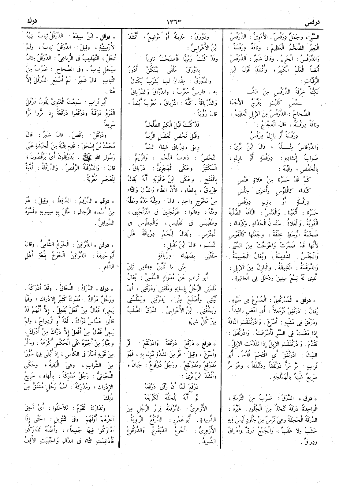 ( درفق ) المُدْرَنْفِقُ المُسْرِع في سيره يقال ادْرَنْفِقْ مُرْمَعِلاًّ أَي امْضِ راشداً ودَرْفَقَ في مَشْيِه أَسرع وادْرَنْفَقَتِ الناقة إذا مضت في السير فأَسرعت وادْرنفَق تقدَّم وادْرَنْفَقَت الإبل إذا تقدَّمت الإبلُ الليث ادْرَنْفَقَ أَي اقْتَحم قُدُماً أَبو تراب مرَّ مرّاً دَرَنْفَقاً ودَلَنْفَقاً وهو مَرٌّ سريع شبيه بالهَمْلَجة
