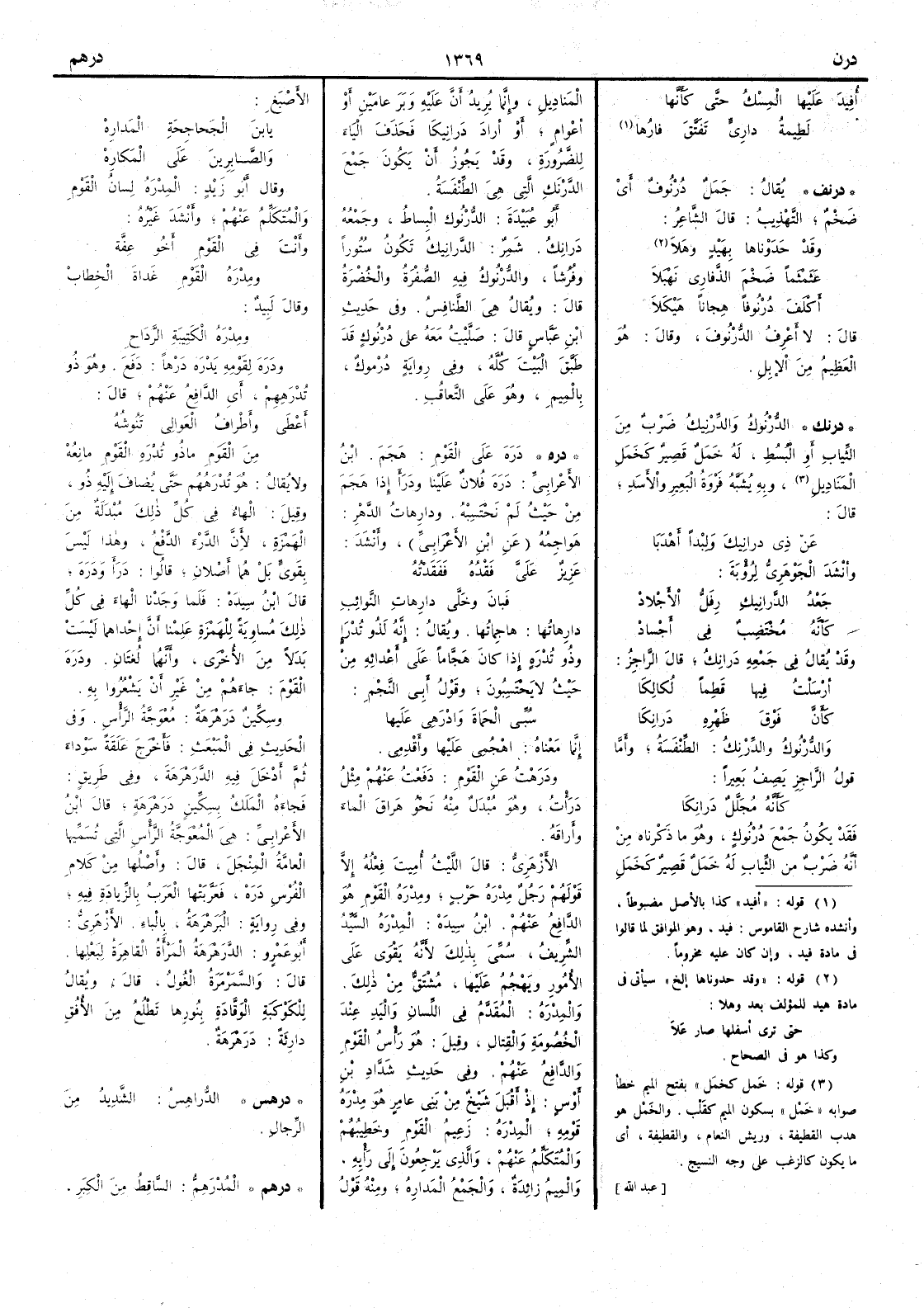 عَثَمْثَماً ضَخْم الذَّفاري نَهْبَلا أَكْلَفَ دُرْنُوفاً هِجاناً هَيْكَلا قال لا أَعرف الدُّرْنُوفَ وقال هو العظيم من الإبل ( درنك ) الدُّرْنُوك والدِّرْنيك ضرب من الثياب أَو البُسْط له خَمَل قصير كخَمَل المناديل وبه يشبه فروة البعير والأَسد قال عن ذي دَرَانيكَ ولِِبداً أَهْدَبا وأَنشد الجوهري لرؤبة جَعْد الدَّرَانيك رفَلّ الأَجْلاد كأَنه مُخْتَضِب في أَجْساد وقد يقال في جمعه دَرَانِك قال الراجز أَرْسَلْتُ فيها قَطِماً لُكالِكا كأنّ فوق ظهره دَرَانِكا والدُّرْنُوك والدِّرْنِكُ الطِّنْفَسة وأَما قول الراجز يصف بعيراً كأنه مُجلَّلٌ دَرَانكا فقد يكون جمع دُرْنوك وهو ما ذكرنا من أنه ضرب من الثياب له خَمَل قصير كخَمَل المناديل وإنما يريد أَن عليه وَبَرَ عامين أَو أَعوام أَو أَراد دَرَانِيكا فحذف الياء للضرورة وقد يجوز أَن يكون جمع الدِّرْنك التي هي الطِّنْفَسة أَبو عبيدة الدُّرْنوك البِساط وجمعه دَرَانك شمر الدَّرَانيك تكون سُتوراً وفُرُشاً والدُّرْنُوك فيه الصفرة والحضرة قال ويقال هي الطِّنَافس وفي حديث ابن عباس قال صليت معه على دُرْنوك قد طَبَّق البيت كله وفي رواية دُرْمُوك بالميم وهو على التعاقب ( دره ) دَرَه على القَوم هَجَم ابن الأَعرابي دَرَهَ فلانٌ علينا ودَرَأَ إِذا هَجَمَ من حيث لم نَحْتَسِبْه ودارِهاتُ الدَّهْرِ هَواجِمُه عن ابن الأَعرابي وأَنشد عَزِيرٌ عَليَّ فَقْدُه فَفَقَدْتُه فبانَ وخَلَّى دارِهاتِ النوائبِ دارِاهاتُها هاجماتُها ويقال إِنه لَذُو تُدْرَإِ وذو تُدْرَهٍ إِذا كان هَجَّاماً على أَعدائه من حيث لايحتسبون وقول أَبي النجم سُبِّي الحَماةَ وادْرَهِي عليها إِنما معناه اهْجُمِي عليها وأَقْدِمِي ودَرَهْتُ عن القوم دفعت عنهم مثل دَرَأْتُ وهو مبدل منه نحو هَراقَ الماءَ وأَراقَهُ الأَزهري قال الليث أُمِيتَ فِعْلُه إِلا قولهم رجل مِدْرَهُ حَرْبٍ ومِدْرَهُ القوم هو الدافعُ عنهم ابن سيده المِدْرَه السيد الشريف سمي بذلك لأَنه يقوى على الأُمور ويَهْجُم عليها مشتق من ذلك والمِدْرَهُ المُقَدَّم في اللسان واليد عند الخصومة والقتال وقيل هو رأْس القوم والدافع عنهم وفي حديث شَدَّاد بن أَوْسٍ إِذْ أَقْبَلَ شيخ من بني عامر هو مِدْرَهُ قومِه المِدْرَهُ زعيم القوم وخطيبهم والمتكلم عنهم والذي يرجعون إِلى رأْيه والميم زائدة والجمع المَدارِهُ ومنه قول الأَصبغ يا ابنَ الجَحاجحةِ المَدارِهْ والصابرينَ على ا لمَكارِهْ وقال أَبو زيد المِدْرَهُ لسان القوم والمتكلم عنهم وأَنشد غيره وأَنتَ في القوم أَخُو عِفَّةٍ ومِدْرَهُ القومِ غَداةَ الخِطاب وقال لبيد ومِدْرَه الكتيبةِ الرَّدَاحِ ودَرَه لقومه يَدْرَه دَرْهاً دَفَع وهو ذو تُدْرَهِهم أَي الدافعُ عنهم قال أَعْطَى وأَطرافُ العَوالي تَنُوشُه من القومِ ما ذو تُدْرَهِ القومِ مانِعُهْ ولا يقال هو تُدْرَهُهُم حتى يضاف إِليه ذو وقيل الهاء في كل ذلك مبدلة من الهمزة لأَن الدَّرْءَ الدفعُ وهذا ليس بقوي بل هما أَصلان قالوا دَرَأَ وَدَرَه قال ابن سيده فلما وجدنا الهاء في كل ذلك مساوية للهمزة علمنا أَن إِحداهما ليست بدلاً من الأُخرى وأَنهما لغتان ودَرَهَ القومَ جاءهم من غير أَن يَشْعُروا به وسِكِّينٌ دَرَهْرَهَةٌ مُعْوَجَّةُ الرأْس وفي الحديث في المبعث فأَخْرَجَ عَلَقَةً سوداء ثم أَدخل فيه الدَّرَهْرَهَة وفي طريق فجاءه الملك بسكين دَرَهْرَهة قال ابن الأَعرابي هي المعوجة الرأْس التي تسميها العامة المِنْجَلَ قال وأَصلها من كلام الفرس دَرَهْ فعرَّبتها العرب بالزيادة فيه وفي رواية البَرَهْرَهَة بالباء الأَزهري أَبو عمرو الدَّرَهْرَهةُ المرأَة القاهرةُ لبعلها قال والسَّمَرْمَرَة الغُول قال ويقال للكَوْكَبة الوَقَّادة بِنُورها تَطْلُع من الأُفُق دارئةً دَرَهْْرَهةٌ