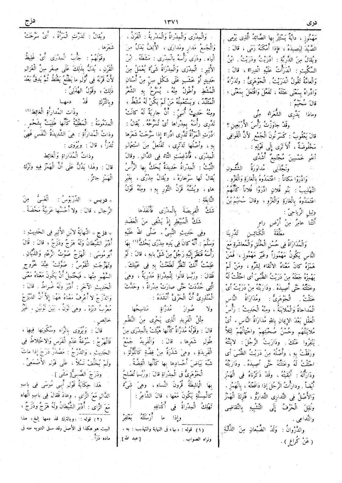 مهموز دابَّة يستتر بها الصائد الذي يرمي الصيد ليصيده فإذا أَمكنَه رمى قال ويقال من الدَّرِيّة ادَّرَيْت ودَرَيْت ابن السكيت انْدَرَأْتُ عليه انْدِراءً قال والعامة تقول انْدَرَيْت الجوهري وتَدَرَّاه وادَّراه بمعنى خَتَله تَفَعَّل وافْتَعَل بمعنى قال سُحَيم وماذا يَدَّرِي الشُّعَراءُ مِنِّي وقَدْ جاوَزْتُ رَأْسَ الأَرْبَعِينِ ؟ قال يعقوب كسر نون الجمع لأَن القوافي مخفوضة أَلا ترى إلى قوله أَخو خَمْسِين مُجْتَمعٌ أَشُدِّي ونَجَّذَني مُداوَرَةُ الشُّؤُونِ وادَّرَوْا مكاناً اعْتَمَدوه بالغارة والغَزْو التهذيب بنو فلان ادَّرَوْا فلاناً كأَنَّهم اعْتَمَدوه بالغارة والغزو وقال سُحَيم بن وَثيل الرياحي أَتَتْنا عامِرٌ من أَرْضِ رامٍ مُعَلِّقَةَ الكَنائِنِ تَدَّرِينا والمُدَارَاةُ في حُسْن الخُلُق والمُعاشَرةِ مع الناس يكونُ مهموزاً وغير مهموز فمن همزه كان معناه الاتِّقاءَ لشَرِّه ومن لم يهمزه جعله من دَرَيْت الظَّبْي أَي احْتَلْت له وخَتَلْته حتى أَصِيدَه ودَارَيْته من دَرَيْت أَي خَتَلْت الجوهري ومُدَارَاة الناس المُداجاة والمُلايَنَة ومنه الحديث رأْس العَقْلِ بعدَ الإيمانِ بالله مُدَارَاةُ الناسِ أَي مُلايَنَتُهُم وحُسنُ صُحْبَتِهِم واحْتِمالُهُم لئَلاَّ يَنْفِروا عَنْكَ ودَارَيت الرجلَ لايَنْته ورَفَقْت به وأَصله من دَرَيْت الظَّبْي أَي احْتَلْت له وخَتَلْته حتى أَصيدَه ودَارَيْتُه ودَارأْته أَبْقَيْته وقد ذكرناه في الهمز أَيضاً ودارأْت الرجلَ إذا دَافَعْتَه بالهمز والأَصل في التداري التَّدارُؤُ فَتُرِكَ الهَمْز ونُقِلَ الحرف إلى التشبيه بالتقاضي والتداعي والدَّرْوانُ ولَدُ الضِّبْعانِ من الذِّئْبة عن كراع والمِدْرَى والمِدْراة والمَدْرِيَةُ القَرْنُ والجمع مَدارٍ ومَدارَى الأَلف بدل من الياء ودَرَى رَأْسَه بالمِدْرى مَشَطَه ابن الأََثير المِدْرَى والمِدْرَاةُ شيء يُعْمَل من حديد أَو خشب على شكل سنٍّ من أَسْنان المُشْطِ وأَطْولُ منه يُسَرَّحُ به الشَّعَر المُتَلَبِّدُ ويَستَعمله من لم يكن له مُشْط ومنه حديث أُبيٍّ أَن جاريةً له كانَت تَدَّري رأْسَهُ بِمِدْراها أَي تُسَرِّحُه يقال ادَّرَت المرأَة تَدَّرِي ادِّراءً إذا سَرَّحَتْ شعرها به وأَصلها تَدْتَري تَفْتَعِل من استعمال المِدْرى فأُدغمت التاء في الدال وقال الليث المِدْراةُ حديدة يُحَكُّ بها الرأْس يقال لها سَرْخارَهْ ويقال مِدْرىً بغير هاء ويُشَبَّه قَرْنُ الثَّوْرِ به ومنه قول النابغة شَكَّ الفَرِيصَةَ بالمِدْرى فأَنْفَذَها شَكَّ المُبَيْطِرِ إذْ يَشْفِيِ مِنَ العَضَدِ وفي حديث النبي صلى الله عليه وسلم أَنه كان في يَدِهِ مِدْرىً يَحُكُّ بها رأْسَه فَنَظَر إلَيْه رَجلٌ من شَقِّ بابهِ قال لو عَلِمْتُ أَنَّك تَنْظُر لَطَعَنْتُ به في عَيْنِكَ فقال وربما قالوا للمِدْراةِ مَدْرِيَة وهي التي حدِّدَت حتى صارت مِدْراةً وحدث المنذري أَن الحربي أَنشده ولا صُوار مُدَرَّاةٍ مَناسِجُها مثلُ الفريدِ الذي يَجْري مِنَ النِّظْمِ قال وقوله مُدَرَّاة كأَنها هُيِّئَت بالمِدْرى من طول شعرها قال والفَرِيدُ جمع الفريدة وهي شَذْرة من فضة كاللؤلؤ شَبَّه بياض أَجسادها كأَنها الفضة الجوهري في المِدْراةِ قال وربما تُصْلِحُ بها الماشطة قُرُونَ المِّساء وهي شيء كالمِسَلَّة يكون مَعَها قال تَهْلِكُ المِدْراةُ في أَكّْنافِه وإِذا ما أَرْسَلَتْهُ يَعْتَفِرْ ويقال تَدَرَّت المرأَة أَي سَرَّحت شعَرها وقولهم جَأْبُ المِدْرى أَي غَلِيظ القَرْنِ يُدَلّ بذلك على صِغَر سِنِّ الغزال لأَن قَرْنَه في أَول ما يطلع يغلظ ثم يدق بعد ذلك وقول الهذلي وبالترك قد دمها وذات المُدارأَة الغائط