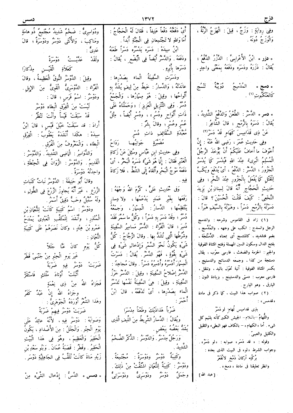 ( * واد زاد في القاموس وشرحه واندسج الرجل وانسدج انكب على وجهه والمدّسج بضم فتشديد كالمنتسج أي بمعناه الدستجة بفتح الدال وسكون السين المهملة وفتح المثناة الفوقية والجيم الحزمة والضغث فارسي معرّب يقال دستجة من كذا وجمعه الدساتج والدستيج بكسر المثناة الفوقية آنية تحوّل باليد وتنقل فارسي معرب دستي والدستينج بزيادة النون اليارق وهو اليارج ) ( دسر ) الدَّسْرُ الطعن والدَّفْعُ الشديد يقال دَسَرَه بالرمح قال الشاعر عن ذي قَدَامِيسَ كَهامٍ قد دَسَرْ وفي حديث عمر رضي الله عنه إِن أَخوف ما أَخاف عليكم أَن يؤخذ الرجل المسلم البريء عند الله فَيُدْسَرَ كما يُدْسَرُ الجَزُورُ الدَّسْرُ الدفع أَي يُدْفَعَ ويُكَبَّ للقتل ما يفعل بالجزور عند النحر وفي حديث الحجاج أَنه قال لسِنان بن يزيد النخعي كيف قتلت الحسين ؟ قال دَسَرْتُه بالرمح دَسْراً وهَبَرْتُه بالسيف هَبْراً أَي دَفَعْتُهُ دَفْعاً عنيفاً فقال له الحجاج أَما والله لا تجتمعان في الجنة أَبداً ابن سيده دَسَرَه يَدْسُرُه دَسْراً طعنه ودفعه والدَّسْرُ أَيضاً في البُضْعِ يقال دَسَرَها بأَيرِه ودَسَرَت السفينةُ الماءَ بصدرها عاندته والدِّسارُ خيط من ليف يشدّ به أَلواحها وقيل هو مسمارها والجمع دُسُرٌ وفي التنزيل العزيز وحملناه على ذات أَلواح ودُسُرٍ ودُسْرٍ أَيضاً عُسُرٍ وعُسْرٍ وقال بشر مُعَبَّدَة السَّقَائفِ ذات دُسْرٍ مُضَبَّرَة جَوانِبُها رَدَاحُ وفي حديث ابن عباس وسئل عن زكاة العنبر فقال إِنما هو شيء دَسَرَهُ البحر أَي دفعه موج البحر وأَلقاه إِلى الشَّطِّ فلا زكاة فيه وفي حديث علي كرم الله وجهه رَفَعَها بغير عَمَدٍ يَدْعَمُها ولا دِسارٍ يَنْتَظِمُها الدِّسارُ المِسْمارُ وجمعه دُسُرٌ وقد دَسَرَ به دَسْراً وكل ما سُمِّرَ فقد دُسِرَ قال الفراء الدُّسُرُ مسامير السفينة وشُرُطُها التي تُشَدُّ بها وقال الزجاج كل شيء يكون نحو السَّمْرِ وإِدخال شيء في شيء بقوَّة فهو الدَّسْرُ يقال دَسَرْتُ المسمار أَدْسُرُه وأَدْسِرُهُ دَسْراً وقال مجاهد الدَّسْرُ إِصلاح السفينة وقيل الدَّسْرُ خَرْزُ السفينة وقيل هي السفينة نفسها تَدْسُرُ الماء بصدرها أَي تدفعه قال ابن أَحمر ضَرباً هذاذَيْكَ وطَعْناً مِدسَرَا ويقال الدِّسارُ الشَّريط من الليف الذي يشد بعضه ببعض ورجل مِدْسَرٌ والدَّوْسَرُ الذكر الضخم الشديد وكَتِيبَةٌ دَوْسَرٌ ودَوْسَرَةٌ مجتمعة ودَوْسَرٌ كتيبة للنعمان اشْتُقَّتْ من ذلك وجَمَلٌ دَوْسَرٌ ودَوْسريٌّ ودَوْسَرَانِيٌّ ودُوَاسِرِيٌّ ضخم شديد مجتمع ذو هامة ومناكب والأُنثى دَوْسَرٌ ودَوْسَرَةٌ قال عدي ولقد عَدَّيْتُ دَوْسَرَةً كَعَلاَةِ القَيْنِ مِذْكارا وقيل الدَّوْسَرُ النوق العظيمة وقال الفراء الدَّوْسَرِيُّ القويُّ من الإِبل ودَوْسَرٌ اسم فرس قال لَيْسَتْ من الفِرْقِ البِطاءِ دَوْسَرُ قد سَبَقَتْ قَيْساً وأَنتَ تَنْظُرُ أَراد قد سبقت خيل قيس قال ابن سيده هكذا أَنشده يعقوب الفِرْقِ البِطاءِ والمعروف من الفُرْقِ والدُّوَاسِرُ الماضي الشديد والدَّوْسَرُ القديم والدَّوْسَرُ الزُّوَانُ في الحنطة واحدته دَوْسَرَةٌ وقال أَبو حنيفة الدَّوْسَرُ نبات كنبات الزرع غير أَنه يجاوز الزرع في الطول وله سنبل وحب دقيق أَسمر ودَوْسَرٌ اسم كتيبة كانت للنعمان بن المنذر وأَنشد للمثقب العبدي يمدح عمرو بن هند وكان نصرهم على كتيبة النعمان كُلُّ يَوْمٍ كانَ عَنَّا جَلَلاً غَيرَ يَومِ الحِنْوِ من جَنَبيْ قَطَرْ ضَرَبَتْ دَوْسَرُ فيه ضَرْبَةً أَثْبَتَتْ أَوْتادَ مُلْكٍ فاسْتَقَرْ فَجَزَاهُ اللهُ من ذِي نِعْمَةٍ وجَزاهُ اللهُ إِنْ عَبْدٌ كَفَرْ وهذا الشعر أَورده الجوهري ضَرَبَتْ دَوْسَرُ فيهم ضَرْبَةً وصوابه دوسر فيه لأَنه عائد على يوم الحِنْوِ والجَلَلُ من الأَضداد يكون الحقير والعظيم وهو في هذا البيت الحقير وقَطَرُ قَصَبَةُ عُمَانَ وبنو سعد بن زيد مناة كانت تلقب في الجاهلية دَوْسَر