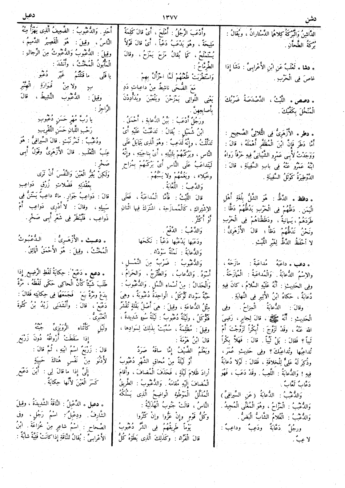 ( دعبث ) الأَزهري الدُّعْبُوثُ المُخَنَّثُ وقيل هو الأَحمق المائقُ ( دعبع ) دَعْبَع حكاية لفظ الرضيع إِذا طلب شيئاً كأَن الحاكي حكى لفظه مرة بِدَعْ ومرة بِبَعْ فجمعهما في حكايته فقال دَعْبع قال وأَنشدني زيد بن كُثْوةَ العَنْبَري ولَيْلٍ كأَثناء الرُّوَيزِيّ جُبْته إِذا سَقَطتْ أَرواقُه دون زَرْبَعِ قال زَرْبَع اسم ابنه ثم قال لأَدْنُوَ من نَفْسٍ هُناكَ حَبِيبةٍ إِليَّ إِذا ما قال لي أَيْنَ دَعْبَعِ كسر العين لأَنها حكاية ( دعبل ) الدِّعْبِل الناقة الشديدة وقيل الشارف ودِعْبِل اسم رجل وفي الصحاح اسم شاعر من خُزاعة ابن الأَعرابي يقال للناقة إِذا كانت فَتِيَّة شابة