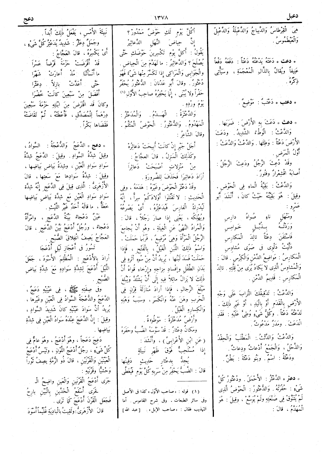 ( دعثر ) الدَّعْثَرُ الأَحمق ودُعْثُورُ كل شيء حُفْرَتُه والدُّعْثُورُ الحوض الذي لم يُتَنَوَّقْ في صَنْعَتِه ولم يُوَسَّعْ وقيل هو المَهدَّمُ قال أَكُلَّ يَوْمٍ لَكِ حَوْضٌ مَمْدُورْ ؟ إِنَّ حِياضَ النَّهَلِ الدَّعاثِيرْ يقول أَكلَّ يوم تكسرين حوضك حتى يُصْلَحَ ؟ والدعاثير ما تهدّم من الحياض والجَوَابي والمَرَاكِي إِذا تكسر منها شيء فهو دُعْثُور وقال أَبو عدنان الدُّعْثُورُ يُحْفَرُ حفراً ولا يبنى إِنما يحفره صاحب الأَوّل يومَ وِرْدِه والدَّعْثَرَةُ الهَدْمُ والمُدَعْثَرُ المهدوم والدُّعْثُورُ الحوض المُثَلَّمُ وقال الشاعر أَجَلْ جَيْرِ إِن كانت أُبيحَتْ دَعاثِرُهْ وكذلك المنزل قال العجاج مِنْ مَنْزِلاتٍ أَصْبَحَتْ دَعاثِرَا أَراد دعاثيرا فحذف للضرورة وقد دَعْثَرَ الحوضَ وغيره هَدَمَهُ وفي الحديث لا تقتلوا أَولادكم سرّاً إِنه لَيُدْرِكُ الفارسَ فَيُدَعْثِرُهُ أَي يَصْرَعُهُ ويُهْلِكُه يعني إِذا صار رجلاً قال والمراد النهي عن الغِيلَةِ وهو أَن يجامع الرجل المرأَة وهي مرضع فربما حملت واسم ذلك اللبن الغَيْلُ بالفتح فإِذا حملت فسد لبنها يريد أَن من سوء أَثره في بدن الطفل وإِفساد مزاجه وإِرخاء قواه أَن ذلك لا يزال ماثلاً فيه إِلى أَن يشتد ويبلغ مبلغ الرجال فإِذا أَراد منازلة قِرْنٍ في الحرب وهن عنه وانكسر وسبب وَهْنِهِ وانكساره الغَيْلُ وأَرض مُدَعْثَرَةٌ موطوءَة ومكان دِعْثارٌ قد سَوَّسَهُ الضَّبُّ وحَفَرَهُ عن ابن الأَعرابي وأَنشد إِذا مُسْلَحِبٌّ فَوْقَ ظَهْرِ نَبِيثَةٍ يُجِدُّ بِدعْثارٍ حَدِيثٍ دَفِينُها قال الضَّب يَحْفِرُ من سَرَبه كل يوم فيغطي نبيثة الأَمس يفعل ذلك أَبداً وجَمَلٌ دِعَثْرٌ شديد يُدَعْثِرُ كل شيء أَي يكسره قال العجاج قد أَقْرَضَتْ حَزْمَةُ قَرْضاً عَسْرَا ما أَنْسَأَتْنَا مُذْ أَعارَتْ شَهْرَا حتى أَعَدَّتْ بازِلاً دِعَثْرَا أَفْضَلَ من سَبْعِينَ كانت خُضَرَا وكان قد اقترض من ابنته حَزْمَةَ سبعين درهماً للمُصَدِّقِ فأَعطته ثم تقاضته فقضاها بكراً