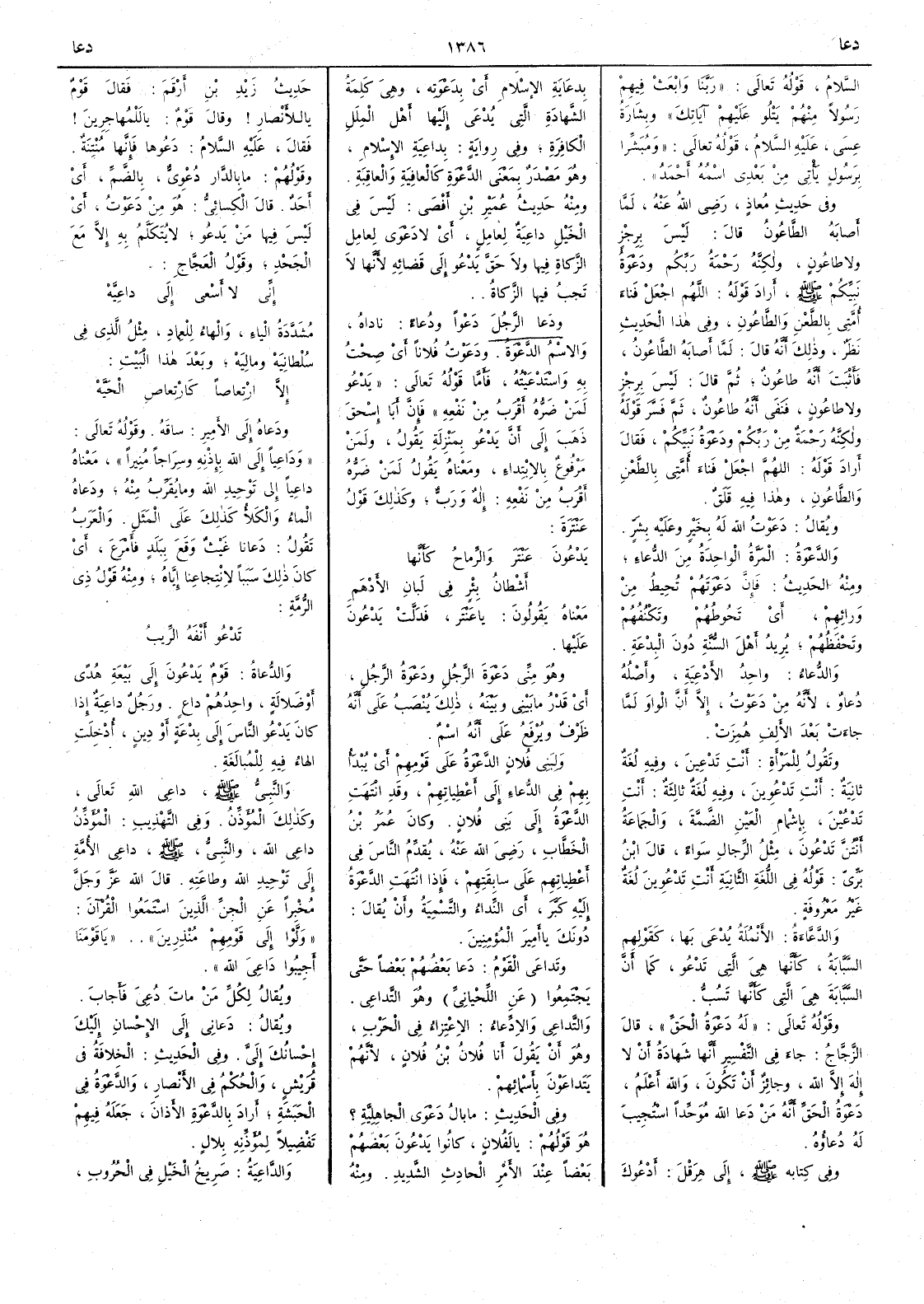 السلام قولهُ تعالى رَبَّنا وابْعَثْ فِيهِمْ رَسُولاً منهم يَتْلُو عليهم آياتِكَ وبِشارَةُ عيسى عليه السلام قوله تعالى ومُبَشِّراً برَسُولٍ يأْتي من بَعْدي اسْمهُ أَحْمَدُ وفي حديث معاذ رضي الله عنه لما أَصابَهُ الطاعون قال ليْسَ بِرِجْزٍ ولا طاعونٍ ولكنه رَحْمةُ رَبِّكم ودَْوَةُ نبِيِّكُم صلى الله عليه وسلم أَراد قوله اللهم اجعَلْ فَناءَ أُمَّتي بالطَّعْن والطاعونِ وفي هذا الحديث نَظَر وذلك أَنه قال لما أَصابَهُ الطاعون فأَثبَتَ أَنه طاعونٌ ثم قال ليسَ برِجْزٍ ولا طاعونٍ فنَفَى أَنه طاعونٌ ثم فسَّر قوله ولكنَّه رحمةٌ من ربِّكم ودَعوةُ نبِيِّكم فقال أَراد قوله اللهم اجعَلْ فَناءَ أُمَّتي بالطَّعْن والطاعون وهذا فيه قَلَق ويقال دَعَوْت الله له بخَيْرٍ وعَليْه بِشَرٍّ والدَّعوة المَرَّة الواحدةَ من الدُّعاء ومنه الحديث فإن دَعْوتَهم تُحِيطُ من ورائهم أَي تحُوطُهم وتكْنُفُهم وتَحْفَظُهم يريد أهلَ السُّنّة دون البِدْعة والدعاءُ واحد الأَدْعية وأَصله دُعاو لأنه من دَعَوْت إلا أن الواو لمَّا جاءت بعد الأَلف هُمِزتْ وتقول للمرأَة أَنتِ تَدْعِينَ وفيه لغة ثانية أَنت تَدْعُوِينَ وفيه لغة ثالثة أَنتِ تَدْعُينَ بإشمام العين الضمة والجماعة أَنْتُنِّ تَدْعُونَ مثل الرجال سواءً قال ابن بري قوله في اللغة الثانية أَنتِ تَدْعُوِينَ لغة غير معروفة والدَّعَّاءةُ الأَنْمُلَةُ يُدْعى بها كقولهم السِّبَّابة كأنها هي التي تَدْعُو كما أَن السبابة هي التي كأَنها تَسُبُّ وقوله تعالى له دَعْوةُ الحقّ قال الزجاج جاء في التفسير أَنها شهادة أَن لاإله إلا الله وجائزٌ أَن تكون والله أََعلم دعوةُ الحقِّ أَنه مَن دَعا الله مُوَحِّداً اسْتُجيب له دعاؤه وفي كتابه صلى الله عليه وسلم إلى هِرَقْلَ أَدْعُوكَ بِدِعايةِ الإسْلام أَي بِدَعْوَتِه وهي كلمة الشهادة التي يُدْعى إليها أَهلُ المِلَلِ الكافرة وفي رواية بداعيةِ الإسْلامِ وهو مصدر بمعنى الدَّعْوةِ كالعافية والعاقبة ومنه حديث عُمَيْر بن أَفْصى ليس في الخْيلِ داعِيةٌ لِعاملٍ أَي لا دَعْوى لعاملِ الزكاة فيها ولا حَقَّ يَدْعُو إلى قضائه لأَنها لا تَجب فيها الزكاة ودَعا الرجلَ دَعْواً ودُعاءً ناداه والاسم الدعْوة ودَعَوْت فلاناً أَي صِحْت به واسْتَدْعَيْته فأَما قوله تعالى يَدْعُو لَمَنْ ضَرُّه أَقْرَبُ من نَفْعِه فإن أَبا إسحق ذهب إلى أَن يَدْعُو بمنزلة يقول ولَمَنْ مرفوعٌ بالابتداء ومعناه يقولُ لَمَنْ ضَرُّه أَقربُ من نَفْعه إلهٌ وربٌّ وكذلك قول عنترة يَدْعُونَ عَنْتَرَ والرِّماحُ كأَنها أَشْطانُ بئرٍ في لَبانِ الأَدْهَمِ معناه يقولون يا عَنْتَر فدلَّت يَدْعُون عليها وهو مِنِّي دَعْوَةَ الرجلِ ودَعْوةُ الرجُلِ أَي قدرُ ما بيني وبينه ذلك يُنْصَبُ على أَنه ظرف ويُرفع على أَنه اسمٌ ولبني فلانٍ الدَّعْوةُ على قومِهم أَي يُبْدأُ بهم في الدعاء إلى أَعْطِياتِهم وقد انتهت الدَّعْوة إلى بني فلانٍ وكان عمر بن الخطاب رضي الله عنه يُقدِّمُ الناسَ في أَعطِياتِهِم على سابِقتِهم فإذا انتهت الدَّعْوة إليه كَبَّر أَي النداءُ والتسميةُ وأَن يقال دونكَ يا أَميرَ المؤمنين وتَداعى القومُ دعا بعضُهم بعضاً حتى يَجتمعوا عن اللحياني وهو التَّداعي والتَّداعي والادِّعاءُ الاعْتِزاء في الحرب وهو أَن يقول أنا فلانُ بنُ فلان لأنهم يَتداعَوْن بأَسمائهم وفي الحديث ما بالُ دَعْوى الجاهلية ؟ هو قولُهم يا لَفُلانٍ كانوا يَدْعُون بعضُهم بعضاً عند الأَمر الحادث الشديد ومنه حديث زيدِ بنِ أَرْقَمَ فقال قومٌ يا للأَنْصارِ وقال قومٌ يا للْمُهاجِرين فقال عليه السلام دَعُوها فإنها مُنْتِنةٌ وقولهم ما بالدَّارِ دُعْوِيٌّ بالضم أَي أَحد قال الكسائي هو مِنْ دَعَوْت أَي ليس فيها من يَدعُو لا يُتكَلَّمُ به إلاَّ مع الجَحْد وقول العجاج إنِّي لا أَسْعى إلى داعِيَّهْ مشددة الياء والهاءُ للعِمادِ مثل الذي في سُلْطانِيَهْ ومالِيَهْ وبعد ه