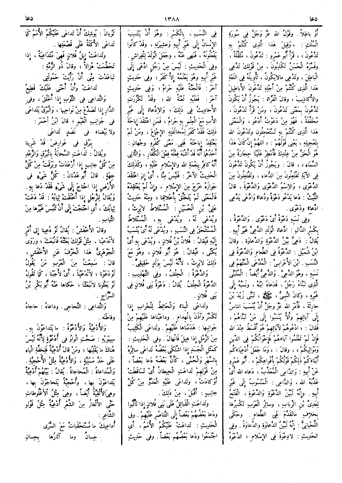 أَو باطلاً وقول الله عز وجل في سورة المُلْك وقيل هذا الذي كُنْتُم به تَدَّعُون قرأَ أَبو عمرو تَدَّعُون مثقلة وفسره الحسن تَكْذبون من قولك تَدَّعي الباطل وتَدَّعي ما لا يكون تأْويله في اللغة هذا الذي كنتم من أَجله تَدَّعُونَ الأَباطيلَ والأَكاذيبَ وقال الفراء يجوز أَن يكون تَدَّعُون بمعنى تَدْعُون ومن قرأَ تَدْعُون مخففة فهو من دَعَوْت أَدْعُو والمعنى هذا الذي كنتم به تستعجلون وتَدْعُون الله بتَعْجيله يعني قولهم اللهم إن كان هذا هوالحَقَّ من عندك فأَمْطِر علينا حجارةً من السماء قال ويجوز أَن يكون تَدَّعُون في الآية تَفْتَعِلُونَ من الدعاء وتَفْتَعِلون من الدَّعْوَى والاسم الدَّعْوى والدِّعْوة قال الليث دَعا يَدْعُو دَعْوَةً ودُعاءً وادَّعَى يَدَّعي ادِّعاءً ودَعْوَى وفي نسبه دَعْوة أَي دَعْوَى والدِّعْوة بكسر الدال ادِّعاءُ الوَلدِ الدَّعِيِّ غير أَبيه يقال دَعِيٌّ بيِّنُ الدِّعْوة والدِّعاوَة وقال ابن شميل الدَّعْوة في الطعام والدِّعْوة في النسب ابن الأَعرابي المدَّعَى المُتَّهَمُ في نسبَه وهو الدَّعِيُّ والدَّعِيُّ أَيضاً المُتَبَنَّى الذي تَبَنَّاه رجلٌ فدعاه ابنَه ونسبُه إلى غيره وكان النبي صلى الله عليه وسلم تَبَنَّى زيدَ بنَ حارثةَ فأَمَرَ اللهُ عز وجل أَن يُنْسَب الناسُ إلى آبائهم وأَن لا يُنْسَبُوا إلى مَن تَبَنَّاهم فقال ادْعُوهم لآبائهم هو أَقْسَطُ عند الله فإن لم تَعْلَموا آباءَهم فإخوانُكم في الدِّينِ ومَوالِيكمْ وقال وما جعلَ أَدْعِياءَكم أَبْناءَكم ذلِكم قَوْلُكمْ بأَفْواهِكم أَبو عمرو عن أَبيه والداعي المُعَذِّب دَعاهُ الله أَي عَذَّبَه الله والدَّعِيُّ المنسوب إلى غير أَبيه وإنه لَبَيِّنُ الدَّعْوَة والدِّعْوةِ الفتح لعَدِيِّ بن الرِّباب وسائرُ العرب تَكْسِرُها بخلاف ما تقدم في الطعام وحكى اللحياني إنه لبيِّنُ الدَّعاوة والدِّعاوة وفي الحديث لا دِعْوة في الإسلام الدِّعْوة في النسب بالكسر وهو أَن ينْتَسب الإنسان إلى غير أََبيه وعشيرته وقد كانوا يفعلونه فنهى عنه وجعَل الوَلَدَ للفراش وفي الحديث ليس من رجل ادَّعَى إلى غير أَبيه وهو يَعْلمه إلا كَفَر وفي حديث آخر فالجَنَّة عليه حرام وفي حديث آخر فعليه لعنة الله وقد تكرَّرَت الأَحاديث في ذلك والادِّعاءُ إلى غيرِ الأَبِ مع العِلْم به حرام فمن اعتقد إباحة ذلك فقد كفر لمخالفته الإجماع ومن لم يعتقد إباحته ففي معنى كفره وجهان أَحدهما أَنه قدأَشبه فعلُه فعلَ الكفار والثاني أَنه كافر بنعمة الله والإسلام عليه وكذلك الحديث الآخر فليس منا أَي إن اعْتَقَد جوازَه خرج من الإسلام وإن لم يعتقده فالمعنى لم يَتَخَلَّق بأَخلاقنا ومنه حديث علي بن الحسين المُسْتَلاطُ لا يَرِثُ ويُدْعَى له ويُدْعَى به المُسْتَلاطُ المُسْتَلْحَق في النسب ويُدَعى له أَي يُنْسَبُ إليه فيقال فلان بن فلان ويُدْعَى به أَي يُكَنَّى فيقال هو أَبو فلان وهو مع ذلك لا يرث لأَنه ليس بولد حقيقي والدَّعْوة الحِلْفُ وفي التهذيب الدَّعوةُ الحِلْف يقال دَعْوة بني فلان في بني فلان وتَداعَى البناءُ والحائط للخَراب إذا تكسَّر وآذَنَ بانْهِدامٍ وداعَيْناها عليهم من جَوانِبِها هَدَمْناها عليهم وتَداعَى الكثيب من الرمل إذا هِيلَ فانْهالَ وفي الحديث كَمَثَلِ الجَسدَ إذا اشْتَكَى بعضهُ تَداعَى سائرهُ بالسَّهَر والحُمَّى كأَن بعضه دعا بعضاً من قولهم تَداعَت الحيطان أَي تساقطت أَو كادت وتَداعَى عليه العدوّ من كل جانب أَقْبَلَ من ذلك وتَداعَت القبائلُ على بني فلان إذا تأَلَّبوا ودعا بعضهم بعضاً إلى التَّناصُر عليهم وفي الحديث تَداعَتْ عليكم الأُمَم أَي اجتمعوا ودعا بعضهم بعضاً وفي حديث ثَوْبانَ يُوشكُ أَن تَداعَى عليكم الأُمَمُ كما تَداعَى الأَكَلَةُ على قَصْعَتِها وتَداعَتْ إبلُ فلان فهي مُتدَاعِيةٌ إذا تَحَطَّمت هُزالاً وقال ذو الرمة تَباعَدْتَ مِنِّي أَن رأَيتَ حَمُولَتي تَداعَتْ وأَن أَحْنَى عليكَ 