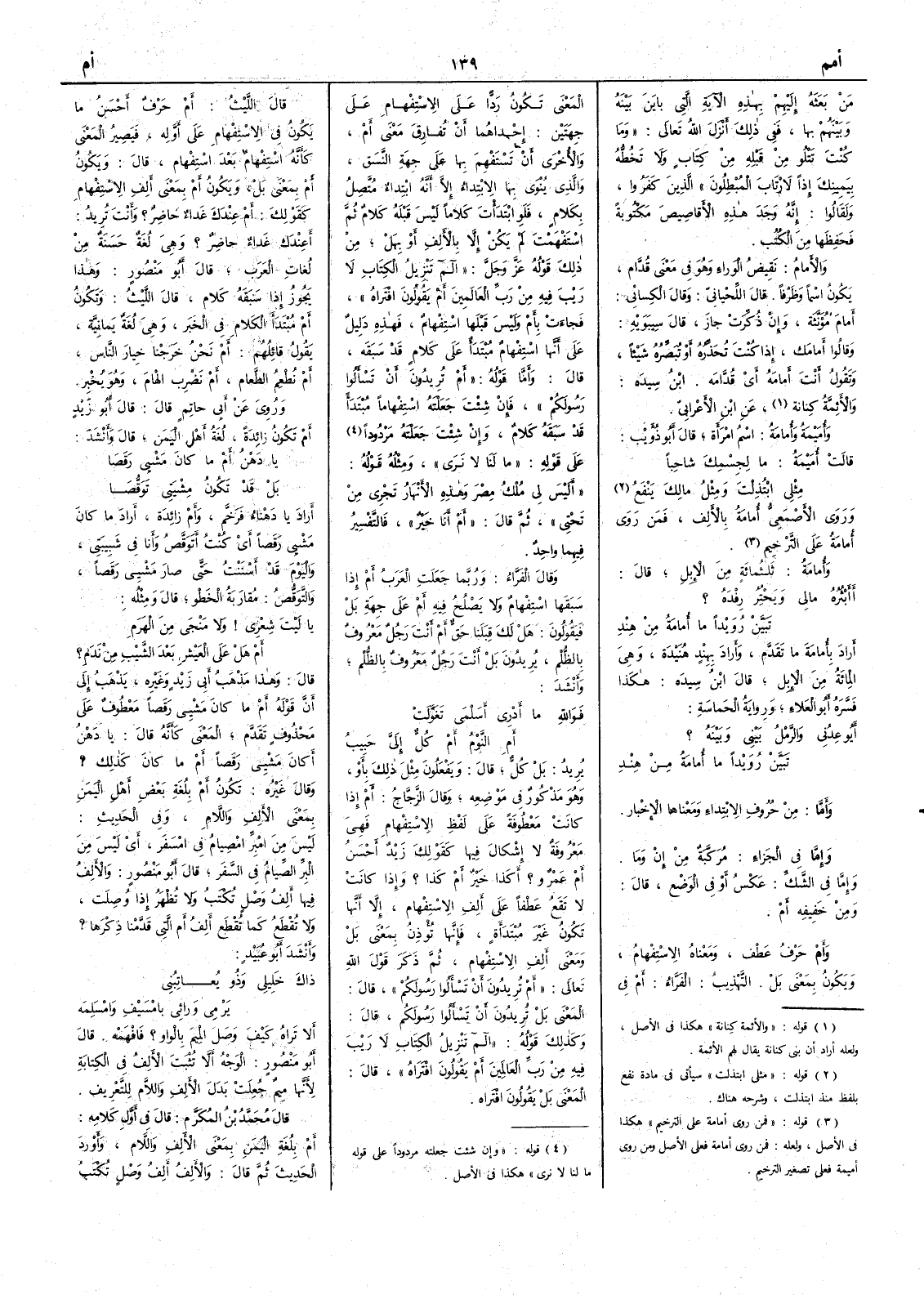 ( * قوله « وان شئت جعلته مردوداً على قوله ما لنا لا نرى » هكذا في الأصل ) ومثله قوله أَلَيْسَ لي مُلْكُ مِصْرَ وهذه الأَنهارُ تَجْري من تحتي ثم قال أَم أَنا خَيْرٌ فالتفسير فيهما واحدٌ وقال الفراء وربما جَعَلتِ العرب أَمْ إذا سبقها استفهام ولا يَصْلُح فيه أَمْ على جهة بَلْ فيقولون هل لك قِبَلَنا حَقٌّ أَم أَنتَ رجل معروف بالظُّلْم يُريدون بل أنت رجُل معروف بالظُّلْم وأَنشد فوَالله ما أَدري أَسَلْمى تَغَوَّلَتْ أَمِ النَّوْمُ أَمْ كلٌّ إليَّ حَبِيبُ يُريد بَلْ كلٌّ قال ويفعلون مثل ذلك بأَوْ وهو مذكور في موضعه وقال الزجاج أَمْ إذا كانت معطوفة على لفظ الاستفهام فهي معروفة لا إشكال فيها كقولك زيد أَحسن أَمْ عَمرو أَكذا خيرٌ أَمْ كذا وإذا كانت لا تقَعُ عطفاً على أَلِف الاستفهام إلا أَنها تكون غير مبتدأَة فإنها تُؤذِن بمعنى بَلْ ومعنى أَلف الاستفهام ثم ذكر قول الله تعالى أَمْ تُريدُون أَن تَسأَلوا رَسُولكم قال المعنى بَلْ تُريدون أَن تَسأَلوا رسولَكم قال وكذلك قوله ألم تَنْزيلُ الكتاب لا رَيب فيه من ربِّ العالمين أمْ يَقولون افْتَراه قال المعنى بَلْ يقولون افْتَراه قال الليث أَمْ حَرْف أَحسَن ما يكون في الاستفهام على أَوَّله فيصير المعنى كأَنه استفهام بعد استفهام قال ويكون أمْ بمعنى بَلْ ويكون أم بمعنى ألِف الاستفهام كقولك أَمْ عِنْدك غَداء حاضِرٌ ؟ وأنت تريد أَعِندَك غداء حاضِرٌ وهي لغة حسنة من لغات العرب قال أَبو منصور وهذا يَجُوز إذا سبقه كلام قال الليث وتكون أَمْ مبتدَأَ الكلام في الخبر وهي لغة يَمانية يقول قائلُهم أم نَحْن خَرَجْنا خِيارَ الناس أَمْ نُطْعِم الطَّعام أَمْ نَضْرِب الهامَ وهو يُخْبِر وروي عن أبي حاتم قال قال أَبو زيد أَم تكون زائدة لغةُ أَهل اليمن قال وأَنشد يا دَهْن أَمْ ما كان مَشْيي رَقَصا بل قد تكون مِشْيَتي تَوَقُّصا أَراد يا دَهْناء فَرَخَّم وأَمْ زائدة أراد ما كان مَشْيي رَقَصاً أي كنت أَتَوقَّصُ وأَنا في شَبِيبتي واليومَ قد أَسْنَنْت حتى صار مَشيي رَقَصاً والتَّوَقُّص مُقارَبةُ الخَطْو قال ومثلُه يا ليت شعري ولا مَنْجى من الهَرَمِ أَمْ هلْ على العَيْش بعدَ الشَّيْب مِن نَدَمِ ؟ قال وهذا مذهب أَبي زيد وغيره يذهَب إلى أَن قوله أَمْ كان مَشْيي رَقَصاً معطوف على محذوف تقدّم المعنى كأَنه قال يا دَهْن أَكان مَشْيي رَقَصاً أَمْ ما كان كذلك وقال غيره تكون أَمْ بلغة بعض أَهل اليَمن بمعنى الأَلِف واللامِ وفي الحديث ليس من امْبرِّ امْصِيامُ في امْسَفَر أي ليس من البِرِّ الصِّيامُ في السفَر قال أَبو منصور والأَلفُ فيها أَلفُ وَصْلٍ تُكْتَب ولا تُظْهر إذا وُصِلت ولا تُقْطَع كما تُقْطَع أَلِف أَم التي قدَّمنا ذكْرَها وأَنشد أَبو عبيد ذاكَ خَلِيلي وذُو يُعاتِبُني يَرْمي ورائي بامْسَيْفِ وامْسَلِمَه ألا تراه كيف وَصَل الميمَ بالواو ؟ فافهمه قال أَبو منصور الوجه أن لا تثبت الألف في الكِتابة لأَنها مِيمٌ جعلتْ بدَلَ الأَلفِ واللام للتَّعْريف قال محمد ابن المكرَّم قال في أَوَّل كلامه أَمْ بلغة اليمن بمعنى الأَلف واللام وأَوردَ الحديث ثم قال والأَلف أَلفُ وَصْل تُكْتَبُ
