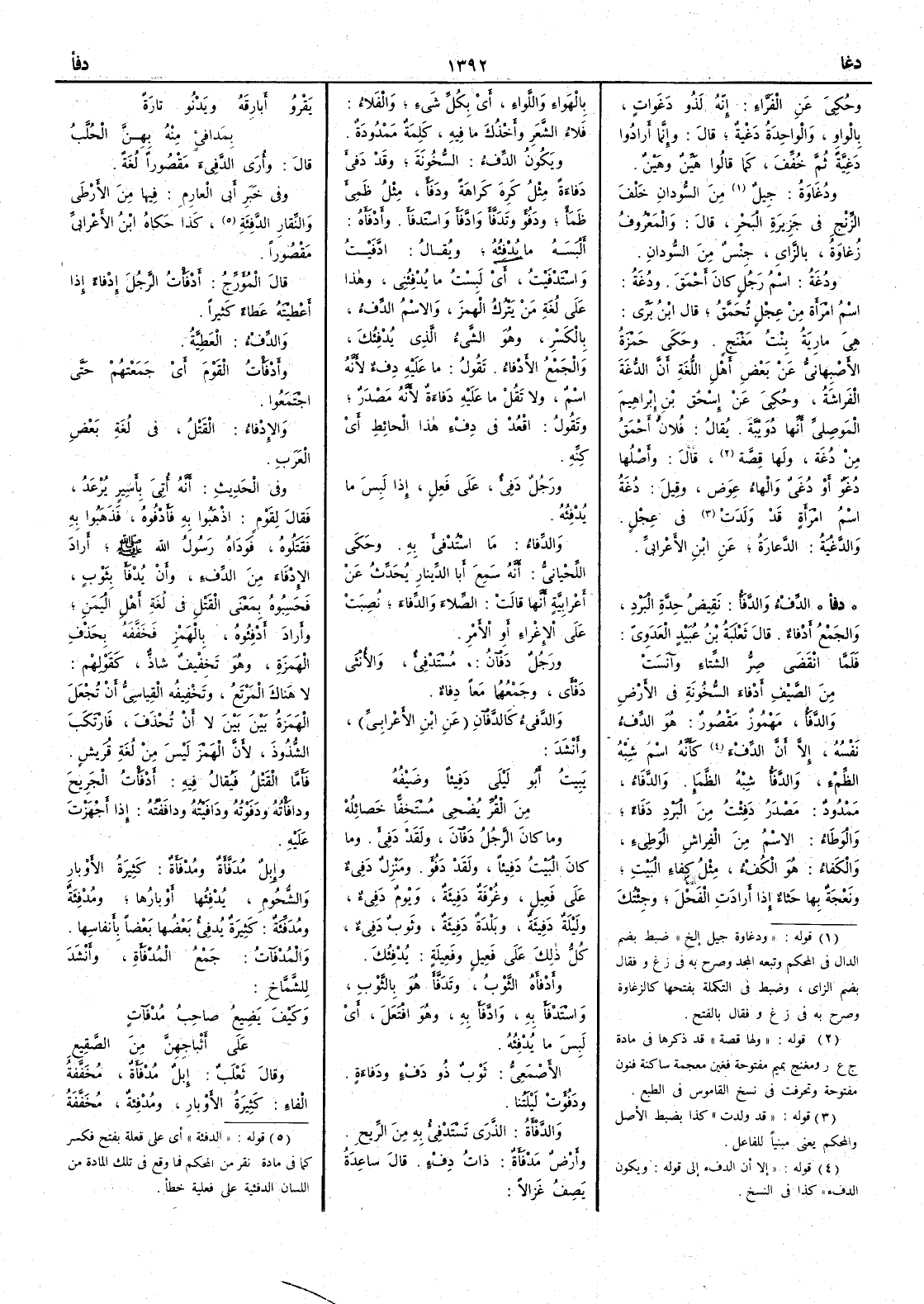 ( 2 قوله « الدفئة » أي على فعلة بفتح فكسر كما في مادة نقر من المحكم فما وقع في تلك المادة من اللسان الدفئية على فعلية خطأ ) كذا حكاه ابن الأَعرابي مقصوراً قال المؤرج أَدْفَأْتُ الرجلَ إِدفاءً إِذا أَعْطيْته عَطاءً كثيراً والدِّفْءُ العَطِيَّة وأَدْفَأْتُ القومَ أَي جَمَعْتُهم حتى اجْتَمَعُوا والإِدفاءُ القَتل في لغة بعض العرب وفي الحديث أَنه أُتِيَ بأَسِيرٍ يُرْعَد فقال لقَوْمٍ اذْهَبُوا به فَأَدْفُوهُ فَذهبوا به فقتلوه فَوداهُ رسول اللّه صلى اللّه عليه وسلم أَراد الإِدْفَاء من الدِّفْءِ وأَن يُدْفَأَ بثوب فَحَسِبُوه بمعنى القتل في لغة أَهل اليمن وأَراد أَدْفِئوه بالهمز فَخَفَّفه بحذف الهمزة وهو تخفيف شاذ كقولهم لا هَناكَ المَرْتَعُ وتخفيفه القياسي أَن تُجعل الهمزةُ بين بين لا أَن تُحْذَفَ [ ص 77 ] فارتكب الشذوذ لأَن الهمز ليس من لغة قريش فأَمَّا القتل فيقال فيه أَدْفَأْتُ الجَرِيحَ ودافَأْتُه ودَفَوْتُه ودَافَيْتُه ودَافَفْتُه إِذا أَجْهَزْتَ عليه وإِبل مُدَفَّأَةٌ ومُدْفأَةٌ كثيرةُ الأَوْبار والشُّحوم يُدْفِئها أَوْبارُها ومُدْفِئةٌ ومُدَفِّئةٌ كثيرةٌ يُدفِئُ بعضُها بعضاً بأَنفاسها والمُدْفآت جمع المُدْفأَةِ وأَنشد للشماخ