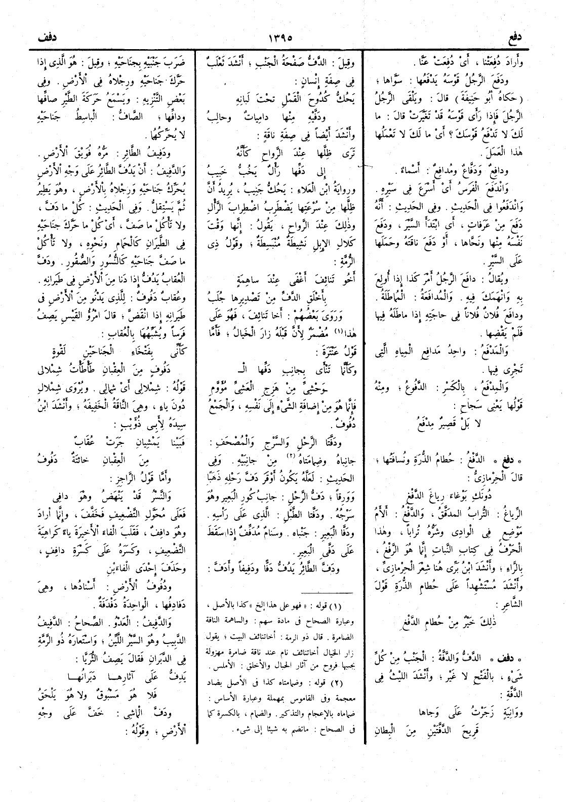 ( * قوله « وضمامتاه » كذا في الأصل بضاد معجمة وفي القاموس بمهملة وعبارة الاساس ضماماه بالاعجام والتذكير والضمام بالكسر كما في الصحاح ما تضم به شيئاً إلى شيء ) من جانبيه وفي الحديث لعله يكون أَوْقَرَ دَفَّ رَحْلِهِ ذهباً ووَرِقاً دَفُّ الرحْلِ جانِبُ كُورِ البعير وهو سَرْجُه ودفَّتا الطبلِ الذي على رأْسه ودَفّا البعير جَنْباه وسَنامٌ مُدَفِّفٌ إذا سَقَطَ على دَفَّي البعير ودَفَّ الطائرُ يَدُفُّ دَفّاً ودَفِيفاً وأَدَفَّ ضَرَب جَنْبَيْه بجناحيه وقيل هو الذي إذا حرّك جناحيه ورجلاه في الأَرض وفي بعض التَّنْزيه ويسمع حركَةَ الطير صافِّها ودافِّها الصافُّ الباسِطُ جناحيه لا يحركهما ودَفِيفُ الطائِر مَرُّه فُوَيْقَ الأَرض والدَّفِيفُ أَن يَدُفَّ الطائرُ على وجه الأَرض يحرّك جَناحيه ورجلاه بالأَرض وهو يطير ثم يستقل وفي الحديث كلْ ما دَفَّ ولا تأْكلْ ما صَفَّ أَي كلْ ما حرَّك جَناحَيْهِ في الطيران كالحمام ونحوه ولا تأْكل ما صَفَّ جناحيه كالنُّسور والصُّقُور ودَفَّ العُقابُ يَدُفُّ إذا دنا من الأَرض في طيَرانِه وعُقابٌ دَفُوفٌ للذي يَدْنُو من الأَرض في طيرانه إذا انْقَضَّ قال امرؤ القيس يصف فرساً ويشبهها بالعُقاب كأَني بفَتْخاء الجَناحَيْن لَقْوَةٍ دَفُوفٍ من العِقْبانِ طأْطأْتُ شِمْلالي وقوله شِمْلالي أَي شِمالي ويروى شِمْلال دون ياء وهي الناقة الخفيفة وأَنشد ابن سيده لأَبي ذؤيب فَبَيْنا يَمْشِيان جَرَتْ عُقابٌ من العِقْبانِ خائِتة دَفُوفُ وأَما قول الراجز والنَّسْرُ قد يَنْهَضُ وهو دافي فعلى محوّل التضعيف فَخَفَّفَ وإنما أَراد وهو دافِفٌ فقَلب الفاء الأَخيرة ياء كراهيةَ التضعيف وكَسَره على كَسْرة دافِفٍ وحذف إحدى الفاءين ودُفُوفُ الأَرض أَسْنادُها وهي دَفادِفُها الواحدة دَفْدَفَةٌ والدَّفِيفُ العَدْوُ الصحاح الدَّفِيفُ الدَّبيبُ وهو السَّير اللَّيِّن واستعاره ذو الرمة في الدَّبَران فقال يصف الثُرَيَّا يَدِفُّ على آثارِها دَبَرانُها فلا هو مَسْبُوقٌ ولا هو يَلْحَقُ ودَفَّ الماشي خَفَّ على وجهِ الأَرض وقوله