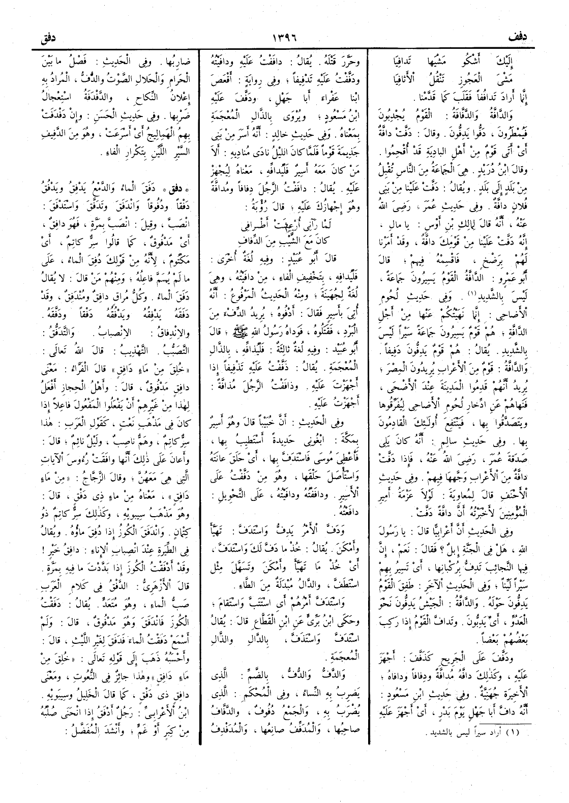( * أراد سيراً ليس بالشديد ) وفي حديث لُحُومِ الأَضاحي إنما نَهَيْتُكم عنها من أَجلِ الدَّافَّةِ هم قوم يَسِيرون جماعةً سَيْراً ليس بالشَّديد يقال هم قوم يَدِفُّونَ دَفِيفاً والدافَّةُ قوم من الأَعْراب يريدون المِصْر يريد أَنهم قَدِمُوا المدينة عند الأَضحى فنهاهم عن ادِّخارِ لُحُوم اللأَضاحي ليُفَرِّقُوها ويَتَصَدَّقُوا بها فيَنْتَفعَ أُولئك القادِمون بها وفي حديث سالم أَنه كان يَلي صَدَقةَ عمر رضي اللّه عنه فإذا دَفَتْ دافَّةٌ من الأَعْراب وجَّهَها فيهم وفي حديث الأحنف قال لمعاوِيةَ لولا عَزْمةُ أَمِيرِ المؤمنين لأَخبرته أَن دافّةً دفَّتْ وفي الحديث أَن أَعرابيّاً قال يا رسولَ اللّه هل في الجنة إبل ؟ فقال نعم إنَّ فيها النجائِبَ تَدِفُّ برُكْبانها أَي تسير بهم سَيْراً لَيِّناً وفي الحديث الآخر طَفِقَ القومُ يَدِفُّونَ حَوْلَه والدَّافَّةُ الجيش يَدِفُّون نحو العدوِّ أَي يَدِبُّون وتَدافَّ القومُ إذا ركِبَ بعضهُم بعضاً ودَفَّفَ على الجَريح كَذَفَّفَ أَجْهَزَ عليه وكذلك دافَّه مُدافَّةً ودِفافاً ودافاه الأَخيرة جُهَنِيَّةٌ وفي حديث ابن مسعود أَنه دافَّ أَبا جهل يوم بَدْرٍ أَي أَجْهَزَ عليه وحَرَّرَ قَتْلَه يقال دافَفْتُ عليه ودافَيْتُه ودَفَّفْت عليه تَدْفِيفاً وفي رواية أَقْعَصَ ابنا عفراء أَبا جهل ودفَّف عليه ابن مسعود ويروى بالذال المعجمة بمعناه وفي حديث خالد أَنه أَسَرَ من بني جَذيمة قوماً فلما كان الليلُ نادى مناديه أَلا من كان معه أَسير فليدافِّه معناه ليجهزْ عليه يقال دافَفْتُ الرجل دِفافاً ومُدافَّة وهو إجْهازُك عليه قال رؤْبة لما رآني أُرْعِشَتْ أَطْرافي كان مع الشَّيْبِ منَ الدِّفافِ قال أَبو عبيد وفيه لغة أُخرى فَلْيُدافِه بتخفيف الفاء من دافَيْتُه وهي لغة لجُهَينة ومنه الحديث المرفوع أَنه أُتِيَ بأَسيرٍ فقال أَدْفُوه يريد الدِّفْءَ من البَرْد فقتلوه فَوَداه رسول اللّه صلى اللّه عليه وسلم قال أَبو عبيد وفيه لغة ثالثة فَلْيُذافِّه بالذال المعجمة يقال ذَفَّفْتُ عليه تذْفيفاً إِذا أَجْهَزْتَ عليه وذافَفْتُ الرَّجُلَ مُذافَّةً أَجْهَزْتُ عليه وفي الحديث أَنَّ خُبَيباً قال وهو أَسيرٌ بمكة ابْغُوني حَديدةً أَسْتَطِيبُ بها فأُعْطِيَ مُوسَى فاسْتَدَفَّ بها أَي حلَق عانته واسْتَأْصَلَ حَلْقها وهو من دَفَّفْتُ على الأَسير ودافَفْتُه ودافَيْتُه على التحويل دافَعْتُه ودفَّ الأَمْرُ يَدِفُّ واسْتَدَفَّ تَهَيّأَ وأَمكن يقال خذ ما دفَّ لك واسْتَدَفَّ أَي خذ ما تهيّأَ وأَمكن وتَسَهَّلَ مثل اسْتَطفَّ والدال مبدلة من الطاء واسْتَدَفَّ أَمْرُهم أَي اسْتَتَبّ واستقام وحكى ابن بري عن ابن القطَّاع قال يقال استدف واستذف بالدال والذال المعجمة والدَّفُّ والدُّفُّ بالضم الذي يَضرب به النساء وفي المحكم الذي يُضْرَب به والجمع دُفُوفٌ والدفَّافُ صاحبُها والمُدَفِّفُ صانِعُها والمُدفدِفُ ضارِبُها وفي الحديث فَصْلُ ما بين الحرام والحلال الصوتُ والدفُّ المراد به إعلان النِّكاح والدفْدفةُ استعجال ضربها وفي حديث الحسن وإن دَفْدَفتْ بهم الهَماليجُ أَي أَسْرَعَتْ وهو من الدَّفيف السير اللَّيِّن بتكرار الفاء