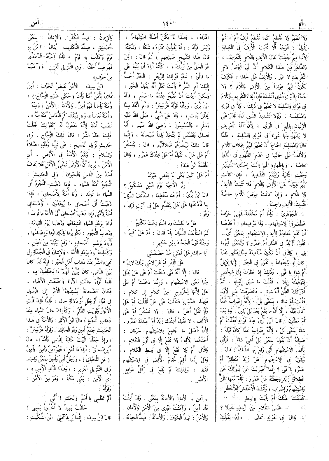 ( أمن ) الأَمانُ والأَمانةُ بمعنى وقد أَمِنْتُ فأَنا أَمِنٌ وآمَنْتُ غيري من الأَمْن والأَمان والأَمْنُ ضدُّ الخوف والأَمانةُ ضدُّ الخِيانة والإيمانُ ضدُّ الكفر والإيمان بمعنى التصديق ضدُّه التكذيب يقال آمَنَ به قومٌ وكذَّب به قومٌ فأَما آمَنْتُه المتعدي فهو ضدُّ أَخَفْتُه وفي التنزيل العزيز وآمَنَهم من خوف ابن سيده الأَمْنُ نقيض الخوف أَمِن فلانٌ يأْمَنُ أَمْناً وأَمَناً حكى هذه الزجاج وأَمَنةً وأَماناً فهو أَمِنٌ والأَمَنةُ الأَمْنُ ومنه أَمَنةً نُعاساً وإذ يَغْشاكم النعاسُ أَمَنةً منه نصَب أَمَنةً لأَنه مفعول له كقولك فعلت ذلك حَذَر الشر قال ذلك الزجاج وفي حديث نزول المسيح على نبينا وعليه الصلاة والسلام وتقع الأمَنةُ في الأَرض أَي الأَمْنُ يريد أَن الأَرض تمتلئ بالأَمْن فلا يخاف أَحدٌ من الناس والحيوان وفي الحديث النُّجومُ أَمَنةُ السماء فإذا ذهبت النجومُ أَتى السماءَ ما تُوعَد وأَنا أَمَنةٌ لأَصحابي فإذا ذهبتُ أَتى أَصحابي ما يُوعَدون وأََصحابي أَمَنةٌ لأُمَّتي فإذا ذهبَ أصحابي أَتى الأُمَّةَ ما تُوعَد أَراد بِوَعْد السماء انشقاقَها وذهابَها يوم القيامة وذهابُ النجومُ تكوِيرُها وانكِدارُها وإعْدامُها وأَراد بوَعْد أَصحابه ما وقع بينهم من الفِتَن وكذلك أَراد بوعْد الأُمّة والإشارةُ في الجملة إلى مجيء الشرّ عند ذهابِ أَهل الخير فإنه لما كان بين الناس كان يُبَيِّن لهم ما يختلفون فيه فلما تُوفِّي جالت الآراءُ واختلفت الأَهْواء فكان الصَّحابةُ يُسْنِدونَ الأَمرَ إلى الرسول في قول أَو فعل أَو دلالة حال فلما فُقِدَ قَلَّت الأَنوارُ وقَويَت الظُّلَمُ وكذلك حالُ السماء عند ذهاب النجوم قال ابن الأَثير والأَمَنةُ في هذا الحديث جمع أَمينٍ وهو الحافظ وقوله عز وجل وإذ جَعَلْنا البيتَ مثابةً للناس وأَمْناً قال أَبو إسحق أَراد ذا أَمْنٍ فهو آمِنٌ وأَمِنٌ وأَمِين عن اللحياني ورجل أَمِن وأَمين بمعنى واحد وفي التنزيل العزيز وهذا البَلد الأَمين أَي الآمِن يعني مكة وهو من الأَمْنِ وقوله أَلم تعْلمِي يا أَسْمَ ويحَكِ أَنني حلَفْتُ يميناً لا أَخونُ يَميني قال ابن سيده إنما يريد آمنِي ابن السكيت