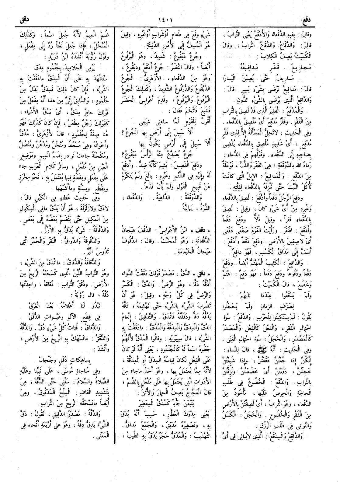 وقال بفِيه الدَّقْعاء والأَدْقع يعني التراب قال والدَّقاعُ والدُّقاعُ التراب وقال الكميت يصف الكلاب مَجازِيعُ قَفْرٍ مَداقِيعُه مَسارِيفُ حتى يُصِبْن اليَسارا قال مَداقِيعُ ترضى بشيء يسير قال والدَّاقِعُ الذي يَرْضَى بالشيء الدُّون والمُدْقَع الفقير الذي قد لَصِقَ بالتراب من الفقر وفَقْر مُدْقِع أَي مُلْصِق بالدَّقْعاء وفي الحديث لا تَحِلُّ المسأَلةُ إِلا لذي فَقْر مُدْقِع أَي شديد مُلْصِق بالدَّقعاء يُفْضِي بصاحبه إِلى الدَّقعاء وقولهم في الدعاء رماه الله بالدَّوقَعة هي الفقر والذُّلُّ فَوْعلة من الدقع والمَداقِيعُ الإِبل التي كانت تأْكل النبت حتى تُلْزِقَه بالدَّقْعاء لقلته ودَقِعَ الرَّجلُ دَقَعاً وأَدْقَع لَصِقَ بالدَّقعاء وغيره من أَي شيء كان وقيل لصق بالدقْعاء فَقراً وقيل ذُلاًّ ودَقِعَ دَقَعاً وأَدْقَع افتقر ورأَيت القومَ صَقْعَى دَقْعَى أَي لاصقين بالأَرض ودَقِعَ دَقَعاً وأَدْقَعَ أَسَفَّ إِلى مَداقّ الكسب فهو داقِعٌ والدَّاقِعُ الكئيب المُهْتَم أَيضاً ودَقَع دَقْعاً ودُقُوعاً ودَقِعَ دَقَعاً فهو دَقِعٌ اهْتَمَّ وخضَعَ قال الكميت ولم يَدْقَعُوا عندما نابَهُم لصَرْفِ الزَّمانِ ولم يَخْجَلُوا يقول لم يستكينوا للحرب والدَّقَعُ سوء احتمال الفقر والفِعْل كالفعل والمصدر كالمصدر والخجل سوء احتمال الغنى وفي الحديث أَنه صلى الله عليه وسلم قال للنساء إِنَّكُنَّ إِذا جُعْتُنَّ دَقِعْتُنَّ وإِذا شَبِعْتُنَّ خَجِلْتُنَّ دَقِعْتنَّ أَي خَضَعْتُنَّ ولَزِقْتُنَّ بالتراب والدقَعُ الخُضوع في طلَب الحاجةِ والحِرْصُ عليها مأْخوذ من الدَّقْعاء وهو التراب أَي لَصِقْتُنَّ بالأَرض من الفقر والخُضوع والخَجَلُ الكَسَلُ والتَّواني في طلب الرِّزق والداقِعُ والمِدْقَعُ الذي لا يُبالي في أَيّ شيء وقع في طعام أَو شراب أَو غيره وقيل هو المُسِفُّ إِلى الأُمور الدَّنِيئة وجُوع دَيْقُوعٌ شديد وهو اليَرْقُوع أَيضاً وقال النضر جُوع أَدْقَعُ ودَيْقُوع وهو من الدَّقْعاء الأَزهري الجوع الدَّيْقُوع والدُّرْقُوع الشديد وكذلك الجوع البُرْقوع واليَرْقُوع وقدِمَ أَعرابي الحَضَر فشَبِعَ فاتّخَم فقال أَقُولُ للقَوْمِ لمَّا ساءني شِبَعي أَلا سَبيل إِلى أَرْضٍ بها الجُوعُ ؟ أَلا سبيل إِلى أَرْضٍ يكون بها جُوعٌ يُصَدَّعُ منه الرأْسُ دَيْقُوعُ ؟ ودَقِع الفصيل بَشِم كأَنه ضِد وأَدقَع له وإِليه في الشتم وغيره بالَغَ ولم يتكَرَّم عن قبيح القول ولم يَأْلُ قَذَعاً والدَّوْقَعةُ الدَّاهِيةُ والدَّقْعاء الذُّرة يمانية ( دقف ) ابن الأَعرابي الدَّقْفُ هَيَجانُ الدُقْفانةِ وهو المُخَنَّثُ وقال الدُّقُوفُ هَيَجانُ الخَيْعامةِ ( دقق ) الدَّقُّ مصدر قولك دَقَقْت الدَّواءَ أَدُقُّه دقّاً وهو الرَّضُّ والدَّقُّ الكَسر والرَّضُّ في كل وجه وقيل هو أَن تضرب الشيءَ بالشيء حتى تَهْشِمَه دَقَّة يَدُقُّه دَقّاً ودقَقْتُه فانْدَقَّ والتَّدْقيقُ إنعامُ الدَّقّ والمِدَقُّ والمِدَقَّةُ والمُدُقُّ ما دقَقْتَ به الشيءَ قال سيبويه وقالوا المُدُقُّ لأَنهم جعلوه اسماً له كالجُلْمُود يعني أَنه لو كان على الفعل لكان قياسه المِدَقَّ أو المِدَقَّة لأنه مما يُعتمل بها وهو أَحد ما جاء من الأدوات التي يُعتمل بها على مُفعُل بالضم قال العجاج يصف الحِمار والأُتُن يَتْبَعْنَ جأْباً كَمُدُقِّ المِعْطِيرْ يعني مِدْوَكَ العَطّار حَسِب أَنه يُدَقُّ به وتصغيره مُدَيْق والجمع مَداقُّ التهذيب والمُدق حجر يُدّق به الطيب ضمّ الميم لأنه جعل اسماً وكذلك المُنْخُل فإذا جعل نعتاً رُدَّ إلى مِفْعل وقول رؤبة أَنشده ابن دريد يَرْمي الجَلامِيدَ بِجُلْمُود مِدَقّْ استشهد به على أن المِدقّ ما دققت به الشيء فإن كان ذلك فمدق بدل من جلمود والسابقُ إليّ من هذا أنه مِفعل من قولك حافز مدَق أَي يدُقُّ الأشياء كقولك رجل مِطْعَن فإن كان كذلك فهو هنا صفة لجلمود قال الأزهري مُدُقٌّ وأَخواته وهي مُسْ
