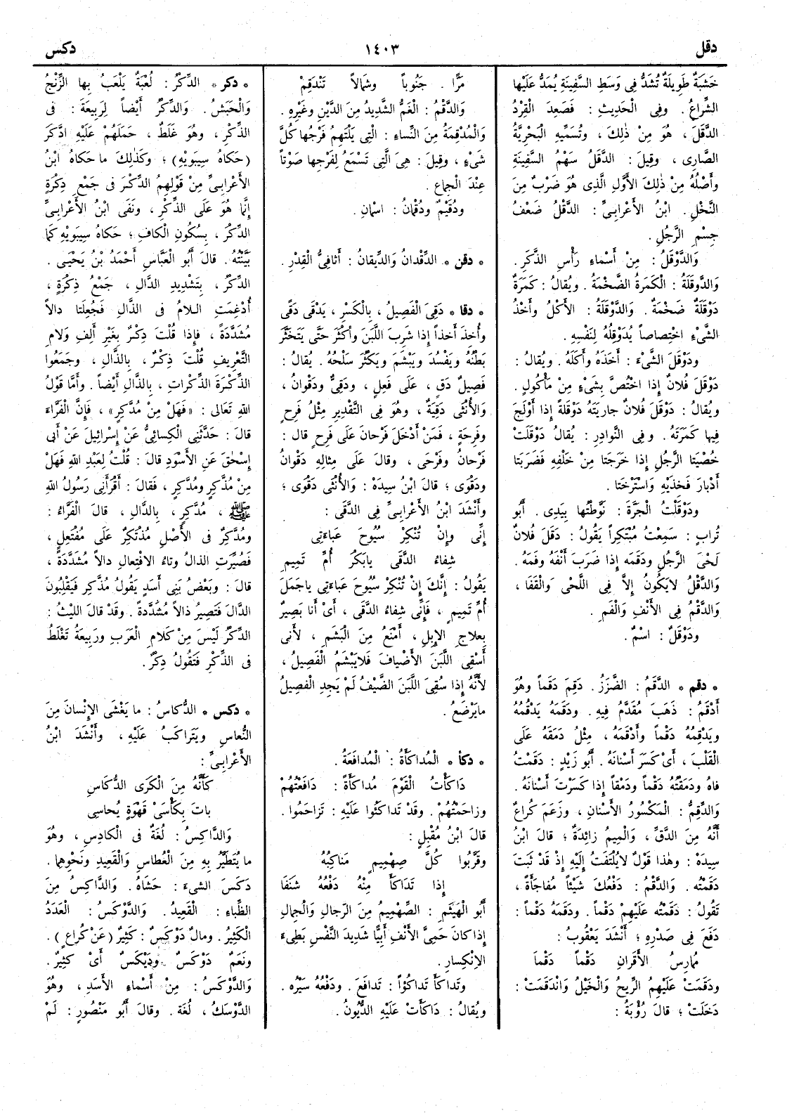 أَبو الهيثم الصِّهْمِيمُ من الرّجال والجِمال إِذا كانَ حَميَّ الأَنْفِ أَبِيّاً شدِيدَ النَّفْسِ بطِيءَ الانْكِسارِ وتَداكَأَ تَداكُؤاً تَدافَع ودَفْعُه سَيْرُه ويقال دَاكأَتْ عليه الدُّيون ( دكر ) الدِّكْرُ لُعْبَةٌ يلعب بها الزِّنْجُ والحَبَشُ والدِّكْرُ أَيضاً لربيعة في الذِّكْرِ وهو غلط حملهم عليه ادَّكَرَ حكاه سيبويه وكذلك ما حكاه ابن الأَعرابي من قولهم الدِّكْرُ في جمع دِكْرَة إِنما هو على الذِّكْر ونفى ابن الأَعرابي الدِّكْرَ بسكون الكاف حكاه سيبويه كما بينته قال أَبو العباس أَحمد ابن يحيى الدِّكْر بتشديد الدال جمع ذِكْرَةٍ أُدغمت اللام في الذال فجعلتا دالاً مشدّدة فإِذا قلت دِكْرٌ بغير أَلف ولام التعريف قلت ذكر بالذال وجمعوا الذِّكْرَةَ الذِّكْراتِ بالذال أَيضاً وأَما قول الله تعالى فهل من مُدَّكر فإِن الفراء قال حدثني الكسائي عن إِسرائيل عن أَبي إِسحق عن الأَسود قال قلت لعبدالله فهل من مُذّكِرٍ ومُدَّكِرٍ فقال أَقرأَني رسولُ الله صلى الله عليه وسلم مُدَّكِرٍ بالدال قال الفراء ومُدَّكر في الأَصل مُذْتَكِر على مُفْتَعِل فصيرت الذال وتاء الافتعال دالاً مشدّدة قال وبعض بني أَسد يقول مُذَّكِر فيقلبون الدال فتصير ذالاً مشدّدة وقد قال الليث الدِّكْرُ ليس من كلام العرب وربيعة تغلط في الذِّكْر فتقول دِكْرٌ
