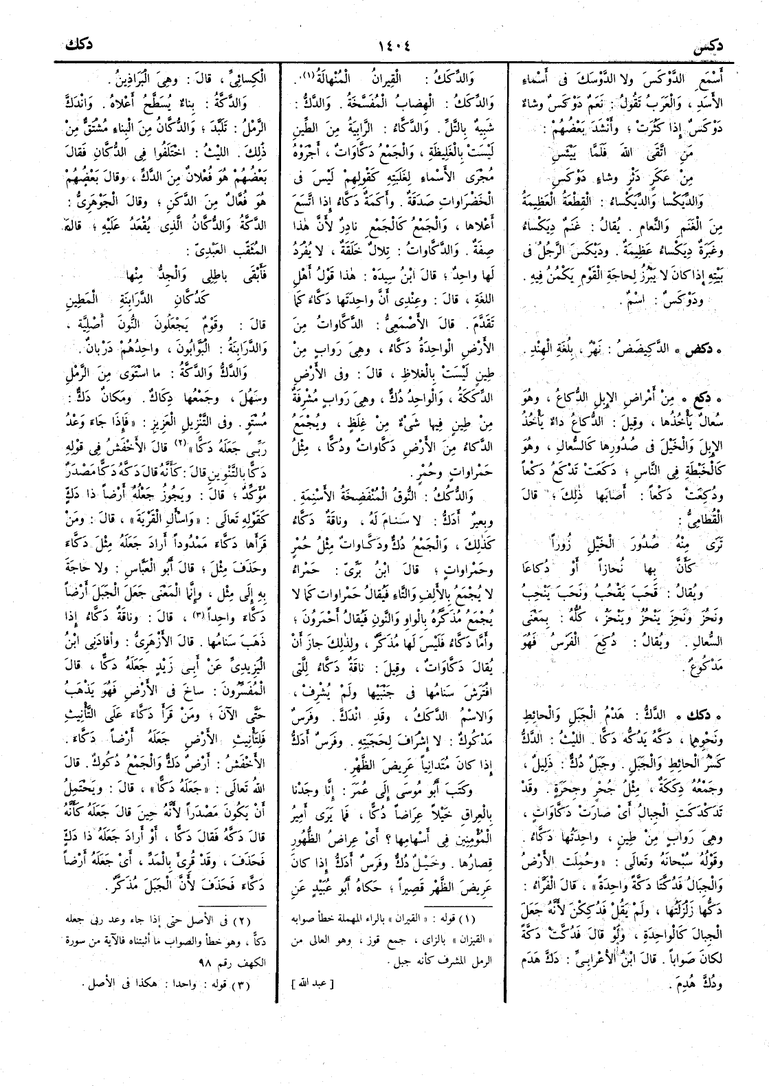( دكض ) الدَّكِيضَضُ نهر بلغة الهند ( دكع ) من أَمراض الإِبل الدُّكاعُ وهو سُعال يأْخذها وقيل الدُّكاع داء يأْخذ الإِبل والخيل في صدورها كالسُّعال وهو كالخَبْطةِ في الناس دَكَعَتْ تَدْكَعُ دَكْعاً ودُكِعَت دَكْعاً أَصابَها ذلك قال القُطامي تَرَى منه صُدورَ الخَيْلِ زُوراً كأَنَّ بها نُحازاً أَو دُكاعا ويقال قَحَب يَقْحُب ونَحَب يَنْحِب ونَحُزَ ونَحِزَ يَنْحُزُ ويَنْحَزُ كله بمعنى السُّعال ويقال دُكِع الفرس فهو مَدْكُوع ( دكك ) الدَّكُّ هدم الجبل والحائط ونحوهما دَكَّه يَدُكُّه دَكّاً الليث الدَّكّ كسر الحائط والجبل وجبل دُكٌّ ذليل وجمعه دِكَكَةٌ مثل جُحْر وجِحرَة وقد تَدَكْدَكَتِ الجبالُ أَي صارت دَكَّاوَات وهي رواب من طين واحدتها دَكَّاء وقوله سبحانه وتعالى وحُمِلت الأَرض والجبالُ فدُكَّتَا دَكَّةً واحدة قال الفراء دَكُّها زلزلتها ولم يقل فدكِكْنَ لأنه جعل الجبال كالواحدة ولو قال فدُكَّتْ دَكَّةً لكان صواباً قال ابن الإعرابي دَكَّ هَدَم ودُكَّ هُدِمَ والدِّكَكُ القيرانُ المُنْهالة والدِّكَكُ الهِضاب المفسَّخة والدَّكُّ شبيه بالتل والدَّكَّاءُ الرَّابية من الطين ليست بالغليظة والجمع دَكَّاوَاتٌ أَجروه مجرى الأسماء لغلبته كقولهم ليس في الخَضْرَاواتِ صدقة وأَكَمة دَكَّاء إذا اتسع أَعلاها والجمع كالجمع نادر لأن هذا صفة والدَّكَّاواتُ تلال خلقة لا يفرد لها واحد قال ابن سيده هذا قول أَهل اللغة قال وعندي أَن واحدتها دَكَّاءِ كما تقدم قال الأصمعي الدَّكَّاوَاتُ من الأَرض الواحدة دَكَّاء وهي رَوَابٍ من طين ليست بالغِلاظ قال وفي الأَرض الدِّكَكَةُ والواحد دُكّ وهي رََوابٍ مشرفة من طين فيها شيء من غلظ ويُجْمَع الدَّكَّاءُ من الأَرض دَكَّاوات ودُكّاً مثل حَمْراوات وحُمْر والدُّكُكُ النوق المنفضِخة الأَسْنِمَةِ وبعير أَدَكُّ لا سنام له وناقة دَكَّاءِ كذلك والجمع دُكّ ودَكَّاوات مثل حُمْر حُمْراوات قال ابن بري حَمْراء لا يجمعع بالألف والتاء فيقال حَمْراوات كما لا يجمع مذكره بالواو والنون فيقال أَحْمَرُون وأَما دَكَّاءِ فليس لها مذكر ولذلك جاز أَن يقال دَكَّاوَات وقيل ناقة دَكَّاءُ للتي افترش سنامها في جنبيها ولم يُشْرِف والاسم الدَّكَكُ وقد اندك وفرس مَدْكُوك لا إشْرَاف لِحَجَبَتِه وفرس أَدَكُّ إذا كان مُتدانياً عريض الظهر وكتب أبو موسى إلى عمر إنَّا وجدنا بالعِراق خيلاً عِرَاضاً دُكَّا فما يرى أَمير المؤمنين من أَسهامها أَي عِراض الظهور قصارها وخيل دُكٌّ وفرس أَدَكّ إذا كان عريض الظهر قصيراً حكاه أَبو عبيدة عن الكسائي قال وهي البَرَاذين والدَّكَّةُ بناء يسطح أَعلاه وانْدَكَّ الرمل تلبد والدُّكَّانُ من البناء مشتق من ذلك الليث اختلفوا في الدُّكَّان فقال بعضهم هو فَعْلان من الدَّكّ وقال بعضهم هو فُعّال من الدَّكَن وقال الجوهري الدَّكَّة والدُّكَّانُ الذي يقعد عليه قال المُثَقّب العبدي فأَبقَى باطِلِي والجِدُّ منها كدُكَّآنِ الدَّرَابِنَةِ المَطِين قال وقوم يجعلون النون أَصلية والدَّرَابِنَة البَوَّابُون واحدهم دَرْبانٌ والدَّكُّ والدَّكَّةُ ما استوى من الرمل وسهل وجمعها دِكاكٌ ومكان دَكٌّ مسْتَوٍ وفي التزيل العزيز حتى إِذا جاء وعد ربي جعله دَكّاً قال الأَخفش في قوله دَكّاً بالتنوين قال كأَنه قال دَكَّهُ دَكّاً مصدر مؤَكد قال ويجوز جعله أَرضاً ذا دَكٍّ كقوله تعالى واسأَلِ القريةَ قال ومن قرأَها دَكَّاءَ ممدوداً أَراد جَعَله مثل دَكَّاءَ وحذف مثل قال أَبو العباس ولا حاجة به إلى مثل وإِنما المعنى جعل الجبل أَرضاً دَكَّاء واحداً