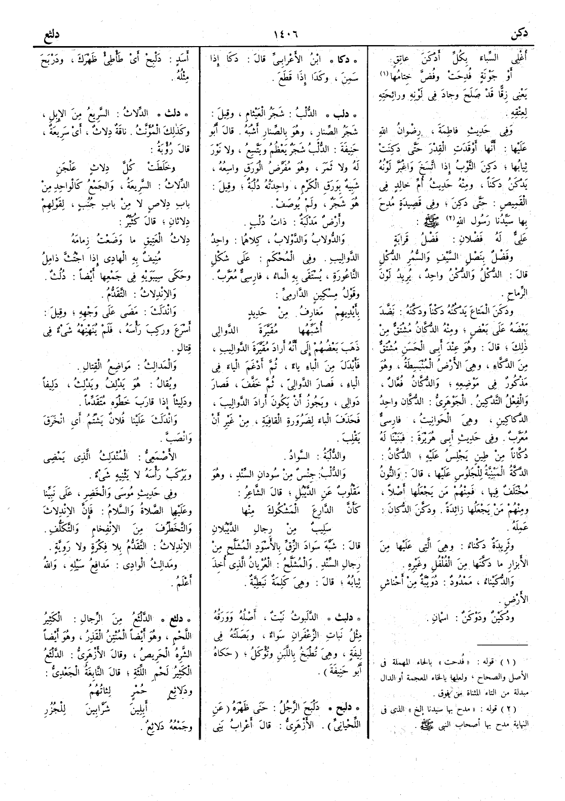 ( دكا ) ابن الأَعرابي قال دَكا إذا سَمِنَ وكَذَا إذا قَطَع ( دلب ) الدُّلْبُ شجر العَيْثام وقيل شجر الصِّنار وهو بالصِّنار أَشْبَهُ قال أَبو حنيفة الدُّلْبُ شجر يعظم ويَتَّسِع ولا نَوْرَ له ولا ثمر وهو مُفَرَّضُ الوَرَقِ واسِعُه شبيه بورق الكَرْم واحدتُه دُلْبة وقيل هو شجر ولم يوصف وأَرضٌ مَدْلَبةٌ ذاتُ دُلْبٍ والدُّولابُ والدَّوْلابُ كلاهما واحد الدَوالِيبِ وفي المحكم على شكل النَّاعُورةِ يُسْتقَى به الماءُ فارسيّ معرّب وقول مسْكِين الدارمي