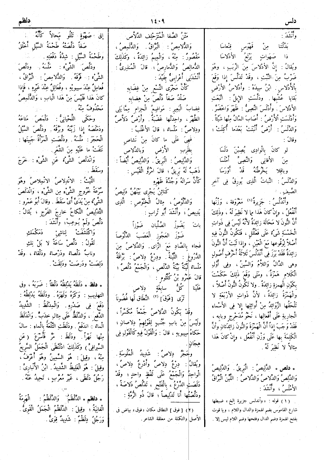 ( دلص ) الدَّلِيصُ البَرِيقُ والدَّلِيصُ والدَّلِصُ والدِّلاصُ والدَّلاصُ اللَّيِّنُ البَرّاقُ الأَملس وأَنشد مَتْن الصَّفا المُتَزَحْلِف الدَّلاّص والدُّلامِصُ البرّاق والدُّلَمِصُ مقصور منه والميم زائدة وكذلك الدُّمالِصُ والدُّمارِصُ قال المنذري أَنشدني أَعرابي بِفَيْد كأَن مَجْرى النِّسْع من غِضَابِهِ صَلْدُ صَفاً دُلِّصَ من هِضابِهِ غضاب البعير مواضع الحزام مما يلي الظهر واحدتها غَضْبة وأَرضٌ دَلاّصٌ ودِلاصٌ مَلْساءِ قال الأَغلب فهي على ما كان مِنْ نَشاصِ بِظَرِب الأَرضِ وبالدِّلاصِ والدَّلِيصُ البَرِيقُ والدَّلِيصُ أَيضاً ذهَبٌ له بَرِيقٌ قال امرؤ القيس كأَنّ سَراتَه وجُدّةَ ظَهْرِه كَنائِنُ يَجْري بينهنّ دَلِيصُ والدِّلَّوْصُ مثال الخِنَّوْصِ الذي يَدِيصُ وأَنشد أَبو تراب باتَ يَضُوزُ الصِّلِّيانَ ضَوْزاً ضَوْزَ العَجُوزِ العَصَبَ الدِّلَّوْصا فجاء بالصاد مع الزاي والدِّلاصُ من الدُّروع الليّنة ودِرعٌ دِلاصٌ برّاقة ملساء ليّنة بَيّنةُ الدَّلَصِ والجمع دُلُصٌ قال عمرو بن كلثوم علينا كلُّ سابِغَةٍ دِلاصٍ ترى فوق النِّطاق لها غُضونا وقد يكون الدِّلاصُ جمعاً مكسَّراً وليس من باب جُنُب لقولهم دِلاصان حكاه سيبويه قال والقول فيه كالقول في هِجَان وحَجر دِلاصٌ شديد المُلُوسة ويقال دِرْعٌ دِلاصٌ وأَدْرُعٌ دِلاصٌ الواحد والجمع على لفظ واحد وقد دَلَصَت الدِّرْعُ بالفتح تَدْلُصُ دَلاصةً ودَلَّصْتُها أَنا تَدْلِيصاً قال ذو الرمة إِلى صَهْوةٍ تَتْلُو مَحالاً كأَنّه صَفاً دَلّصَتْه طَحْمةُ السيلِ أَخْلَقُ وطَحْمةُ السيلِ شدّة دَفْعتِه ودَلَّص الشيءَ مَلّسَه ودَلّص الشيءَ فَرّقَه والدُّلامِصُ البرّاق فُعامِلٌ عند سيبويه وفُعَالِلٌ عند غيره فإِذا كان هذا فليس من هذا الباب والدُّلَمِصُ محذوف منه وحكى اللحياني دَلْمَصَ مَتاعَه ودَمْلَصه إِذا زيّنَه وبَرّقَه ودَلّصَ السيلُ الحجَر مَلّسَه ودَلّصَت المرأَةُ جَبِينَها نتفت ما عليه من الشعر وانْدَلَصَ الشيءُ عن الشيءِ خرج وسقط الليث الانْدِلاصُ الانْمِلاصُ وهو سُرْعةُ خروج الشيء من الشيء وانْدَلَصَ الشيء من يَدي أَي سقط وقال أَبو عمرو التَّدْلِيصُ النِّكاحُ خارجَ الفَرْج يقال دَلَّصَ ولم يُوعِبْ وأَنشد واكتَشَفَتْ لناشِئٍ دَمَكْمَكِ تقول دَلِّصْ سَاعةً لا بَلْ نِكِ ونابٌ دَلْصاءُ ودَرْصاءُ ودَلْقَاء وقد دَلِصَتْ ودَرِصَت ودَلِقَت