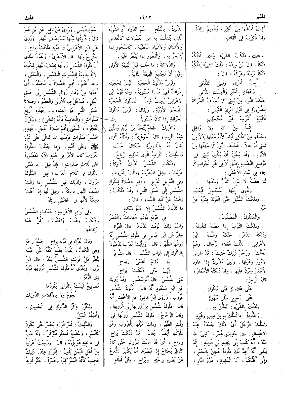 أكلت أسنانها من الكِبَرِ والميم زائدة وقد ذكرت في القاف ( دلك ) دَلَكْتُ الشيءَ بيدي أَدْلُكه دَلْكاً قال ابن سيده دَلَكَ الشيءَ يَدْلُكه دَلْكاً مَرَسه وعَرَكه قال أَبِيتُ أَسْري وتَبِيتي تَدْلُكي وَجْهكِ بالعَنْبَرِ والمِسْكِ الذَّكِي حذف النون من تَبِيتي كما تحذف الحركة للضرورة في قول امرئ القيس فاليومَ أَشْرَبْ غيرَ مُسْتَحْقِب إِثْماً من الله ولا وَاغِلِ وحذفها من تَدْلُكي أَيضاً لأَنه جعلها بدلاً من تَبِيتي أَو حالاً فحذف النون كما حذفها من الأَول وقد يجوز أَن يكون تَبِيتي في موضع النصب بإِضمار أَن في غير الجواب كما جاء في بيت الأَعشى لنا هَضْبة لا ينزل الذُّلُّ وَسْطها ويأْوِي إِليها المُسْتَجِيرُ فيُعْصَبا وَدَلَكْت السنبل حتى انفرك قِشره عن حَبِّه والمَدْلُوك المصقول ودَلَكْتُ الثوب إذا مُصْتَه لتغسله ودَلَكهُ الدهرُ حَنَّكه وعلَّمه ابن الأعرابي الدُّلُك عقلاء الرجال وهم الحُنُك ورجل دَلِيك حَنِيك قد مارس الأُمور وعَرَفها وبعير مَدْلُوك إذا عاوَدَ الأسفار ومرن عليها وقد دَلَكَتْه الأسفارُ قال الراجز على عَلاواكِ على مَدْلُوكِ على رَجِيعِ سَفَرٍ مَنْهوكِ وتَدَلَّك بالشيء تَخَلَّق به والدَّلُوك ما تُدُلِّك به من طيب وغيره وتَدَلَّكَ الرجل أَي دَلَكَ جسده عند الإغتسال وفي حديث عمر رضي الله عنه أَنه كتب إلى خالد بن الوليد إنه بلغني أَنه أُعِدَّ لك دَلُوك عُجِنَ بالخمر وإني أَظنكم آل المُغيرة ذَرْوَ النارِ الدَّلُوك بالفتح اسم الدواء أَو الشيء الذي يُتَدَلَّك به من الغَسُولات كالعَدَس والأُشْنان والأَشْياء المطيبة كالسَّحُور لما يُتَسَحَّر به والفَطُور لما يفطر عليه والدُّلاكةُ ما حُلِب قبل الفِيقة الأُولى وقبل أَن تجتمع الفِيقة الثانية وفرس مَدْلُوك الحَجَبة ليس لِحَجَبته إشراف فهي مَلْساء مستوية ومنه قول ابن الأَعرابي يصف فرساً المَدْلُوك الحَجَبةِ الضخم الأَرْنَبةِ ويقال فرس مَدْلُوك الحَرْقَفة إذا كان مستوياً والدَّلِيكُ طعام يتخذ من الزُّبْدِ واللبن شبه الثريد قال الجوهري وأَظنه الذي يقال له بالفارسية جَنْكال خُسْت والدَّلِيكُ التراب الذي تَسْفِيه الرياح ودَلَكَت الشمسُ تَدْلُك دُلوكاً غربت وقيل اصفرَّت ومالت للغروب وفي التزيل العزيز أَقِم الصلاة لدُلُوك الشمس إلى غَسَق الليل وقد دَلَكَتْ زالت عن كَبِدِ السماء قال ما تَدْلُكُ الشمسُ إلا حَذْوَ منْكبِهِ في حَوْمةٍ دونها الهاماتُ والقَصَرُ واسم ذلك الوقت الدَّلَكُ قال الفراء جابر عن ابن عباس في دُلُوك الشمس أنه زوالها الظهرَ قال ورأَيت العرب يذهبون بالدُّلُوك إلى غياب الشمس قال الشاعر هذا مُقامُ قَدَمَيْ رَباحِ ذَبَّبَ حتى دَلَكَتْ بَراحِ يعني الشمس قال أَبومنصور وقد روينا عن ابن مسعود أَنه قال دُلُوك الشمس غروبها وروى ابن هانئ عن الأَخفش أَنه قال دُلُوك الشمس من زوالها إلى غروبها وقال الزجاج دُلُوك الشمس زوالها في وقت الظهر وذلك ميلها للغروب وهو دُلُوكها أَيضاً يقال قد دلَكَتْ بَراحِ وبِراحِ أي قد مالت للزوال حتى كاد الناظر يحتاج إذا تَبَصَّرها أَن يكسر الشُّعاع عن بصره براحته وبَراحِ مثل قطامِ اسم للشمس وروي عن نافع عن ابن عمر قال دُلُوكها ميلها بعد نصف النهار وروي عن ابن الأَعرابي في قوله دَلَكَتْ بِراحِ استريح منها قال الأَزهري والقول عندي أَن دُلوك الشمس زوالها نصف النهار لتكون الآية جامعة للصلوات الخمس والمعنى والله أَعلم أَقِم الصلاة يا محمد أَي أَدِمْها من وقت زوال الشمس إلى غسق الليل فيدخل فيها الأولى والعصر وصلاتا غَسَقِ الليل هما العشاءَان فهذه أَربع صلوات والخامسة قوله وقرآنَ الفَجْر المعنى وأَقم صلاة الفجر فهذه خمس صلوات فرضها الله تعالى على نبيه صلى الله عليه وسلم وعلى أَمته وإذا جعلت الدُّلُوك الغروب كان الأَمر في هذه الآية مقصوراً على ثلاث صلوات فإن قيل ما معنى الدُّلوك في كلام العرب ؟ قيل الدُّلوك الزوال ولذلك قيل للشمس إذا زالت نصف الن