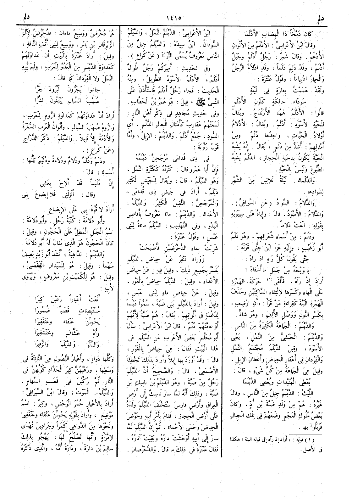 كان دَمْخاً ذا الهِضابِ الأَدْلَمَا وقال ابن الأَعرابي الأَدْلَمُ من الألوان الأَدْغَمُ وقال شمر رجل أَدْلَمُ وجبل أَدْلَمُ وقد دَلِمَ دَلَماً وقد ادْلامَّ الرجلُ والحمار ادْلِيماماً وقول عنترة ولقد هَمَمْتُ بِغارةٍ في ليلةٍ سَوْداءَ حالِكةٍ كلَوْنِ الأَدْلَمِ قالوا الأَدْلَمُِ ههنا الأَرَنْدَجُ ويقال للحية الأسود أَدْلَمُ ويقال الأَدْلامُ أَولاد الحيّات واحدها دُلْمٌ ومن أَمثالهم أشدُّ من دَلَمٍ يقال إنه يشبه الحيَّة يكون بناحية الحجاز الدَّلَمُ يشبه الطَّبُّوعَ وليس بالحية والدَّلْماءُ ليلة ثلاثين من الشهر لسوادها والدَّلامُ السواد عن السيرافي والدَّلامُ الأسود قال وإياه عنى سيبويه بقوله انْعَتْ دَلاماً