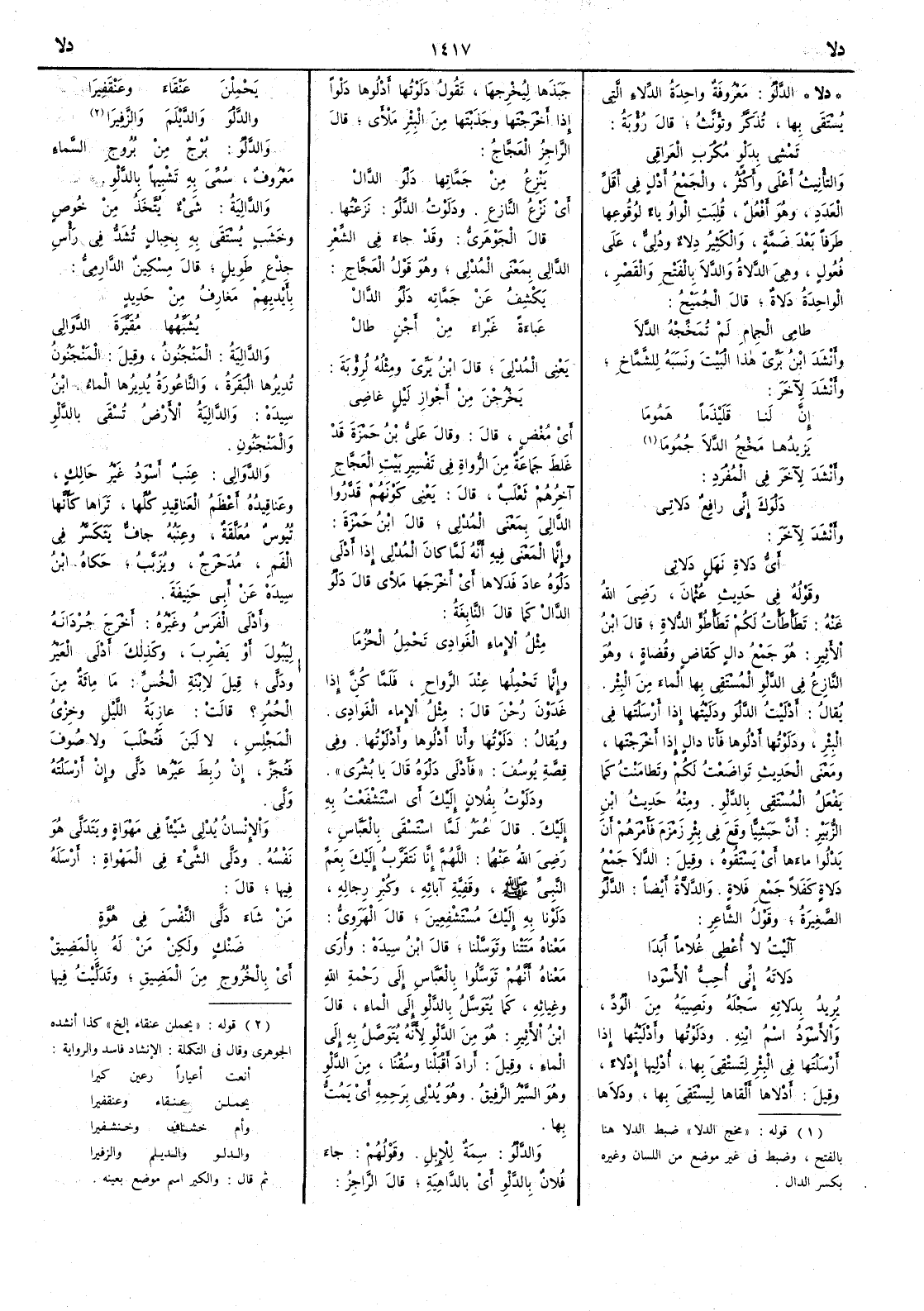 وأَنشد لآخر في المفرد دَلْوَكَ إني رافعٌ دَلاتي وأَنشد لآخر أَيُّ دَلاةِ نَهَلٍ دَلاتي وقوله في حديث عثمان رضي الله عنه تَطَأْطَأْت لكم تَطَأْطُؤَ الدُّلاة قال ابن الأَثير هو جَمْع دالٍ كقاضٍ وقُضاةٍ وهو النازِعُ في الدَّلْوِ المُسْتَقِي بها الماءَ من البئر يقال أَدْلَيْتُ الدَّلْوَ ودَليْتُها إذا أَرسلتها في البئر ودَلَوْتها أَدْلُوها فأَنا دالٍ إذا أَخرجْتها ومعنى الحديث تواضعت لكم وتَطامَنْتُ كما يَفْعَل المُستقي بالدَّلْوِ ومنه حديث ابن الزبير أَن حبَشِيّاً وقع في بئرِ زمزم فأَمرَهُم أَن يَدْلُوا ماءَها أَي يَسْتَقُوه وقيل الدَّلا جمعُ دَلاةٍ كفَلاً جمع فَلاةٍ والدَّلاة أَيضاً الدَّلْوُ الصغيرة وقول الشاعر آلَيْتُ لا أُعْطِي غُلاماً أَبَدَا دَلاتَهُ إني أُحِبُّ الأَسْوَدا يريد بِدَلاتِه سَجْلَه ونَصِيبَه من الوُدِّ والأَسْوَدُ اسمُ ابنِه ودَلَوْتُها وأَدْلَيْتُها إذا أَرْسَلْتها في البئر لِتَسْتَقِيَ بها أُدْليها إدلاءً وقيل أَدْلاها أَلْقاها لِيَسْتَقِيَ بها ودَلاها جَبَذها ليُخْرِجَها تقول دَلَوْتها أَدْلُوها دَلْواً إذا أَخرجَتها وجَذَبْتَها من البئر مَلأى قال الراجز العجاج يَنْزِعُ من جَمَّاتِها دَلْوُ الدَّال أََي نَزْعُ النازعِ ودَلَوْتُ الدَّلْوَ نَزَعْتُها قال الجوهري وقد جاء في الشعر الدَّالي بمعنى المُدْلي وهو قول العجاج يَكْشِفُ عن جَمَّاتِه دَلْوُ الدَّالْ عَباءةً غَبْراءَ من أَجْنٍ طالْ يعني المُدْليَ قال ابن بري ومثله لرؤبة يَخْرُجْنَ من أَجْوازِ لَيْلٍ غاضي أي مُغْضٍ قال وقال عليّ بن حمزة قد غلط جماعة من الرُّواة في تفسير بيت العجاج آخرهم ثعلب قال يعني كونهم قَدَّرُوا الدَّاليَ بمعنى المُدْلي قال ابن حمزة وإنما المعنى فيه أَنه لما كان المُدْلي إذا أَدْلى دَلْوَه عادَ فَدَلاها أَي أَخرجها مَلأَى قال دَلْوُ الدَّالْ كما قال النابغة مِثْل الإماء الغَوادِي تَحْمِلُ الحُزُما وإنما تحملها عند الرَّواح فلما كُنَّ إذا غَدَوْنَ رُحْنَ قال مثل الإماء الغَوادِي ويقال دَلَوْتُها وأَنا أَدْلُوها وأَدْلَوْتُها وفي قصة يوسف فأَدْلَى دَلْوَهُ قال يا بُشْرَى ودَلَوْتُ بفلان إليك أَي اسْتَشْفَعْتُ به إليك قال عمر لما اسْتَسْقَى بالعباس رضي الله عنهما اللهم إنا نَتَقَرَّبُ إليك بعَمِّ النبي صلى الله عليه وسلم وقَفِيَّةِ آبائِه وكُبْرِ رِجالهِ دَلَوْنا به إليكَ مُسْتَشْفِعين قال الهروي معناه مَتَتْنا وتَوَسَّلْنا قال ابن سيده وأُرَى معناه أَنهم تَوَسَّلُوا بالعباس إلى رَحْمةِ الله وغِياثِه كما يُتَوَسَّل بالدَّلْوِ إلى الماء قال ابن الأَثير هو من الدَّلْوِ لأَنه يُتَوَصَّلُ به إلى الماء وقيل أَراد به أَقْبَلْنا وسُقْنَا من الدَّلْوِ وهو السَّيْرُ الرَّفِيقُ وهو يُدْلي برَحِمِه أَي يَمُتُّ بها والدَّلْوُ سِمَةٌ للإبل وقولهم جاء فلانٌ بالدَّلْوِ أَي بالدَّاهِيةِ قال الراجز يَحْمِلْنَ عَنْقَاءَ وعَنْقَفِيرَا والدَّلْوَ والدَّيْلَم والزَّفِيرَ