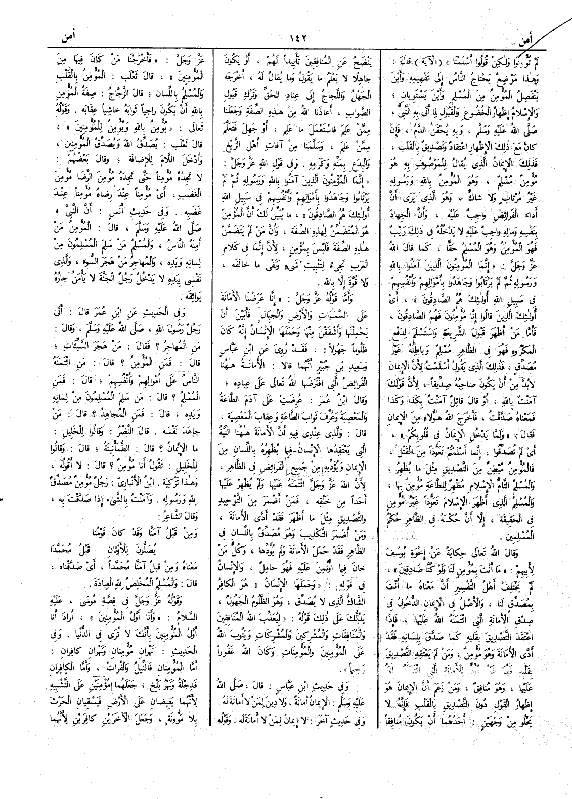 لَمْ تُؤْمِنوا ولكن قولوا أَسْلمنا ( الآية ) قال وهذا موضع يحتاج الناس إلى تَفْهيمه وأَين يَنْفَصِل المؤمِنُ من المُسْلِم وأَيْنَ يَسْتَويانِ والإسْلامُ إظهارُ الخضوع والقبول لما أَتى به النبي صلى الله عليه وسلم وبه يُحْقَنُ الدَّمُ فإن كان مع ذلك الإظْهارِ اعتِقادٌ وتصديق بالقلب فذلك الإيمانُ الذي يقال للموصوف به هو مؤمنٌ مسلمٌ وهو المؤمنُ بالله ورسوله غير مُرْتابٍ ولا شاكٍّ وهو الذي يرى أَن أَداء الفرائض واجبٌ عليه وأَن الجِهادَ بنفسِه وماله واجبٌ عليه لا يدخله في ذلك رَيْبٌ فهو المؤمنُ وهو المسلمُ حقّاً كما قال الله عز وجل إنما المؤمنون الذين آمنوا بالله ورسوله ثم لم يَرتابوا وجاهدوا بأَموالهم وأَنفسِهم في سبيل الله أُولئك هم الصادقون أَي أُولئك الذين قالوا إنّا مؤمنون فهم الصادقون فأَما من أَظهرَ قَبولَ الشريعة واسْتَسْلَم لدفع المكروه فهو في الظاهر مُسْلمٌ وباطِنُه غيرُ مصدِّقٍ فذلك الذي يقول أَسْلَمْتُ لأَن الإيمان لا بدّ من أَن يكون صاحبُه صِدِّيقاً لأَن قولَكَ آمَنْتُ بالله أَو قال قائل آمَنْتُ بكذا وكذا فمعناه صَدَّقْت فأَخْرج الله هؤلاء من الإيمان فقال ولَمّا يدْخل الإيمانُ في قُلوبِكم أَي لم تُصدِّقوا إنما أَسْلَمْتُمْ تَعَوُّذاً من القتل فالمؤمنُ مُبْطِنٌ من التصديق مثلَ ما يُظْهِرُ والمسلمُ التامُّ الإسلامِ مُظْهرٌ للطاعة مؤمنٌ بها والمسلمُ الذي أَظهر الإسلامَ تعوُّذاً غيرُ مؤمنٍ في الحقيقة إلاّ أَن حُكْمَه في الظاهر حكمُ المسلمين وقال الله تعالى حكاية عن إخْوة يوسف لأَبيهم ما أَنت بمُؤْمِنٍ لنا ولو كُنّا صادقين لم يختلف أَهل التفسير أَنّ معناه ما أَنت بمُصدِّقٍ لنا والأَصلُ في الإيمان الدخولُ في صِدْقِ الأَمانةِ التي ائْتَمَنه الله عليها فإذا اعتقد التصديقَ بقلبه كما صدَّقَ بلِسانِه فقد أَدّى الأَمانةَ وهو مؤمنٌ ومن لم يعتقد التصديق بقلبه فهو غير مؤدٍّ للأَمانة التي ائتمنه الله عليها وهو مُنافِقٌ ومَن زعم أَن الإيمان هو إظهار القول دون التصديقِ بالقلب فإنه لا يخلو من وجهين أَحدهما أَن يكون مُنافِقاً يَنْضَحُ عن المنافقين تأْييداً لهم أَو يكون جاهلاً لا يعلم ما يقول وما يُقالُ له أَخْرَجَه الجَهلُ واللَّجاجُ إلى عِنادِ الحقِّ وتَرْكِ قبولِ الصَّوابِ أَعاذنا الله من هذه الصفة وجعلنا ممن عَلِم فاسْتَعْمل ما عَلِم أَو جَهِل فتعلّم ممن عَلِمَ وسلَّمَنا من آفات أَهل الزَّيْغ والبِدَع بمنِّه وكرمه وفي قول الله عز وجل إنما المؤمنون الذين آمَنوا بالله ورسوله ثم لَمْ يرتابوا وجاهَدوا بأَموالِهِم وأَنفسِهم في سبيل الله أُولئك هم الصادقون ما يُبَيّنُ لك أَن المؤمنَ هو المتضمّن لهذه الصفة وأَن مَن لم يتضمّنْ هذه الصفة فليس بمؤمنٍ لأَن إنما في كلام العرب تجيء لِتَثْبيتِ شيءٍ ونَفْيِ ما خالَفَه ولا قوّةَ إلا بالله وأَما قوله عز وجل إنا عَرَضْنا الأَمانةَ على السموات والأَرضِ والجبالِ فأَبَيْنَ أَن يَحْمِلْنَها وأَشْفَقْنَ منها وحمَلَها الإنسانُ إنه كان ظَلُوماً جهولاً فقد روي عن ابن عباس وسعيد بن جبير أَنهما قالا الأَمانةُ ههنا الفرائضُ التي افْتَرَضَها الله تعالى على عباده وقال ابن عمر عُرِضَت على آدمَ الطاعةُ والمعصيةُ وعُرِّفَ ثوابَ الطاعة وعِقَابَ المعْصية قال والذي عندي فيه أَن الأَمانة ههنا النِّيّةُ التي يعتقدها الإنسان فيما يُظْهِره باللّسان من الإيمان ويؤَدِّيه من جميع الفرائض في الظاهر لأَن الله عز وجل ائْتَمَنَه عليها ولم يُظْهِر عليها أَحداً من خَلْقِه فمن أَضْمر من التوحيد والتصديق مثلَ ما أَظهرَ فقد أَدَّى الأَمانةَ ومن أَضمَر التكذيبَ وهو مُصَدِّقٌ باللسان في الظاهر فقد حَمَل الأَمانةَ ولم يؤدِّها وكلُّ مَنْ خان فيما اؤتُمِنَ عليه فهو حامِلٌ والإنسان في قوله وحملها الإنسان هو الكافر الشاكُّ الذي لا يُصدِّق وهو الظَّلُوم الجهُولُ يَدُلُّك على ذلك قوله ليُعَذِّبَ اللهُ المُنافقينَ والمُنافقات وال