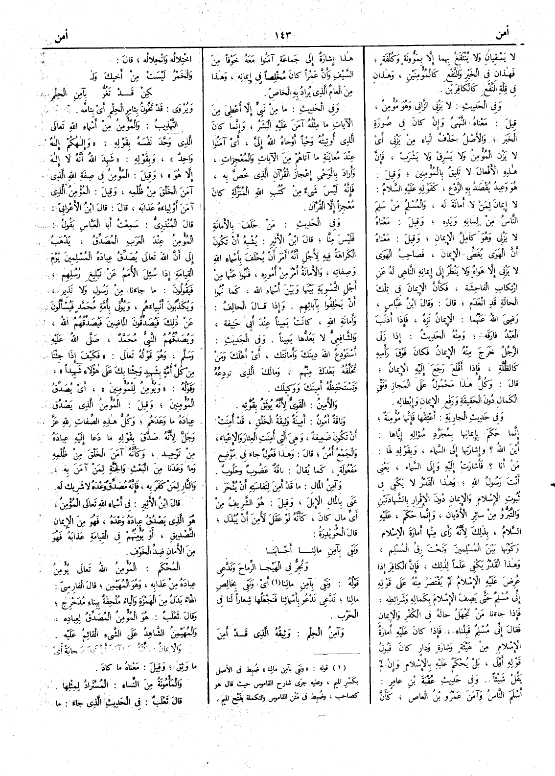لا يسقِيانِ ولا يُنْتَفَعُ بهما إلا بمؤونة وكُلفةٍ فهذان في الخيرِ والنفعِ كالمُؤْمِنَيْنِ وهذان في قلَّة النفع كالكافِرَين وفي الحديث لا يَزْني الزاني وهو مُؤْمِنٌ قيل معناه النَّهْي وإن كان في صورة الخبر والأَصلُ حذْفُ الياء من يَزْني أَي لا يَزْنِ المؤمنُ ولا يَسْرِقُ ولا يَشْرَبْ فإن هذه الأَفعال لا تليقُ بالمؤمنين وقيل هو وعيدٌ يُقْصَدُ به الرَّدْع كقوله عليه السلام لا إيمانَ لمنْ لا أمانة له والمُسْلِمُ مَنْ سَلِمَ الناسُ من لِسانِه ويدِه وقيل معناه لا يَزْني وهو كاملُ الإيمانِ وقيل معناه أَن الهوى يُغطِّي الإيمانَ فصاحِبُ الهَوى لا يَزني إلاّ هواه ولا ينْظُر إلى إيمانه الناهي له عن ارتكابِ الفاحشة فكأَنَّ الإيمانَ في تلك الحالة قد انْعَدم قال وقال ابن عباس رضي الله عنهما الإيمانُ نَزِهٌ فإذا أَذْنَبَ العبدُ فارَقَه ومنه الحديث إذا زَنَى الرجلُ خرجَ منه الإيمانُ فكان فوقَ رأْسه كالظُّلَّةِ فإذا أَقْلَع رجَع إليه الإيمانُ قال وكلُّ هذا محمول على المجاز ونَفْي الكمالِ دون الحقيقة ورفع الإيمان وإِبْطالِه وفي حديث الجارية أعْتِقُها فإنها مُؤمِنةٌ إنما حكَمَ بإيمانِها بمُجرَّد سُؤاله إياها أَين الله ؟ وإشارَتِها إلى السماء وبقوله لها مَنْ أَنا ؟ فأَشارت إليه وإلى السماء يعني أنْتَ رسولُ الله وهذا القدر لا يكفي في ثبوت الإسلام والإيمان دون الإقرار بالشهادَتَيْن والتبرِّي من سائر الأَديان وإنما حكم عليه السلام بذلك لأَنه رأى منها أَمارة الإسلام وكوْنَها بين المسلمين وتحت رِقِّ المُسْلِم وهذا القدر يكفي علَماً لذلك فإن الكافر إذا عُرِضَ عليه الإسلامُ لم يُقْتَصَرْ منه على قوله إني مُسْلِمٌ حتى يَصِفَ الإسلامَ بكماله وشرائِطه فإذا جاءنا مَنْ نَجْهَل حالَه في الكفر والإيمان فقال إني مُسْلِم قَبِلْناه فإذا كان عليه أَمارةُ الإسلامِ من هَيْئَةٍ وشارةٍ ودارٍ كان قبولُ قوله أَولى بل يُحْكَمُ عليه بالإسلام وإنْ لم يَقُلْ شيئاً وفي حديث عُقْبة بن عامر أَسْلم الناسُ وآمَنَ عمرُو بن العاص كأَنَّ هذا إشارةٌ إلى جماعةٍ آمَنوا معه خوفاً من السيف وأنَّ عَمْراً كان مُخْلِصاً في إيمانه وهذا من العامّ الذي يُرادُ به الخاصّ وفي الحديث ما مِنْ نبيٍّ إلاَّ أُعْطِيَ منَ الآياتِ ما مثلُه آمَنَ عليه البَشَرُ وإنما كان الذي أُوتِيتُهُ وحْياً أَوْحاهُ اللهُ إليَّ أَي آمَنوا عند مُعايَنة ما آتاهم من الآياتِ والمُعْجِزات وأَراد بالوَحْيِ إعْجازَ القرآن الذي خُصَّ به فإنه ليس شيء من كُتُبِ الله المُنزَّلة كان مُعْجِزاً إلا القرآن وفي الحديث مَنْ حَلَف بالأَمانةِ فليس مِنَّا قال ابن الأَثير يشبه أَن تكون الكراهةُ فيه لأجل أَنه أُمِر أَن يُحْلَفَ بأَسماءِ الله وصفاتِه والأَمانةُ أَمرٌ من أُمورِه فنُهُوا عنها من أَجل التسوية بينها وبين أَسماء الله كما نُهوا أَن يحلِفوا بآبائهم وإذا قال الحالفُ وأَمانةِ الله كانت يميناً عند أَبي حنيفة والشافعيُّ لا يعدُّها يميناً وفي الحديث أَسْتَوْدِعُ الله دينَكَ وأمانتَكَ أَي أَهلك ومَنْ تُخَلِّفُه بَعْدَكَ منهم ومالَكَ الذي تُودِعُه وتستَحْفِظُه أَمِينَك ووكِيلَكَ والأَمينُ القويُّ لأَنه يُوثَقُ بقوَّتِه وناقةٌ أَمون أَُمينةٌ وثِيقةُ الخَلْقِ قد أُمِنَتْ أَن تكون ضعيفةً وهي التي أُمِنتْ العِثَارَ والإعْياءَ والجمع أُمُنٌ قال وهذا فعولٌ جاء في موضع مَفْعولةٍ كما يقال ناقة عَضوبٌ وحَلوبٌ وآمِنُ المالِ ما قد أَمِنَ لنفاسَتِه أَن يُنْحَرَ عنَى بالمال الإبلَ وقيل هو الشريفُ من أَيِّ مالٍ كانَ كأَنه لو عَقَلَ لأَمِنَ أَن يُبْذَل قال الحُوَيْدرة ونَقِي بآمِنِ مالِنا أَحْسابَنا ونُجِرُّ في الهَيْجا الرِّماحَ وندَّعي قولُه ونَقِي بآمِنِ مالِنا