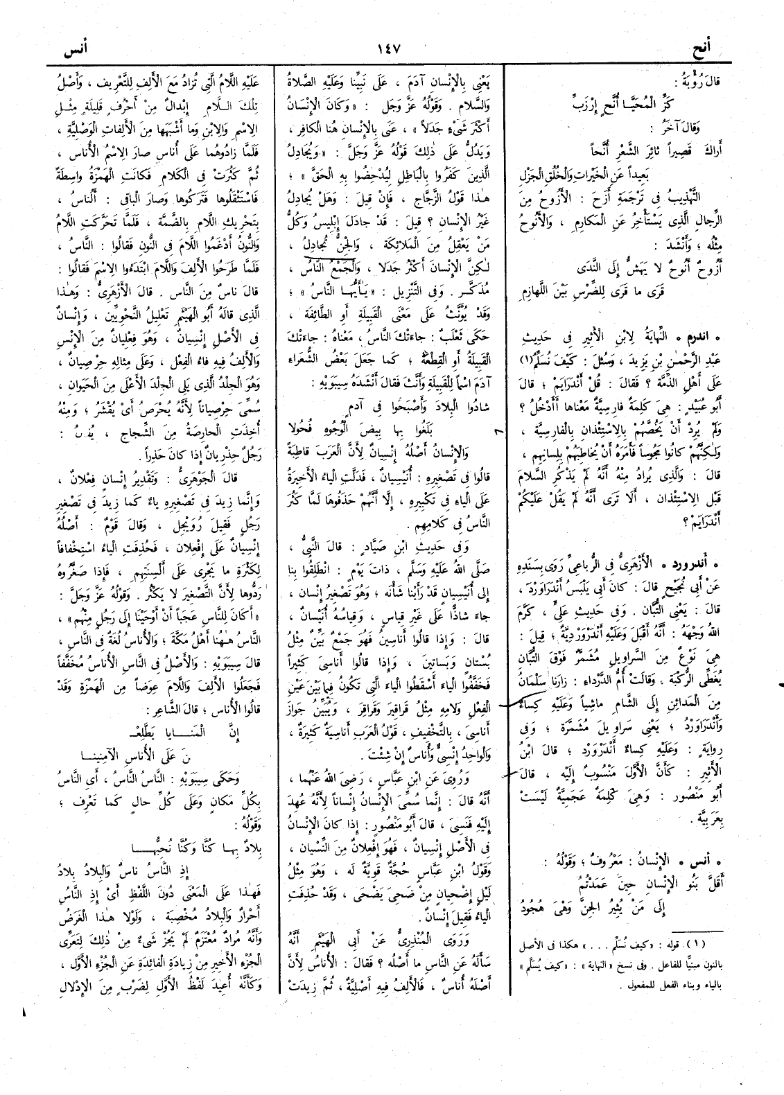 ( أنس ) الإِنسان معروف وقوله أَقَلْ بَنو الإِنسانِ حين عَمَدْتُمُ إِلى من يُثير الجنَّ وهي هُجُودُ يعني بالإِنسان آدم على نبينا وعليه الصلاة والسلام وقوله عز وجل وكان الإِنسانُ أَكْثَرَ شيء جَدَلاً عنى بالإِنسان هنا الكافر ويدل على ذلك قوله عز وجل ويُجادِلُ الذين كفروا بالباطل لِيُدْحِضُوا به الحقَّ هذا قول الزجّاج فإِن قيل وهل يُجادل غير الإِنسان ؟ قيل قد جادل إِبليس وكل من يعقل من الملائكة والجنُّ تُجادل لكن الإِنسان أَكثر جدلاً والجمع الناس مذكر وفي التنزيل يا أَيها الناسُ وقد يؤنث على معنى القبيلة أَو الطائفة حكى ثعلب جاءَتك الناسُ معناه جاءَتك القبيلة أَو القطعة كما جعل بعض الشعراء آدم اسماً للقبيلة وأَنت فقال أَنشده سيبويه شادوا البلادَ وأَصْبَحوا في آدمٍ بَلَغوا بها بِيضَ الوُجوه فُحُولا والإِنسانُ أَصله إِنْسِيانٌ لأَن العرب قاطبة قالوا في تصغيره أُنَيْسِيانٌ فدلت الياء الأَخيرة على الياء في تكبيره إِلا أَنهم حذفوها لما كثر الناسُ في كلامهم وفي حديث ابن صَيَّاد قال النبي صلى اللَّه عليه وسلم ذاتَ يوم انْطَلِقوا بنا إِلى أُنَيسيانٍ قد رأَينا شأْنه وهو تصغير إِنسان جاء شاذّاً على غير قياس وقياسه أُنَيْسانٌ قال وإِذا قالوا أَناسينُ فهو جمع بَيِّنٌ مثل بُسْتانٍ وبَساتينَ وإِذا قالوا أَناسي كثيراً فخففوا الياء أَسقطوا الياء التي تكون فيما بين عين الفعل ولامه مثل قَراقيرَ وقراقِرَ ويُبَيِّنُ جواز أَناسي بالتخفيف قول العرب أَناسيَة كثيرة والواحدُ إِنْسِيٌّ وأُناسٌ إِن شئت وروي عن ابن عباس رضي اللَّه عنهما أَنه قال إِنما سمي الإِنسان إِنساناً لأَنه عهد إِليه فَنَسيَ قال أَبو منصور إِذا كان الإِنسان في الأَصل إِنسيانٌ فهو إِفْعِلانٌ من النِّسْيان وقول ابن عباس حجة قوية له وهو مثل لَيْل إِضْحِيان من ضَحِيَ يَضْحَى وقد حذفت الياء فقيل إِنْسانٌ وروى المنذري عن أَبي الهيثم أَنه سأَله عن الناس ما أَصله ؟ فقال الأُناس لأَن أَصله أُناسٌ فالأَلف فيه أَصيلة ثم زيدت عليه اللام التي تزاد مع الأَلف للتعريف وأَصل تلك اللام