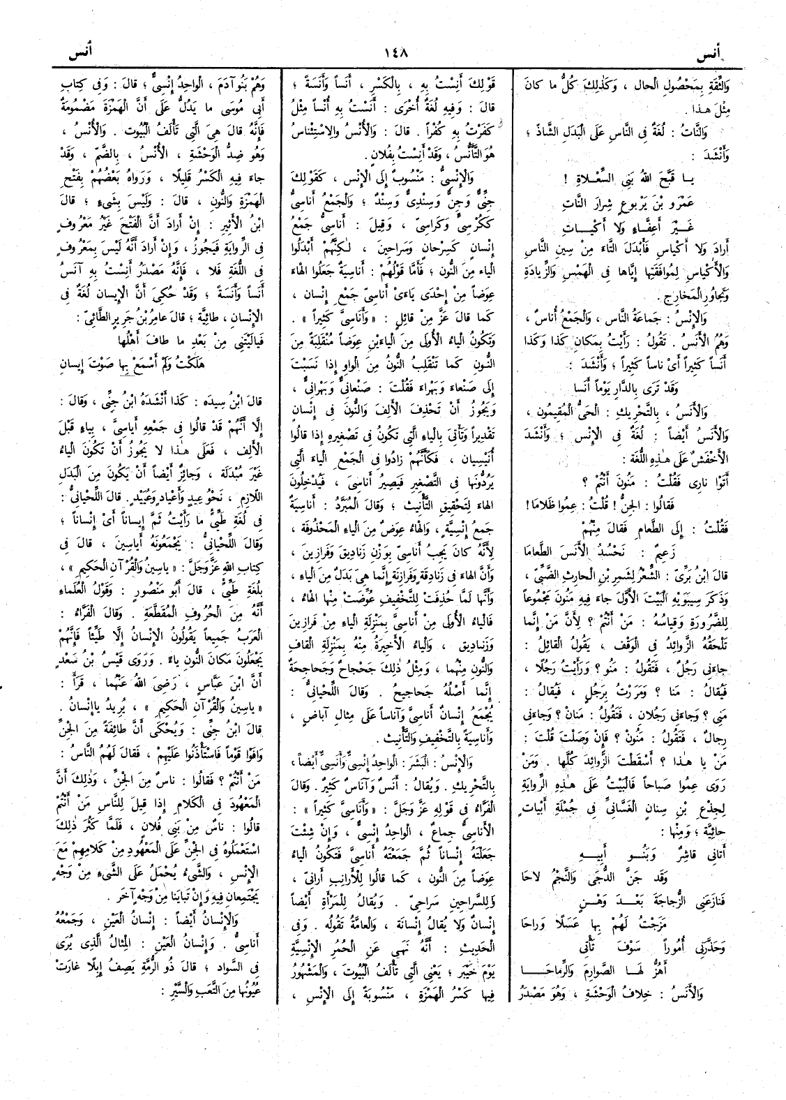 والثقة بمحصول الحال وكذلك كل ما كان مثل هذا والنَّاتُ لغة في الناس على البدل الشاذ وأَنشد يا قَبَّحَ اللَّهُ بني السِّعْلاةِ عَمرو بنَ يَرْبوعٍ شِرارَ الناتِ غيرَ أَعِفَّاءٍ ولا أَكْياتِ أَراد ولا أَكياس فأَبدل التاء من سين الناس والأَكياس لموافقتها إِياها في الهمس والزيادة وتجاور المخارج والإِنْسُ جماعة الناس والجمع أُناسٌ وهم الأَنَسُ تقول رأَيت بمكان كذا وكذا أَنَساً كثيراً أَي ناساً كثيراً وأَنشد وقد تَرى بالدّار يوماً أَنَسا والأَنَسُ بالتحريك الحيُّ المقيمون والأَنَسُ أَيضاً لغة في الإِنْس وأَنشد الأَخفش على هذه اللغة أَتَوْا ناري فقلتُ مَنُونَ أَنتم ؟ فقالوا الجِنُّ قلتُ عِمُوا ظَلاما فقلتُ إِلى الطَّعامِ فقال منهمْ زَعِيمٌ نَحْسُد الأَنَسَ الطَّعاما قال ابن بري الشعر لشمر بن الحرث الضَّبِّي وذكر سيبويه البيت الأَول جاء فيه منون مجموعاً للضرورة وقياسه من أَنتم ؟ لأَن من إِنما تلحقه الزوائد في الوقف يقول القائل جاءَني رجل فتقول مَنُو ؟ ورأَيت رجلاً فيقال مَنا ؟ ومررت برجل فيقال مَني ؟ وجاءني رجلان فتقول مَنانْ ؟ وجاءَني رجال فتقول مَنُونْ ؟ فإِن وصلت قلت مَنْ يا هذا ؟ أَسقطت الزوائد كلها ومن روى عموا صباحاً فالبيت على هذه الرواية لجِذْع بن سنان الغساني في جملة أَبيات حائية ومنها أَتاني قاشِرٌ وبَنُو أَبيه وقد جَنَّ الدُّجى والنجمُ لاحا فنازَعني الزُّجاجَةَ بَعدَ وَهْنٍ مَزَجْتُ لهم بها عَسلاً وراحا وحَذَّرَني أُمُوراً سَوْف تأْتي أَهُزُّ لها الصَّوارِمَ والرِّماحا والأَنَسُ خلاف الوَحْشَةِ وهو مصدر قولك أَنِسْتُ به بالكسر أَنَساً وأَنَسَةً قال وفيه لغة أُخرى أَنَسْتُ به أُنْساً مثل كفرت به كُفْراً قال والأُنْسُ والاستئناس هو التَّأَنُّسُ وقد أَنِسْتُ بفلان والإِنْسِيُّ منسوب إِلى الإِنْس كقولك جَنِّيٌّ وجِنٌ وسِنْدِيٌّ وسِنْدٌ والجمع أَناسِيُّ كَكُرْسِيّ وكَراسِيّ وقيل أَناسِيُّ جمع إِنسان كسِرْحانٍ وسَراحينَ لكنهم أَبدلوا الياء من النون فأَما قولهم أَناسِيَةٌ جعلوا الهاء عوضاً من إِحدى ياءَي أَناسِيّ جمع إِنسان كما قال عز من قائل وأَناسِيَّ كثيراً وتكون الياءُ الأُولى من الياءَين عوضاً منقلبة من النون كما تنقلب النون من الواو إِذا نسبت إِلى صَنْعاءَ وبَهْراءَ فقلت صَنْعانيٌّ وبَهْرانيٌّ ويجوز أَن تحذف الأَلف والنون في إِنسان تقديراً وتأْتي بالياءِ التي تكون في تصغيره إِذا قالوا أُنَيْسِيان فكأَنهم زادوا في الجمع الياء التي يردّونها في التصغير فيصير أَناسِيَ فيدخلون الهاء لتحقيق التأْنيث وقال المبرد أَناسِيَةٌ جمع إِنْسِيَّةٍ والهاء عوض من الياء المحذوفة لأَنه كان يجب أَناسِيٌ بوزن زَناديقَ وفَرازِينَ وأَن الهاء في زَنادِقَة وفَرازِنَة إِنما هي بدل من الياء وأَنها لما حذفت للتخفيف عوّضت منها الهاءُ فالياءُ الأُولى من أَناسِيّ بمنزلة الياءِ من فرازين وزناديق والياء الأَخيرة منه بمنزلة القاف والنون منهما ومثل ذلك جَحْجاحٌ وجَحاجِحَةٌ إِنما أَصله جَحاجيحُ وقال اللحياني يُجْمَع إِنسانٌ أَناسِيَّ وآناساً على مثال آباضٍ وأَناسِيَةً بالتخفيف والتأْنيث والإِنْسُ البشر الواحد إِنْسِيٌّ وأَنَسيٌّ أَيضاً بالتحريك ويقال أَنَسٌ وآناسٌ كثير وقال الفراء في قوله عز وجل وأَناسِيّ كثيراً الأَناسِيُّ جِماعٌ الواحد إِنْسِيٌّ وإِن شئت جعلته إِنساناً ثم جمعته أَناسِيّ فتكون الياءُ عوضاً من النون كما قالوا للأَرانب أَراني وللسَّراحين سَراحِيّ ويقال للمرأَة أَيضاً إِنسانٌ ولا يقال إِنسانة والعامة تقوله وفي الحديث أَنه نهى عن الحُمُر الإِنسيَّة يوم خَيْبَر يعني التي تأْلف البيوت والمشهور فيها كسر الهمزة منسوبة إِلى الإِنس وهم بنو آدم الواحد إِنْسِيٌّ قال وفي كتاب أَبي موسى ما يدل على أَن الهمزة مضمومة فإِنه قال هي التي تأْلف البيوت والأُنْسُ وهو ضد الوحشة الأُنْسُ بالضم وقد جاءَ فيه الكسر قليلاً ورواه بعضهم بفتح الهم