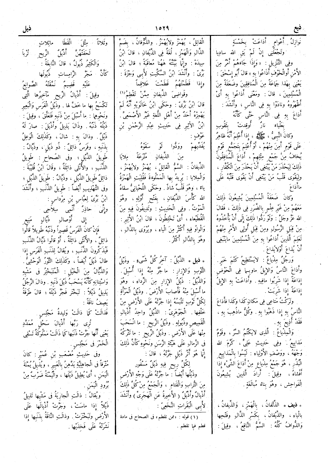 وقيل أَذْيالُ الرِّيح مآخِيرها التي تُكْسَحُ بها ما خَفَّ لها وذَيْلُ الفرس والبعير ونحوهما ما أَسْبَلَ من ذَنَبه فتَعَلَّق وقيل ذَيْلُه ذنبه وذَالَ يَذِيل وأَذْيَل صار له ذيْلٌ وذالَ به شالَ وكذلك الوعِلُ بذنَبه وفرس ذائلٌ ذو ذَيْلٍ وذَيَّال طويل الذَّيل وفي الصحاح طويل الذنب والأُنثى ذائلة وقال ابن قتيبة ذائل طويل الذَّيل وذَيَّالٌ طويل الذيل وفي التهذيب أَيضاً طويل الذنب وأَنشد ابن بري لعباس بن مِرْداس وإِني حاذِرٌ أَنْمِي سلاحِي إِلى أَوْصالِ ذَيَّالٍ مَنيع فإِن كان الفرس قصيراً وذنبه طويلاً قالوا ذائل والأُنثى ذائلة أَو قالوا ذَيَّالُ الذنب فيذكرون الذنب ويقال لذنب الفرس إِذا طال ذَيل أَيضاً وكذلك الثور الوحشي والذَّيَّال من الخيلِ المُتَبَختِر في مَشْيه واسْتِنانه كأَنه يَسْحَب ذَيْلَ ذنَبه وذالَ الرجل يَذِيل ذَيْلاً تَبَخَترَ فجرَّ ذَيْله قال طرفة يصف ناقة فَذَالَتْ كما ذالَتْ وَليدةُ مَجْلِسٍ تُرِي رَبَّها أَذْيالَ سَحْلٍ مُمَدَّد يعني أَنها جَرَّت ذنبها كما ذالت مملوكة تسقي الخمر في مجلس وفي حديث مصعب بن عمير كان مترفاً في الجاهلية يدَّهن بالعَبِير ويُذِيلُ يُمْنَة اليَمَن أَي يُطيل ذَيْلها واليُمنة ضرب من برود اليمن ويقال ذات الجارية في مَشْيها تَذِيل ذَيْلاً إِذا ماسَت وجَرَّت أَذيالها على الأَرض وتبخترت وذالت الناقةُ بذنبها إِذا نشَرتْه على فخذيها