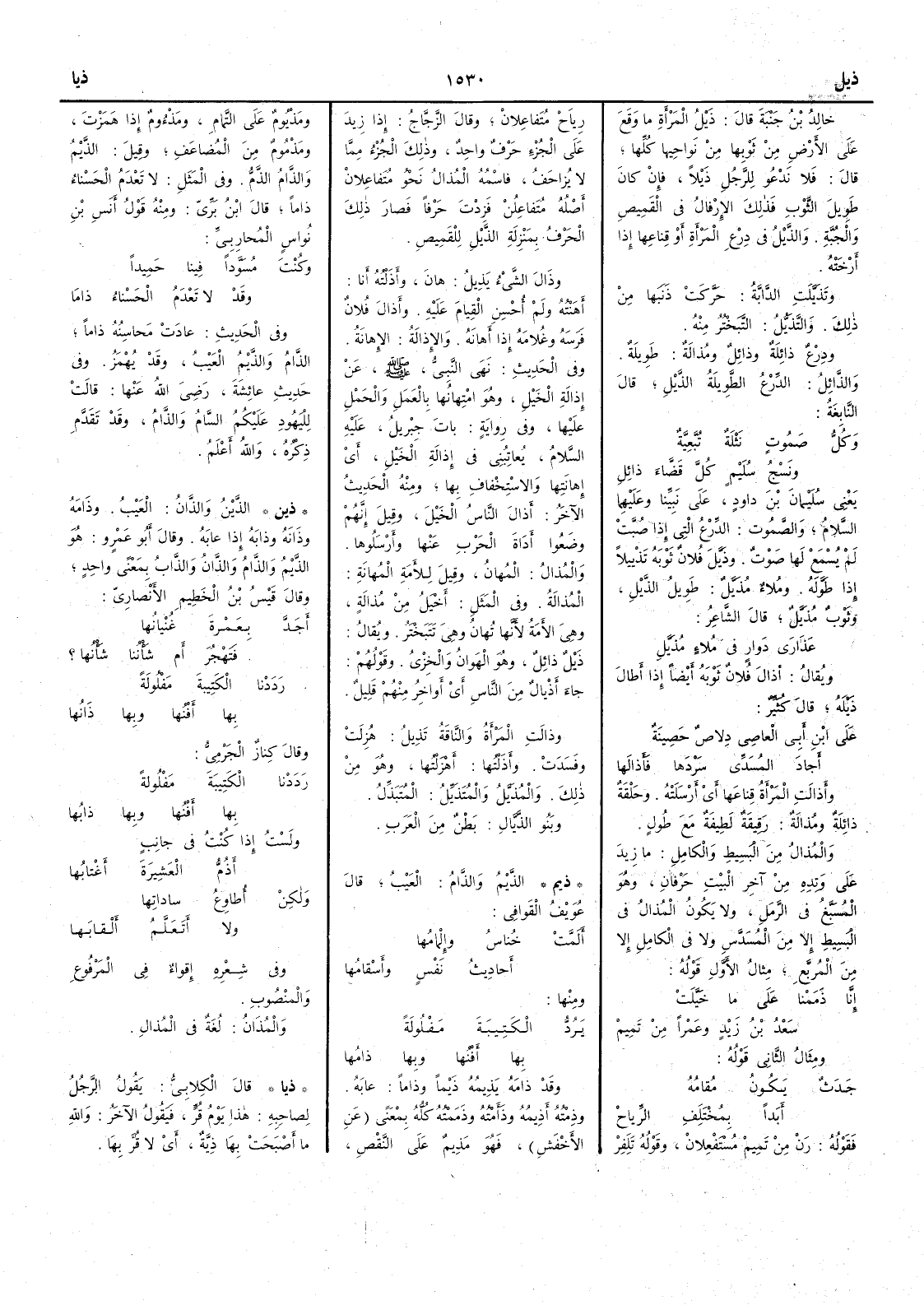ويقال أَذالَ فلان ثوبه أَيضاً إِذا أَطالَ ذَيْله قال كثيِّر على ابن أَبي العاصي دلاصٌ حَصِينةٌ أَجادَ المُسَدِّي سَرْدَها فأَذالَها وأَذالَت المرأَةُ قِناعَها أَي أَرْسَلَتْه وحَلْقة ذائلة ومُذالة رَقيقة لطيفة مع طُول والمُذالُ من البسيط والكامل ما زِيدَ على وتِده من آخر البيت حرفان وهو المُسَبّغ في الرَّمَل ولا يكون المُذال في البسيط إِلاَّ من المُسَدّس ولا في الكامل إِلاَّ من المربع مثال الأَول قوله إِنَّا ذَمَمْنا على ما خَيَّلَتْ سَعْدُ بنُ زيدٍ وعَمْراً من تَمِيمْ ومثال الثاني قوله جَدَثٌ يكونُ مُقامُه أَبَداً بمُخْتَلَِفِ الرِّياحْ فقوله رَنْ من تميمْ مستفعلان وقوله تَلَِفِرْ رِياحْ مُتَفاعلان وقال الزجاج إِذا زيد على الجزء حرف واحد وذلك الجزء مما لا يُزاحَف فاسمه المُذال نحو متفاعلان أَصله متفاعلن فزدت حرفاً فصار ذلك الحرف بمنزلة الذَّيْل للقميص وذَال الشيءُ يَذيلُ هانَ وأَذَلْته أَنا أَهَنْته ولم أُحْسِن القِيام عليه وأَذَالَ فلان فرسه وغلامه إِذا أهانَه والإِذالةُ الإِهانة وفي الحديث نهى النبي صلى الله عليه وسلم عن إِذالة الخيل وهو امْتِهانُها بالعمل والحملِ عليها وفي رواية باتَ جبريل عليه السلام يعاتبني في إِذالة الخيل أَي إِهانَتِها والاسْتِخْفاف بها ومنه الحديث الآخر أَذالَ الناسُ الخيلَ وقيل إِنهم وضَعُوا أَدَاة الحرب عنها وأَرسلوها والمُذالُ المُهانُ وقيل للأَمَة المُهانةِ المُذالةُ وفي المثل أَخْيَلُ من مُذالةٍ وهي الأَمَة لأَنها تُهان وهي تَتَبَخْتَر ويقال ذَيْل ذائل وهو الهَوان والخِزْيُ وقولهم جاء أَذْيالٌ من الناس أَي أَواخِرُ منهم قليل وذالَت المرأَةُ والناقةُ تَذِيل هُزِلت وفسدت وأَذَلْتها أَهْزَلْتها وهو من ذلك والمُذَيَّلُ والمُتَذَيّلُ المُتَبَذِّلُ وبنو الذَّيّال بطن من العرب