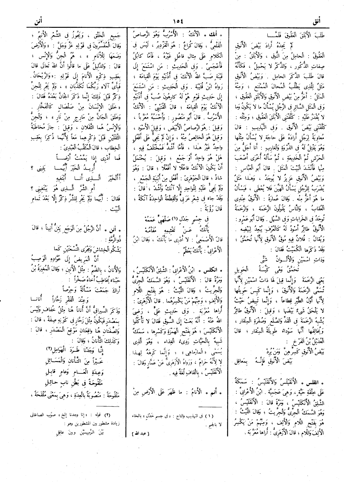 ( أنم ) الأنامُ ما ظهر على الأرض من جميع الخَلْق ويجوز في الشِّعْر الأَنِيمُ وقال المفسرون في قوله عز وجل والأرضَ وَضَعَها لِلأَنام همُ الجِنُّ والإنْس قال والدليلُ على ما قالوا أَنَّ الله تعالى قال بعَقِبِ ذِكْره الأنامَ إلى قوله والرَّيْحان فَبِأَيِّ آلاءِ رَبِّكُما تُكَذِّبان ولم يَجْرِ للجنِّ ذِكْر قبلَ ذلك إنما ذَكَر الجانَّ بعده فقال خَلَق الإنْسانَ من صَلْصالٍ كالفَخَّار وخَلَق الجانَّ من مارجٍ من نارٍ والجِنُّ والإنسُ هُما الثَّقَلان وقيل جاز مُخاطَبَةُ الثَّقَلَيْن قبل ذِكْرِهِما معاً لأنها ذكرا بِعَقِب الخِطاب قال المُثَقَّب العَبْدي فما أَدْرِي إذا يَمَّمْتُ أَرْضاً أُرِيدُ الخَيْرَ أَيُّهما يَلِيني ؟ أَأَلخَيْر الذي أنا أَبْتَغيهِ أمِ الشَّر الذي هو يَبْتَغِيني ؟ فقال أَيُهما ولم يَجْر للشرّ ذكر إلا بعد تَمام البيت