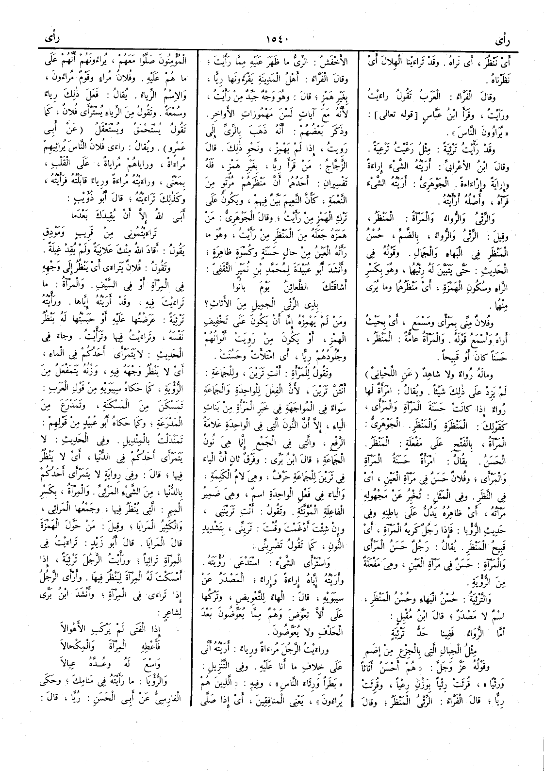 أَي نَنْظُر أَي نراهُ وقد تَراءَيْنا الهِلالَ أَي نظرْناه وقال الفراء العرب تقول راءَيْتُ ورأَيْتُ وقرأَ ابن عباس يُرَاوُون الناس وقد رأَيْتُ تَرْئِيَةً مثل رَعَّيْت تَرْعِيَةً وقال ابن الأَعرابي أَرَيْتُه الشيءَ إراءةً وإرايَةً وإرءَاءَةً الجوهري أَرَيْتُه الشيءَ فرآهُ وأَصله أَرْأَيْتُه والرِّئْيُ والرُّواءُ والمَرْآةُ المَنْظَر وقيل الرِّئْيُ والرُّواءُ بالضم حُسْنُ المَنْظر في البَهاء والجَمال وقوله في الحديث حتى يتَبيَّنَ له رئيْهُما وهو بكسر الراء وسكون الهمزة أَي مَنْظَرُهُما وما يُرَى منهما وفلان مِنِّي بمَرْأىً ومَسْمَعٍ أَي بحيث أَراهُ وأَسْمَعُ قولَه والمَرْآةُ عامَّةً المَنْظَرُ حَسَناً كان أَو قَبِيحاً وما لهُ رُواءٌ ولا شاهِدٌ عن اللحياني لم يَزِدْ على ذلك شيئاً ويقال امرأَةٌ لها رُواءٌ إذا كانت حَسَنةَ المَرْآةِ والمَرْأَى كقولك المَنْظَرَة والمَنْظر الجوهري المَرْآةُ بالفتح على مَفْعَلةٍ المَنْظر الحَسن يقال امرأَةٌ حَسَنةُ المَرْآةِ والمَرْأَى وفلان حسنٌ في مَرْآةِ العَين أَي في النَّظَرِ وفي المَثل تُخْبِرُ عن مَجْهولِه مَرْآتُه أَي ظاهرُه يدلُّ على باطِنِه وفي حديث الرُّؤْيا فإذا رجلٌ كَرِيهُ المَرْآةِ أَي قَبِيحُ المَنْظرِ يقال رجل حَسَنُ المَرْأَى والمَرْآةِ حسن في مَرْآةِ العين وهي مَفْعَلة من الرؤية والتَّرْئِيَةُ حُسْنُ البَهاء وحُسْنُ المنظرِ اسم لا مصدر قال ابن مقبل أَمَّا الرُّواءُ ففِينا حَدُّ تَرْئِيَةٍ مِثل الجِبالِ التي بالجِزْعِ منْ إضَمِ وقوله عز وجل هم أَحسن أَثاثاً ورِئْياً قرئت رِئْياً بوزن رِعْياً وقرئت رِيّاً قال الفراء الرِّئْيُ المَنْظَر وقال الأَخفش الرِّيُّ ما ظَهَر عليه مما رأَيْت وقال الفراء أَهْلُ المدينة يَقْرؤُونها رِيّاً بغير همز قال وهو وجه جيد من رأَيْت لأَنَّه مع آياتٍ لَسْنَ مهموزاتِ الأَواخِر وذكر بعضهم أَنَّه ذهب بالرِّيِّ إلى رَوِيت إذا لم يهمز ونحو ذلك قال الزجاج من قرأَ رِيّاً بغير همز فله تفسيران أَحدهما أَن مَنْظَرهُم مُرْتَوٍ من النِّعْمة كأَن النَّعِيم بِّيِّنٌ فيهم ويكون على ترك الهمز من رأَيت وقال الجوهري من همزه جعله من المنظر من رأَيت وهو ما رأَتْهُ العين من حالٍ حسَنة وكسوة ظاهرة وأَنشد أَبو عبيدة لمحمد بن نُمَير الثقفي أَشاقَتْكَ الظَّعائِنُ يومَ بانُوا بذي الرِّئْيِ الجمِيلِ منَ الأَثاثِ ؟ ومن لم يهمزه إما أَن يكون على تخفيف الهمز أَو يكون من رَوِيَتْ أَلْوانهم وجلودهم رِيّاً أَي امْتَلأَتْ وحَسُنَتْ وتقول للمرأَة أَنتِ تَرَيْنَ وللجماعة أَنْتُنَّ تَرَيْنَ لأَن الفعل للواحدة والجماعة سواء في المواجهة في خَبَرِ المرأَةِ من بنَاتِ الياء إلا أَن النون التي في الواحدة علامة الرفع والتي في الجمع إنما هي نون الجماعة قال ابن بري وفرق ثان أَن الياءَ في تَرَيْن للجماعة حرف وهي لام الكلمة والياء في فعل الواحدة اسم وهي ضمير الفاعلة المؤنثة وتقول أَنْتِ تَرَيْنَني وإن شئت أَدغمت وقلت تَرَيِنِّي بتشديد النون كما تقول تَضْرِبِنِّي واسْتَرْأَى الشيءَ اسْتَدْعَى رُؤيَتَه وأَرَيْتُه إياه إراءَةً وإراءً المصدر عن سيبويه قال الهاء للتعويض وتركها على أَن لا تعوَّض وَهْمٌ مما يُعَوِّضُونَ بعد الحذف ولا يُعَوِّضون وراءَيْت الرجلَ مُراآةً ورِياءً أَرَيْته أَنِّي على خلاف ما أَنا عليه وفي التنزيل بَطَراً ورِئاءَ الناسِ وفيه الذين هُمْ يُراؤونَ يعني المنافقين أَي إذا صَلَّى المؤمنون صَلَّوا معَهم يُراؤُونهُم أَنَّهم على ما هم عليه وفلان مُراءٍ وقومٌ مُراؤُونَ والإسم الرِّياءُ يقال فَعَلَ ذلك رِياءً وسُمْعَةً وتقول من الرِّياء يُسْتَرْأَى فلانٌ كما تقول يُسْتَحْمَقُ ويُسْتَعْقَلُ عن أَبي عمرو ويقال راءَى فلان الناسَ يُرائِيهِمْ مُراآةً وراياهم مُراياةً على القَلْب بمعنىً وراءَيْته مُراآةً ورياءً قابَلْته فرَأَيْته وكذلك تَرَاءَيْته قال أَبو ذؤيب أَ