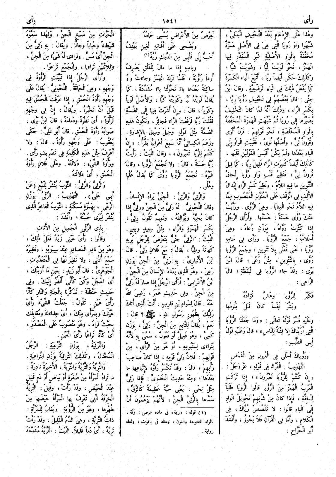 وبابٍ إِذا ما مالَ للغَلْقِ يَصْرِفُ أَراد رُؤْيةً فلما ترك الهمز وجاءت واو ساكنة بعدها ياء تحولتا ياء مشددة كما يقال لَوَيْتُه لَيّاً وكَوَيْتُه كَيّاً والأَصل لَوْياً وكَوْياً قال وإِن أَشرتَ فيها إِلى الضمة فقلت رُيَّا فرفعت الراء فجائز وتكون هذه الضمة مثل قوله وحُيِلَ وسُيِق بالإِشارة وزعم الكسائي أَنه سمع أَعربيّاً يقرأ إِن كنتم للرُّيَّا تَعْبُرون وقال الليث رأَيتُ رُيَّا حَسَنة قال ولا تُجْمَعُ الرُّؤْيا وقال غيره تجمع الرُّؤْيا رُؤىً كما يقال عُلْياً وعُلىً والرَّئِيُّ والرِّئِيُّ الجِنِّيُّ يراه الإِنسانُ وقال اللحياني له رَئيٌّ من الجن ورِئِيٌّ إِذا كان يُحِبه ويُؤَالِفُه وتميم تقول رِئِيٌّ بكسر الهمزة والراء مثل سِعيد وبِعِير الليث الرَّئِيُّ جَنِّيّ يتعرض للرجل يُريه كهانة وطِبّاً يقال مع فلان رَئِيُّ قال ابن الأَنباري به رَئِيٌّ من الجن بوزن رَعِيّ وهو الذي يعتاد الإِنسان من الجنّ ابن الأَعرابي أَرْأَى الرجلُ إِذا صار له رَئِيٌّ من الجنّ وفي حديث عمر رضي الله عنه قال لِسَوادِ بنِ قارِبٍ أَنتَ الذي أَتاكَ رَئِيُّكَ بِظُهور رسولِ الله صلى الله عليه وسلم ؟ قال نَعَمْ يقال للتابع من الجن رَئِيٌّ بوزن كَمِيٍّ وهو فَعِيلٌ أَو فَعُولٌ سُمِّي به لأَنه يَتَراءى لمَتْبوعه أَو هو من الرَّأْيِ من قولهم فلانٌ رَئِيُّ قومِهِ إِذا كان صاحب رأْيِهِم قال وقد تكسر راؤه لاتباعها ما بعدها ومنه حديث الخُدْري فإِذا رَئِيٌّ مثل نحْيٍ يعني حية عظِيمَةً كالزِّقِّ سمّاها بالرَّئِيِّ الجِنِّ لأَنهم يزعمون أَن الحيَّاتِ من مَسْخِ الجِنِّ ولهذا سموه شيطاناً وحُباباً وجانّاً ويقال به رَئِيٌّ من الجنّ أَي مَسٌّ وتَراءى له شيء من الجن وللاثنين تراءيا وللجمع تَراءَوْا وأَرْأَى الرجلُ إِذا تَبَّيَنت الرَّأْوَة في وجْهِه وهي الحَماقة اللحياني يقال على وجهه رَأْوَةُ الحُمْقِ إِذا عَرَفْت الحُمْق فيه قبل أَن تَخْبُرَهُ ويقال إِن في وجهه لرَأْوَةً أَي نَظْرَة ودَمامَةً قال ابن بري صوابه رَأْوَةَ الحُمْقِ قال أَبو علي حكى يعقوب على وجهه رَأْوَةٌ قال ولا أَعرف مثلَ هذه الكلمة في تصريف رَأْى ورَأْوَةُ الشيء دلالَتُه وعلى فُلان رَأْوَةُ الحُمْقِ أَي دَلالَته والرَّئِيُّ والرِّئِيُّ الثوب يُنْشَر للبَيْع عن أَبي عليّ التهذيب الرِّئْيُ بوزن الرِّعْيِ بهمزة مسَكَّنَةٍ الثوبُ الفاخر الذي يُنشَر ليُرى حُسْنُه وأَنشد بِذِي الرِّئْيِ الجَميلِ من الأَثاثِ وقالوا رَأْيَ عَيْني زيدٌ فَعَلَ ذلك وهو من نادِرِ المصادِرِ عند سيبويه ونظيره سَمْعَ أُذُنِي ولا نظير لهما في المُتَعَدِّيات الجوهري قال أَبو زيد بعينٍ مَا أَرَيَنَّكَ أَي اعْجَلْ وكُنْ كأَنِّي أَنْظُر إِلَيْكَ وفي حديث حنَظلة تُذَكِّرُنا بالجَنَّةِ والنَّارِ كأَنَّا رَأْيَ عَيْنٍ تقول جعلتُ الشَّيْءَ رَأْيَ عَيْنِك وبمَرْأَىً مِنْكَ أَي حِذاءَكَ ومُقابِلَك بحيث تراه وهو منصوب على المصدر أَي كأَنَّا نراهُما رَأْيَ العَيْنِ والتَّرْئِيَةُ بوزن التَّرْعِيةِ الرجلُ المُخْتال وكذلك التَّرائِيَة بوزْنِ التَّراعِيَة والتَّرِيَّة والتَّرِّيَّة والتَّرْيَة الأَخيرة نادرة ما تراه المرأَة من صُفْرةٍ أَو بَياضٍ أَو دمٍ قليلٍ عند الحيض وقد رَأَتْ وقيل التَّرِيَّة الخِرْقَة التي تَعَْرِفُ بها المرأَةُ حَيْضَها من طهرها وهو من الرُّؤْيَةِ ويقال للمَرْأَةِ ذاتُ التَّرِيَّةِ وهي الدم القليل وقد رَأَتْ تَرِيَّةً أَي دَماً قليلاً الليث التَّرِّيَّة مشدَّدة