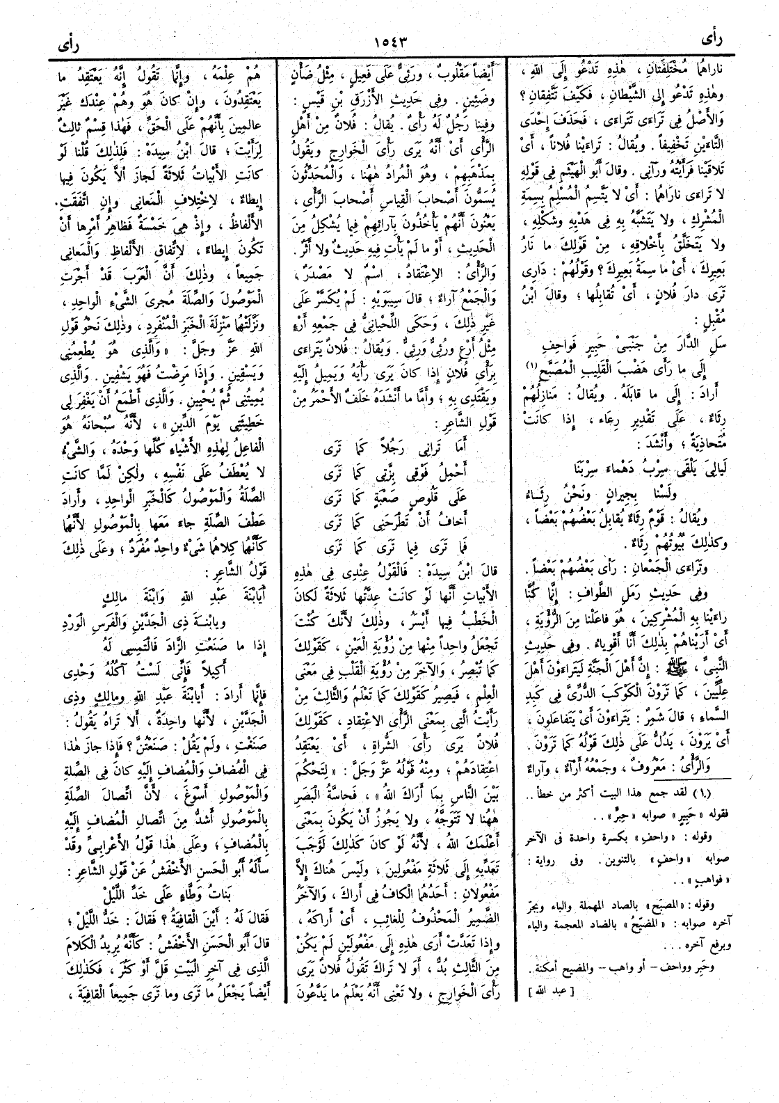 يقول ناراهما مُخْتَلِفتانِ هذه تَدْعو إِلى الله وهذه تدعو إِلى الشيطان فكيف تَتَّفِقانِ ؟ والأَصل في تَراءَى تَتَراءَى فحذف إِحدى التاءين تخفيفاً ويقال تَراءَينا فلاناً أَي تَلاقَيْنا فَرَأَيْتُه ورَآني وقال أَبو الهيثم في قوله لا تَراءَى نارَاهُما أَي لا يَتَّسِمُ المُسْلِم بسِمَةِ المُشْرِك ولا يَتَشَبَّه به في هَدْيِه وشَكْلِهِ ولا يَتَخَلّق بأَخْلاقِه من قولك ما نَارُ بَعِيرِكَ أَي ما سِمةُ بعِيرِكَ وقولهم دَارِي تَرَى دارَ فلانٍ أَي تُقابِلُها وقال ابن مقبل سَلِ الدَّار مِنْ جَنْبَيْ حَبِيرٍ فَواحِفِ إِلى ما رأَى هَضْبَ القَلِيبِ المصَبَّحِ أَراد إِلى ما قابَلَه ويقال مَنازِلُهم رِئَاءٌ على تقدير رِعَاء إِذا كانت مُتَحاذِيةً وأَنشد لَيالِيَ يَلْقَى سرْبُ دَهْماء سِرْبَنَا ولَسْنا بِجِيرانٍ ونَحْنُ رِئَاءُ ويقال قَوْمِ رِئَاءٌ يقابلُ بعضُهُم بعضاً وكذلك بُيوتُهُم رِئَاءٌ وتَرَاءَى الجَمْعانِ رَأَى بعضُهُم بعضاً وفي حديث رَمَلِ الطَّوافِ إِنما كُنَّا راءَيْنا به المشركين هو فاعَلْنا من الرُّؤْية أَي أَرَيْناهم بذلك أَنَّا أَقْوِياء وفي حديث النبي صلى الله عليه وسلم إِنَّ أَهلَ الجَنَّةِ ليَتَراءَوْنَ أَهلَ عِلِّيِّين كما تَرَوْنَ الكَوْكَب الدُّرِّيَّ في كَبِدِ السماء قال شمر يتَراءَوْنَ أَي يتَفاعَلون أَي يَرَوْنَ يَدُلُّ على ذلك قولُه كما تَرَوْن والرَّأْيُ معروفٌ وجمعه أَرْآءٌ وآراءٌ أَيضاً مقلوب ورَئِيٌّ على فَعِيل مثل ضَأْنٍ وضَئِينٍ وفي حديث الأَزرق بن قيس وفِينا رجُلٌ له رَأْيٌ يقال فلانٌ من أَهل الرَّأْي أَي أَنه يَرَى رَأْيَ الخوارج ويقول بمَذْهَبِهم وهو المراد ههنا والمُحَدِّثون يُسَمُّون أَصحابَ القياسِ أَصحابَ الرَّأْي يَعْنُون أَنهم يأْخذون بآرائِهِم فيما يُشْكِلُ من الحديث أَو ما لم يَأْتِ فيه حديث ولا أَثَرٌ والرَّأْيُ الاعتِقادُ اسمٌ لا مصدرٌ والجمع آراءٌ قال سيبويه لم يكَسَّر على غير ذلك وحكى اللحياني في جمعه أَرْءٍ مثل أَرْعٍ ورُئِيٌّ ورِئِيُّ ويقال فلان يتَراءَى بِرَأْيِ فلان إِذا كان يَرَى رَأْيَه ويَمِيلُ إِليه ويَقْتَدي به وأَما ما أَنشده خَلَفٌ الأَحمر من قول الشاعر أَما تَراني رَجُلاً كما تَرَى أَحْمِلُ فَوْقي بِزَّنِي كما تَرَى على قَلُوص صعبة كما تَرَى أَخافُ أَن تَطْرَحَني كما تَرَى فما تَرى فيما تَرَى كما تَرَى قال ابن سيده فالقول عندي في هذه الأَبيات أَنها لو كانت عدَّتُها ثلاثة لكان الخطب فيها أَيسر وذلك لأَنك كنت تجعل واحداً منها من رُؤْية العَيْنِ كقولك كما تُبْصِر والآخر من رُؤْية القَلْبِ في معنى العلم فيصير كقولك كما تَعْلم والثالث من رأَيْت التي بمعنى الرَّأْي الاعتقاد كقولك فلان يرَى رَأْي الشُّراةِ أَي يعتَقِدُ اعْتِقادَهم ومنه قوله عز وجل لتَحْكُم بين الناسِ بما أَرَاكَ اللهُ فحاسَّةُ البَصَر ههنا لا تتَوَجَّه ولا يجوز أَن يكون بمعنى أَعْلَمَك الله لأَنه لو كان كذلك لوَجَب تعدِّيه إِلى ثلاثة مَفْعولِين وليس هناك إِلا مفعولان أَحدهما الكاف في أَراك والآخر الضمير المحذوف للغائب أَي أَراكَه وإِذا تعدَّت أَرى هذه إلى مفعولين لم يكن من الثالث بُدُّ أَوَلا تَراكَ تقول فلان يَرَى رأْيَ الخوارج ولا تَعْني أَنه يعلم ما يَدَّعون هُمْ عِلْمَه وإِنما تقول إِنه يعتقد ما يعتقدون وإِن كان هو وهم عندك غير عالمين بأَنهم على الحق فهذا قسم ثالث لرأَيت قال ابن سيده فلذلك قلنا لو كانت الأَبيات ثلاثة لجاز أَن لا يكون فيها إِيطاء لاختلاف المعاني وإِن اتفقت الأَلفاظ وإِذْ هِي خمسة فظاهر أَمرها أَن تكون إِيطاء لاتفاق الأَلفاظ والمعاني جميعاً وذلك أَن العرب قد أَجرت الموصول والصلة مُجْرى الشيء الواحد ونَزَّلَتْهما منزلة الخبر المنفرد وذلك نحو قول الله عز وجل الذي هو يُطْعِمُني ويَسْقِينِ وإِذا مَرِضْتُ فهُو يَشْفِينِ والذي يُميتُني ثم يُحْيِينِ والذي أَطْمَعُ أَنْ يَغْفِرَ لي خطيئَت