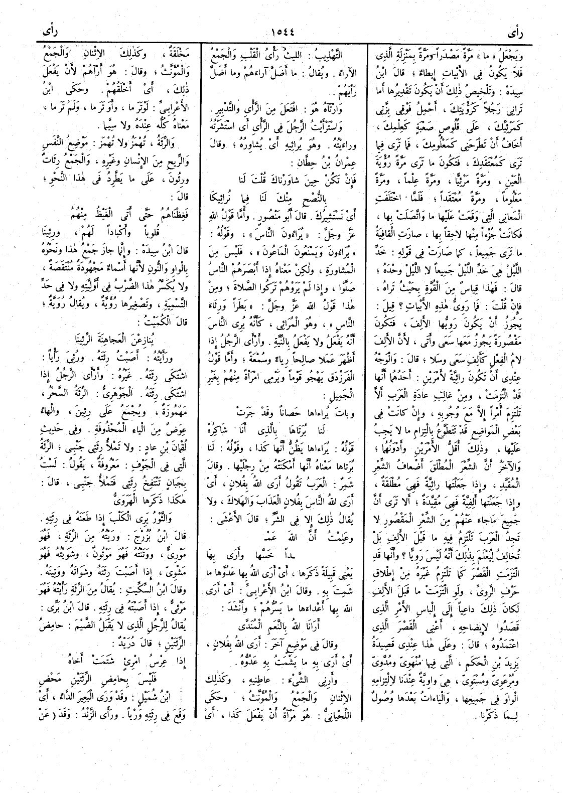 ويجعل ما مَرَّةً مصدراً ومرة بمنزلة الذي فلا يكون في الأَبيات إِيطاء قال ابن سيده وتلخيص ذلك أَن يكون تقديرها أَما تراني رجلاً كُرؤْيَتِك أَحمل فوقي بزتي كمَرْئِيِّك على قلوص صعبة كعِلْمِكَ أَخاف أَن تطرحني كمَعْلُومك فما ترى فيما ترى كمُعْتَقَدِك فتكون ما ترى مرة رؤية العين ومرة مَرْئِيّاً ومرة عِلْماً ومرة مَعلوماً ومرة مُعْتَقَداً فلما اختلفت المعاني التي وقعت عليها ما واتصلت بها فكانت جزءاً منها لاحقاً بها صارت القافية وما ترى جميعاً كما صارت في قوله خدّ الليل هي خدّ الليل جميعاً لا الليل وحده قال فهذا قياس من القوّة بحيث تراه فإِن قلت فما رويّ هذه الأَبيات ؟ قيل يجوز أَن يكون رَوّيها الأَلفَ فتكون مقصورة يجوز معها سَعَى وأتى لأَن الأَلف لام الفعل كأَلف سَعَى وسَلا قال والوجه عندي أَن تكون رائِيَّة لأَمرين أَحدهما أَنها قد التُزِمَت ومن غالب عادة العرب أَن لا تلتزم أَمراً إِلا مع وجوبه وإِن كانت في بعض المواضع قد تتَطوَّع بالتزام ما لا يجب عليها وذلك أَقل الأَمرين وأَدْوَنُهما والآخر أَن الشعر المطلق أَضعاف الشعر المقيد وإِذا جعلتها رائية فهي مُطْلقة وإذا جعلتها أَلِفِيَّة فهي مقيدة أَلا ترى أَن جميع ما جاء عنهم من الشعر المقصور لا تجد العرب تلتزم فيه ما قبل الأَلف بل تخالف ليعلم بذلك أَنه ليس رَوِيّاً ؟ وأَنها قد التزمت القصر كما تلتزم غيره من إِطلاق حرف الروي ولو التزمت ما قبل الأَلف لكان ذلك داعياً إِلى إِلْباس الأَمر الذي قصدوا لإِيضاحِه أَعني القصرَ الذي اعتمدوه قال وعلى هذا عندي قصيدة يزيدَ بنِ الحَكَم التي فيها مُنْهَوي ومُدَّوي ومُرْعَوي ومُسْتَوي هي واويَّة عندنا لالتزامه الواو في جميعها والياءاتُ بعدها وُصُول لما ذكرنا التهذيب اليث رَأْي ا لقَلْب والجمعُ الآراءُ ويقال ما أَضلَّ آراءَهم وما أَضلَّ رأْيَهُمْ وارْتَآهُ هو افْتَعَل من الرَّأْي والتَّدْبِير واسْتَرْأَيْتُ الرُّجلَ في الرَّأْيِ أَي اسْتَشَرْتُه وراءَيْته وهو يُرائِيهِ أَي يشاوِرُه وقال عمران بن حطَّان فإِن تَكُنْ حين شاوَرْناكَ قُلْتَ لَنا بالنُّصْحِ مِنْكَ لَنَا فِيما نُرائِيكا أَي نستشيرك قال أَبو منصور وأَما قول الله عزَّ وجل يُراؤُونَ الناسَ وقوله يُراؤُونَ ويَمْنَعُون الماعونَ فليس من المشاورة ولكن معناه إِذا أَبْصَرَهُم الناس صَلَّوا وإِذا لم يَرَوْهم تركوا الصلاةَ ومن هذا قول الله عزَّ وجل بَطَراً ورِئَاءَ الناسِ وهو المُرَائِي كأَنه يُرِي الناس أَنه يَفْعَل ولا يَفْعَل بالنية وأَرْأَى الرجلُ إِذا أَظْهَر عملاً صالِحاً رِياءً وسُمْعَة وأَما قول الفرزدق يهجو قوماً ويَرْمِي امرأَة منهم بغير الجَمِيلِ وبات يُراآها حَصاناً وقَدْ جَرَتْ لَنا بُرَتَاهَا بِالَّذِي أَنَا شَاكِرُه قوله يُراآها يظن أَنها كذا وقوله لنا بُرَتاها معناه أَنها أَمكنته من رِجْلَيْها وقال شمر العرب تقول أَرَى اللهُ بفلان أَي أَرَى اللهُ الناسَ بفلان العَذَابَ والهلاكَ ولا يقال ذلك إِلاَّ في الشَّرِّ قال الأَعشى وعَلِمْتُ أَنَّ اللهَ عَمْ داً خَسَّها وأَرَى بِهَا يَعْنِي قبيلة ذكَرَها أَي أَرَى اللهُ بها عَدُوَّها ما شَمِتَ به وقال ابن الأَعرابي أَي أَرَى الله بها أَعداءَها ما يَسُرُّهم وأَنشد أَرَانَا اللهُ بالنَّعَمِ المُنَدَّى وقال في موضع آخر أَرَى اللهُ بفلان أَي أَرَى به ما يَشْمَتُ به عَدُوُّه وأَرِنِي الشَّيءَ عاطِنيهِ وكذلك الاثنان والجمع والمؤَنث وحكى اللحياني هو مَرآةً أَنْ يَفْعَلَ كذا أَي مَخْلَقة وكذلك الاثنان والجمع والمؤَنث قال هو أَرْآهُمْ لأَنْ يَفَعَلَ ذلك أَي أَخْلَقُهُم وحكى ابن الأَعرابي لَوْ تَرَ ما وأَو تَرَ ما ولَمْ تَرَ ما معناه كله عنده ولا سِيَّما والرِّئَة تهمز ولا تهمز مَوْضِع النَّفَس والرِّيحِ من الإِنْسانِ وغيره والجمع رِئَاتٌ ورِئُون على ما يَطّرِد في هذا النحو قال فَغِظْنَاهُمُ حتَّى أَتَى الغَيْظُ مِنْهُمُ قُلوباً وأَكْباداً 
