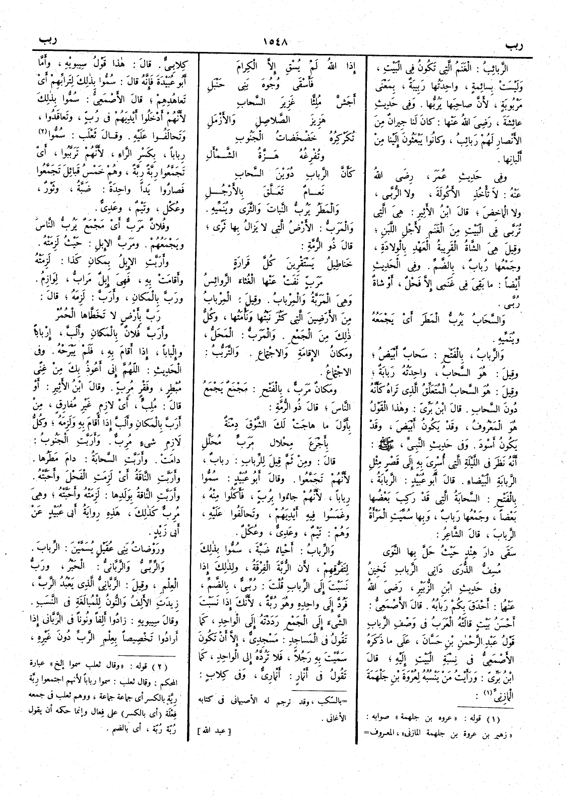 ربب الرَّبُّ هو اللّه عزّ وجل هو رَبُّ كلِّ شيءٍ أَي مالكُه وله وفلان مَرَبٌّ أَي مَجْمعٌ يَرُبُّ الناسَ ويَجْمَعُهم ومَرَبّ الإِبل حيث لَزِمَتْه وأَرَبَّت الإِبلُ بمكان كذا لَزِمَتْه وأَقامَتْ به فهي إِبِلٌ مَرابُّ لَوازِمُ ورَبَّ بالمكان وأَرَبَّ لَزِمَه قال رَبَّ بأَرضٍ لا تَخَطَّاها الحُمُرْ وأَرَبَّ فلان بالمكان وأَلَبَّ إِرْباباً وإِلباباً إِذا أَقامَ به فلم يَبْرَحْه وفي الحديث اللهمّ إِني أَعُوذُ بك من غِنًى مُبْطِرٍ وفَقْرٍ مُرِبٍّ وقال ابن الأَثير أَو قال مُلِبٍّ أَي لازِمٍ غير مُفارِقٍ مِن أَرَبَّ بالمكانِ وأَلَبَّ إِذا أَقامَ به ولَزِمَه وكلّ لازِمِ شيءٍ مُرِبٌّ وأَرَبَّتِ الجَنُوبُ دامَت وأَرَبَّتِ السَّحابةُ دامَ مَطَرُها وأَرَبَّتِ الناقةُ أَي لَزِمَت الفحلَ وأَحَبَّتْه وأَرَبَّتِ الناقةُ بولدها لَزِمَتْه وأَحَبَّتْه وهي مُرِبٌّ كذلك هذه رواية أَبي عبيد عن أَبي زيد ورَوْضاتُ بني عُقَيْلٍ يُسَمَّيْن الرِّبابَ والرِّبِّيُّ والرَّبَّانِيُّ الحَبْرُ ورَبُّ العِلْم وقيل الرَّبَّانِيُّ الذي يَعْبُد الرَّبَّ زِيدت الأَلف والنون للمبالغة في النسب وقال سيبويه زادوا أَلفاً ونوناً في الرَّبَّاني إِذا أَرادوا تخصيصاً بعِلْم الرَّبِّ دون غيره
