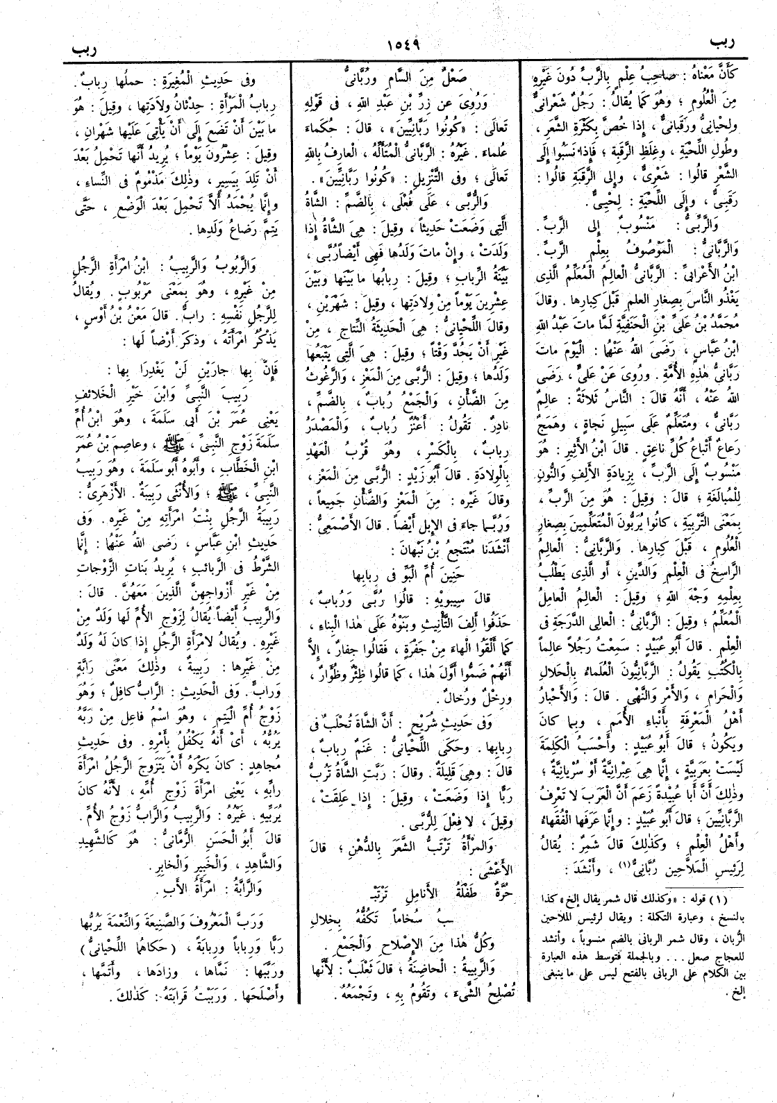 كأَن معناه صاحِبُ عِلم بالرَّبِّ دون غيره من العُلوم وهو كما يقال رجل شَعْرانِيٌّ ولِحْيانِيٌّ ورَقَبانِيٌّ إِذا خُصَّ بكثرة الشعر وطول اللِّحْيَة وغِلَظِ الرَّقبةِ فإِذا [ ص 404 ] نسبوا إِلى الشَّعر قالوا شَعْرِيٌّ وإِلى الرَّقبةِ قالوا رَقَبِيٌّ وإِلى اللِّحْيةِ لِحْيِيٌّ والرَّبِّيُّ منسوب إِلى الرَّبِّ والرَّبَّانِيُّ الموصوف بعلم الرَّبِّ ابن الأَعرابي الرَّبَّانِيُّ العالم المُعَلِّم الذي يَغْذُو الناسَ بِصغارِ العلم قبلَ كِبارها وقال محمد بن عليّ ابن الحنفية لَمّا ماتَ عبدُاللّه بن عباس رضي اللّه عنهما اليومَ ماتَ رَبّانِيُّ هذه الأُمَّة ورُوي عن علي رضي اللّه عنه أَنه قال الناسُ ثلاثةٌ عالِمٌ ربَّانيٌّ ومُتَعَلِّمٌ على سَبيلِ نَجاةٍ وهَمَجٌ رَعاعٌ أَتْباعُ كلِّ ناعق قال ابن الأَثير هو منسوب إِلى الرَّبِّ بزيادة الأَلف والنون للمبالغة قال وقيل هو من الرَّبِّ بمعنى التربيةِ كانوا يُرَبُّونَ المُتَعَلِّمينَ بِصغار العُلوم قبلَ كبارِها والرَّبَّانِيُّ العالم الرَّاسِخُ في العِلم والدين أَو الذي يَطْلُب بِعلْمِه وجهَ اللّهِ وقيل العالِم العامِلُ المُعَلِّمُ وقيل الرَّبَّانِيُّ العالي الدَّرجةِ في العِلمِ قال أَبو عبيد سمعت رجلاً عالماً بالكُتب يقول الرَّبَّانِيُّون العُلَماءُ بالحَلال والحَرام والأَمْرِ والنَّهْي قال والأَحبارُ أَهلُ المعرفة بأَنْباءِ الأُمَم وبما كان ويكون قال أَبو عبيد وأَحْسَب الكلمَة ليست بعربية إِنما هي عِبْرانية أَو سُرْيانية وذلك أَن أَبا عبيدة زعم أَن العرب لا تعرف الرَّبَّانِيّين قال أَبو عبيد وإِنما عَرَفَها الفقهاء وأَهل العلم وكذلك قال شمر يقال لرئيس المَلاَّحِينَ رُبَّانِيٌّ ( 1 )