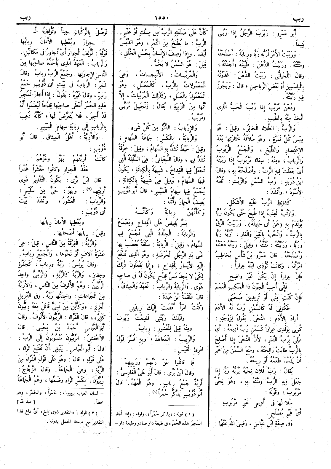 أَرادَ بالأَدَم النُّحْي يقول لزوجته كُوني لوَلدي عِراراً كَسَمْنٍ رُبَّ أَدِيمُه أَي طُلِيَ برُبِّ التمر لأَنَّ النِّحْي إِذا أُصْلِحَ بالرُّبِّ طابَتْ رائحتُه ومَنَعَ السمنَ مِن غير أَن يفْسُد طَعْمُه أَو رِيحُه يقال رَبَّ فلان نِحْيه يَرُبُّه رَبّاً إِذا جَعل فيه الرُّبَّ ومَتَّنه به وهو نِحْيٌ مَرْبُوب وقوله سِلاءَها في أَديمٍ غيرِ مَرْبُوبِ أَي غير مُصْلَحٍ وفي صفة ابن عباس رضي اللّه عنهما كأَنَّ على صَلَعَتِهِ الرُّبَّ من مسْكٍ أَو عَنْبرٍ الرُّبُّ ما يُطْبَخُ من التمر وهو الدِّبْسُ أَيضاً وإِذا وُصِفَ الإِنسانُ بحُسْنِ الخُلُق قيل هو السَّمْنُ لا يَخُمُّ والمُربَّبَاتُ الأَنْبِجاتُ وهي المَعْمُولاتُ بالرُّبِّ كالمُعَسَّلِ وهو المعمول بالعسل وكذلك المُرَبَّياتُ إِلا أَنها من التَّرْبيةِ يقال زنجبيل مُرَبًّى ومُرَبَّبٌ والإِربابُ الدُّنوُّ مِن كل شيءٍ والرِّبابةُ بالكسر جماعةُ السهام وقيل خَيْطٌ تُشَدُّ به السهامُ وقيل خِرْقةٌ تُشَدُّ فيها وقال اللحياني هي السُّلْفةُ التي تُجْعَلُ فيها القِداحُ شبيهة بالكِنانة يكون فيها السهام وقيل هي شبيهة بالكنانةِ يجمع فيها سهامُ المَيْسرِ قال أَبو ذؤَيب يصف الحمار وأُتُنَه