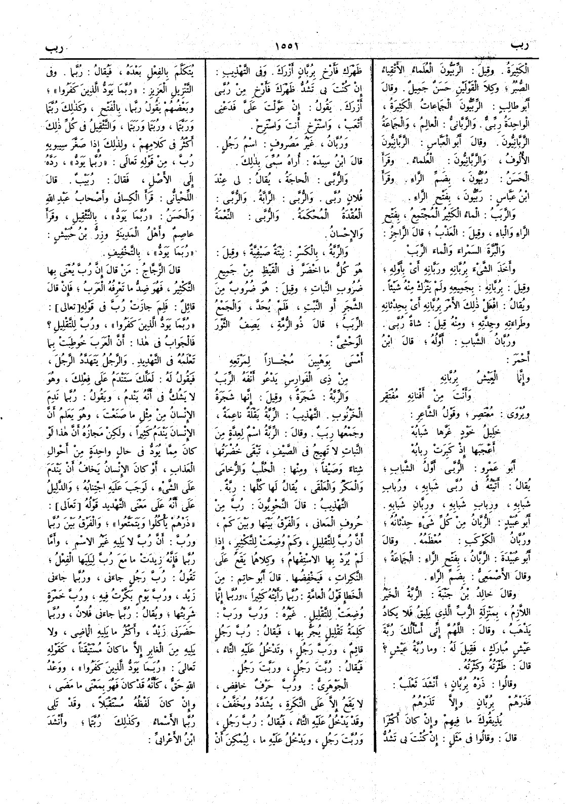 والرِّبَّةُ شجرة وقيل إِنها شجرة الخَرْنُوب التهذيب الرِّبَّةُ بقلة ناعمةٌ وجمعها رِبَبٌ وقال الرِّبَّةُ اسم لِعدَّةٍ من النبات لا تَهِيج في الصيف تَبْقَى خُضْرَتُها شتاءً وصَيْفاً ومنها الحُلَّبُ والرُّخَامَى والمَكْرُ والعَلْقى يقال لها كلها رِبَّةٌ التهذيب قال النحويون رُبَّ مِن حروف المَعاني والفَرْقُ بينها وبين كَمْ أَنَّ رُبَّ للتقليل وكَمْ وُضِعت للتكثير إِذا لم يُرَدْ بها الاسْتِفهام وكلاهما يقع على النَّكِرات فيَخْفِضُها قال أَبو حاتم من الخطإِ قول العامة رُبَّما رأَيتُه كثيراً ورُبَّما إِنما وُضِعَتْ للتقليل غيره ورُبَّ ورَبَّ كلمة تقليل يُجَرُّ بها فيقال رُبَّ رجلٍ قائم ورَبَّ رجُلٍ وتدخل عليه التاء فيقال رُبَّتَ رجل ورَبَّتَ رجل الجوهري ورُبَّ حرفٌ خافض لا يقع إِلاَّ على النكرة يشدَّد ويخفف وقد يدخل عليه التاء فيقال رُبَّ رجل ورُبَّتَ رجل ويدخل عليه ما ليُمْكِن أَن يُتَكَلَّم بالفعل بعده فيقال رُبما وفي التنزيل العزيز رُبَّما يَوَدُّ الذين كفروا وبعضهم يقول رَبَّما بالفتح وكذلك رُبَّتَما ورَبَّتَما ورُبَتَما وَرَبَتَما والتثقيل في كل ذلك أَكثر في كلامهم ولذلك إِذا صَغَّر سيبويه رُبَّ من قوله تعالى رُبَّما يودّ ردَّه إِلى الأَصل فقال رُبَيْبٌ قال اللحياني قرأَ الكسائي وأَصحاب عبداللّه والحسن رُبَّما يودُّ بالتثقيل وقرأَ عاصِمٌ وأَهلُ المدينة وزِرُّ بن حُبَيْش رُبَما يَوَدُّ بالتخفيف قال الزجاج من قال إِنَّ رُبَّ يُعنى بها التكثير فهو ضِدُّ ما تَعرِفه العرب فإِن قال قائل فلمَ جازت رُبَّ في قوله ربما يود الذين كفروا ورب للتقليل ؟ فالجواب في هذا أَن العرب خوطبت بما تعلمه في التهديد والرجل يَتَهَدَّدُ الرجل فيقول له لَعَلَّكَ سَتَنْدَم على فِعْلِكَ وهو لا يشك في أَنه يَنْدَمُ ويقول رُبَّما نَدِمَ الإِنسانُ مِن مِثْلِ ما صَنَعْتَ وهو يَعلم أَنَّ الإِنسان يَنْدَمُ كثيراً ولكنْ مَجازُه أَنَّ هذا لو كان مِمَّا يُوَدُّ في حال واحدة من أَحوال العذاب أَو كان الإِنسان يخاف أَن يَنْدَمَ على الشيءِ لوجَبَ عليه اجْتِنابُه والدليل على أَنه على معنى التهديد قوله ذَرْهُم يأْكُلُوا ويَتَمَتَّعُوا والفرق بين رُبَّما ورُبَّ أَن رُبَّ لا يليه غير الاسم وأَما رُبَّما فإِنه زيدت ما مع رب ليَلِيَها الفِعْلُ تقول رُبَّ رَجُلٍ جاءَني وربما جاءَني زيد ورُبَّ يوم بَكَّرْتُ فيه ورُبَّ خَمْرةٍ شَرِبْتُها ويقال ربما جاءَني فلان وربما حَضَرني زيد وأَكثرُ ما يليه الماضي ولا يَلِيه مِن الغابرِ إِلاَّ ما كان مُسْتَيْقَناً كقوله تعالى رُبَما يَوَدُّ الذين كفروا ووَعْدُ اللّهِ حَقٌّ كأَنه قد كان فهو بمعنى ما مَضَى وإِن كان لفظه مُسْتَقْبَلاً وقد تَلي ربما الأَسماءَ وكذلك ربتما وأَنشد ابن الأَعرابي